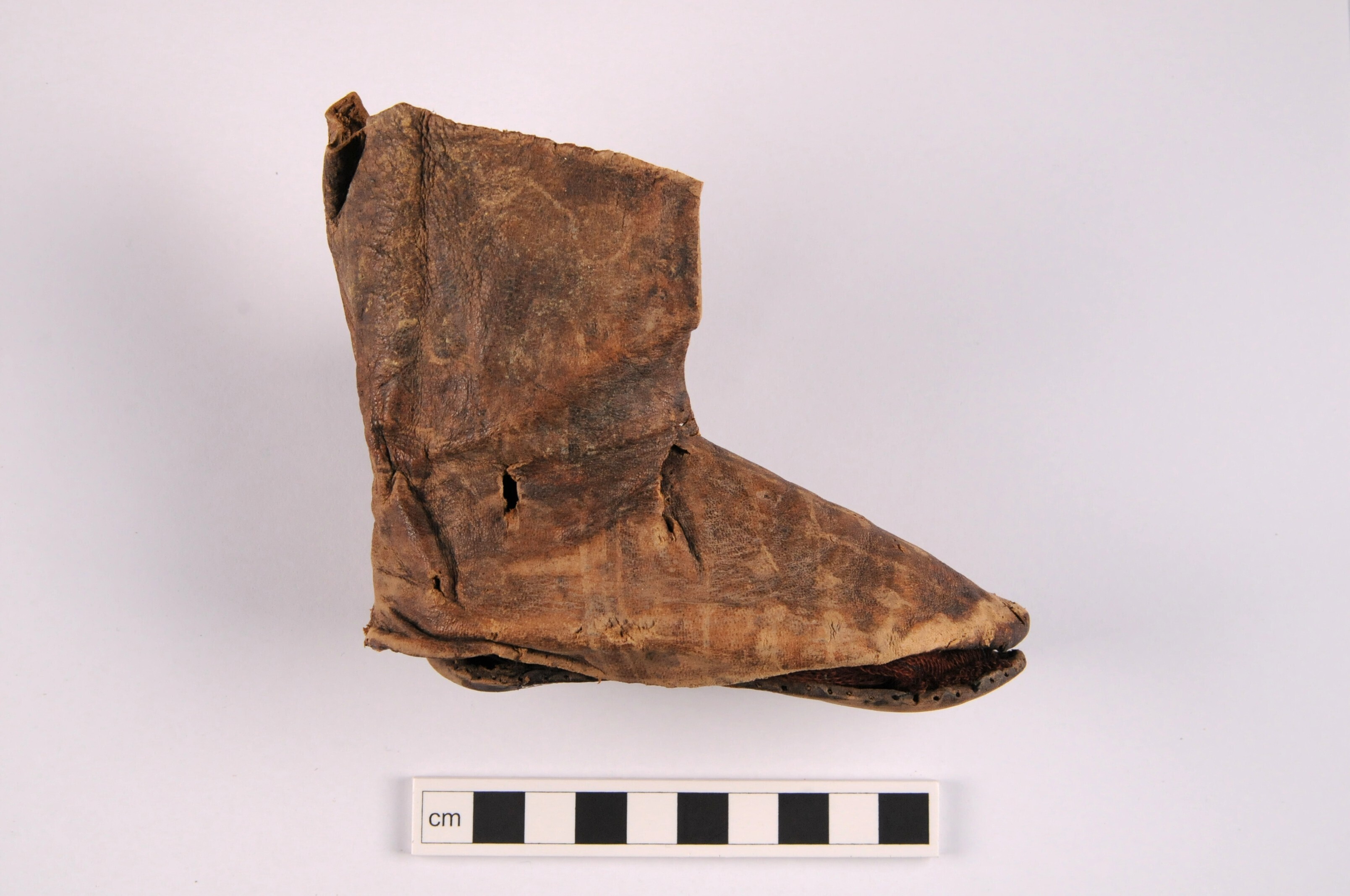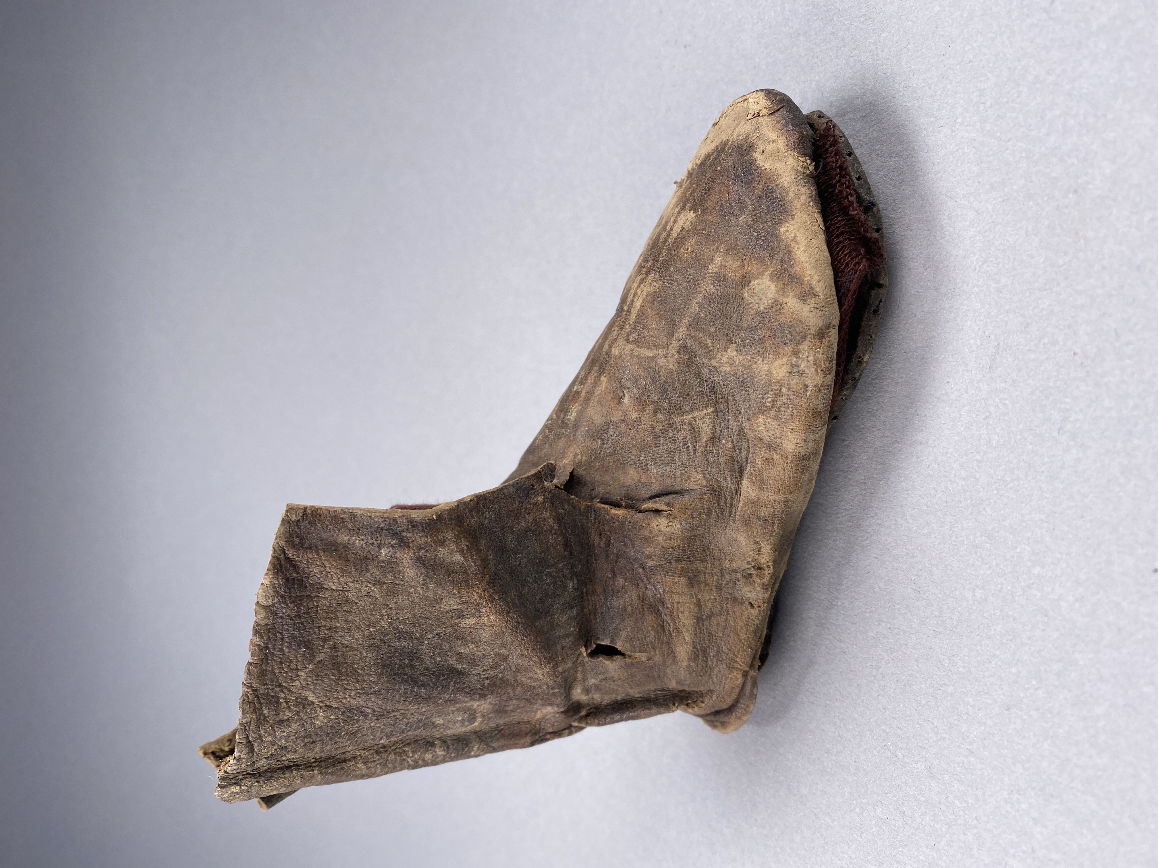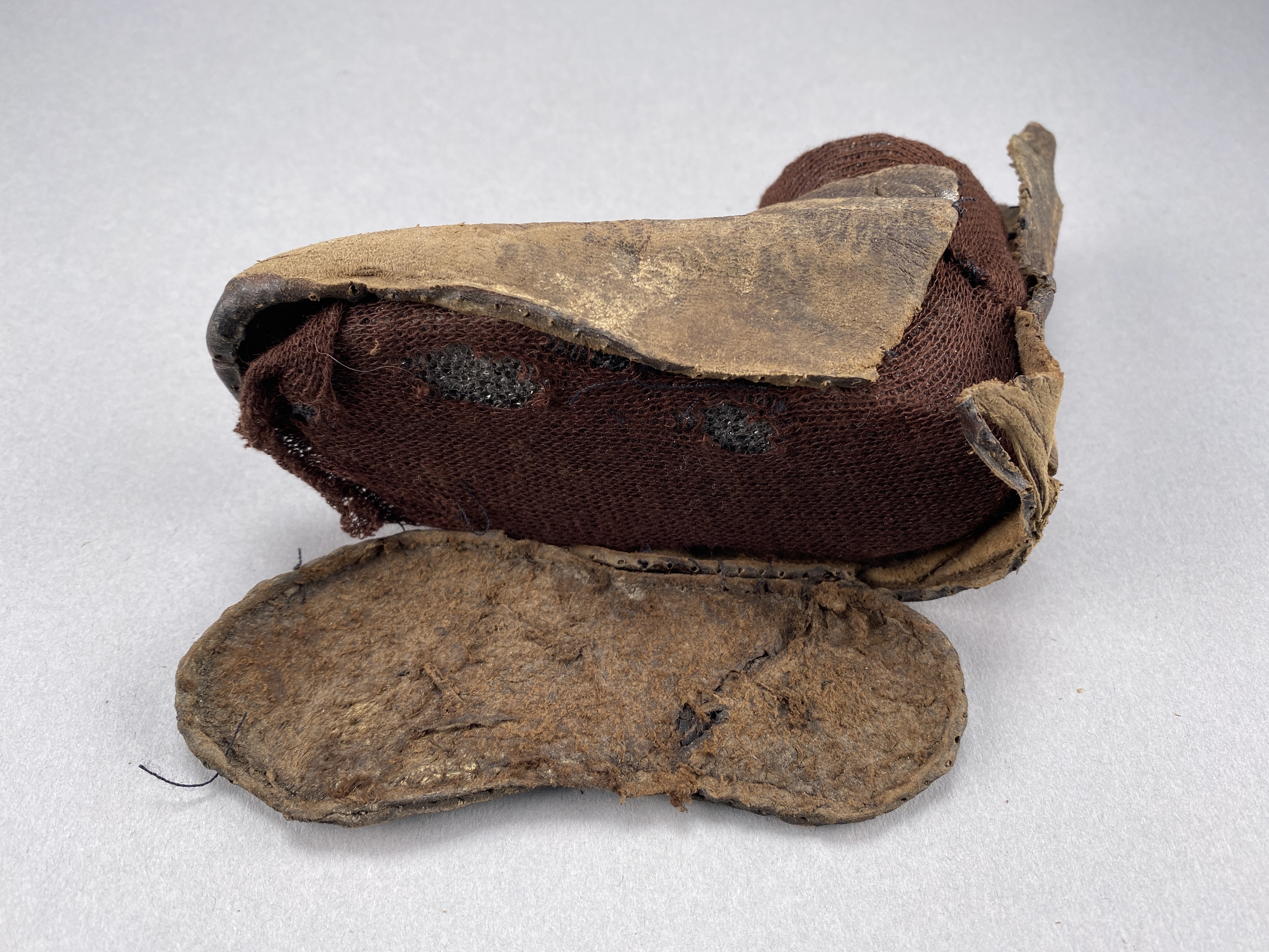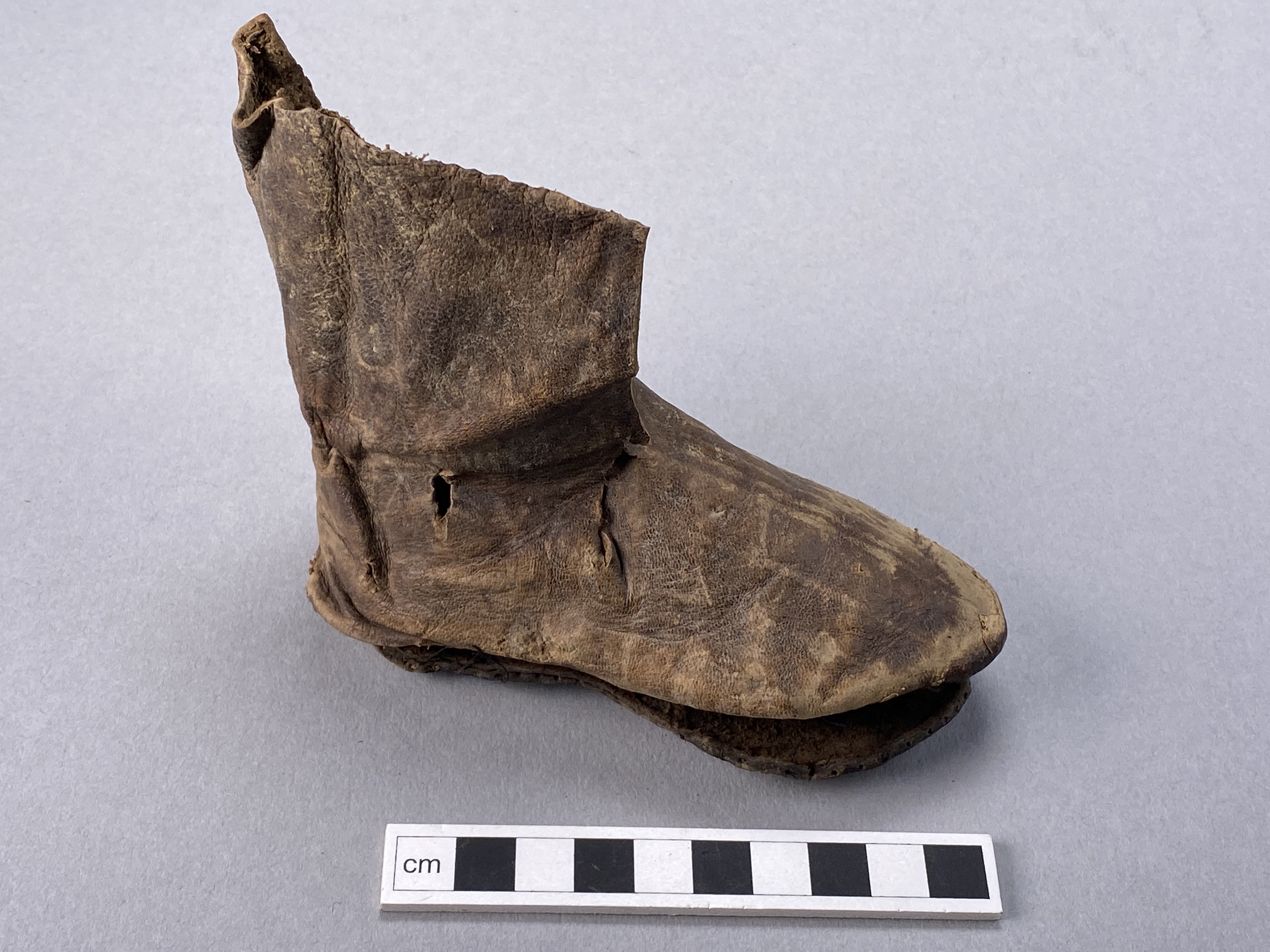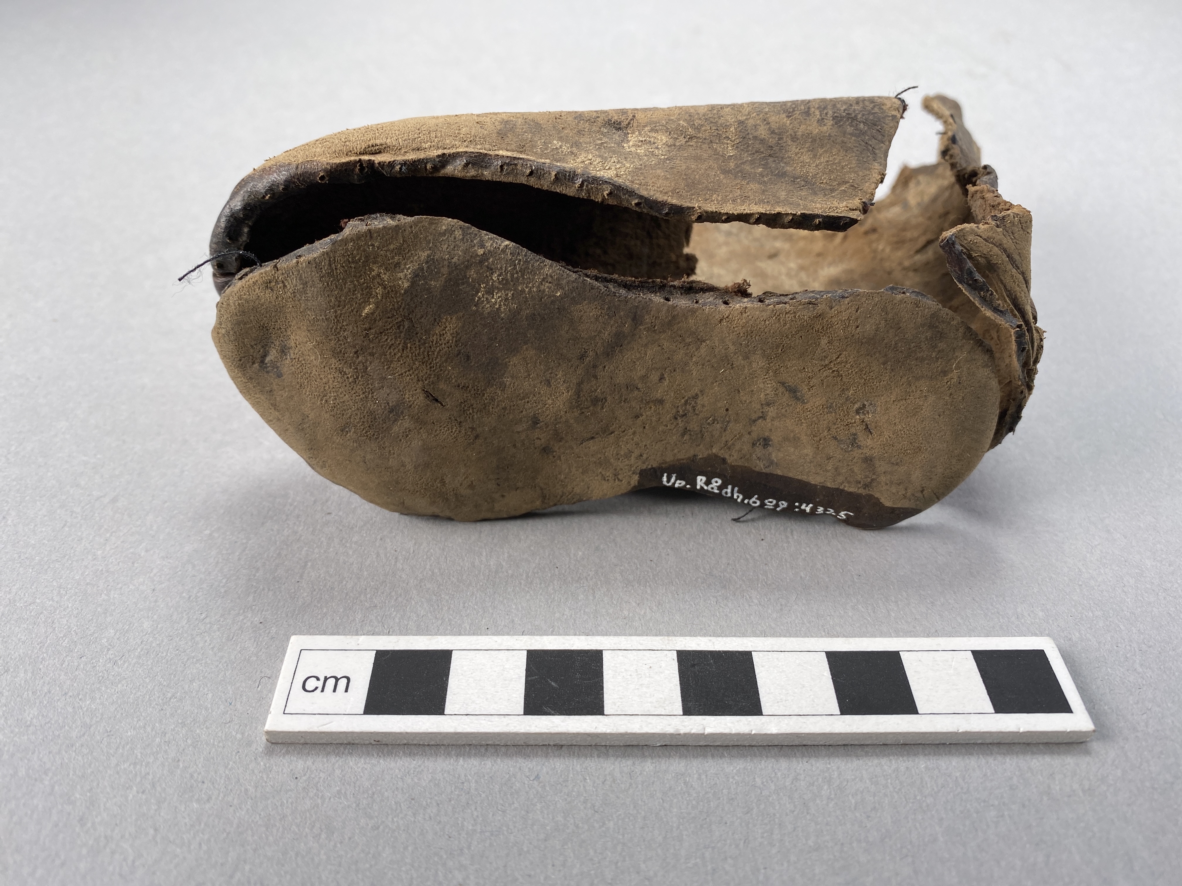 Hög barnsko med sula, snörhål vid vristen, spår av målad dekor på hela ovanlädret.