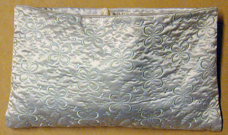 Ljusblått fodral av mattlaserat siden, broderad med fyrpass och smala kvistar och parvisabär i samma färg som sidentyget. Broderierna påbättrade med ljusgrön sidentråd. Fodrad medljusblå siden och med tre fack på varje sida.