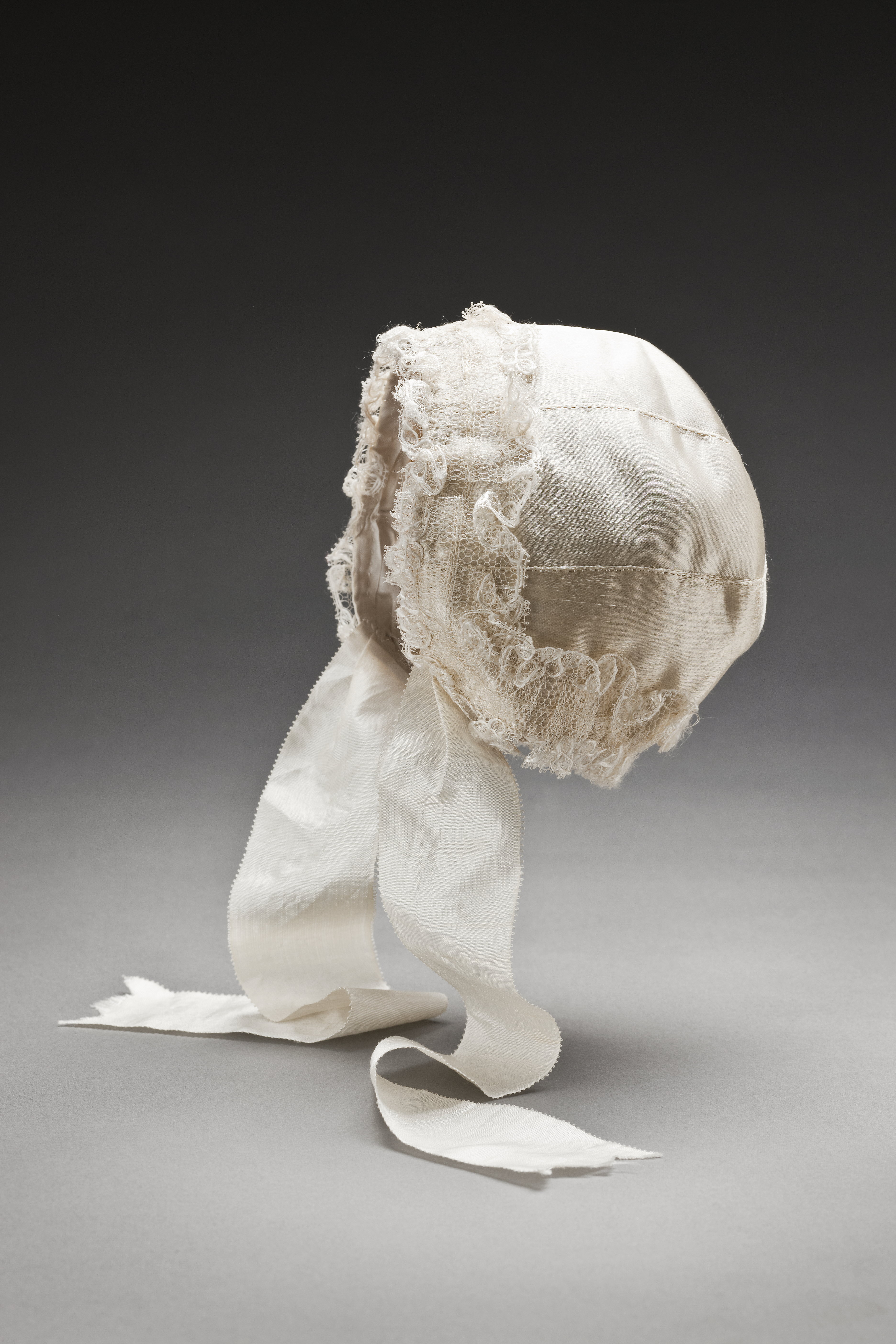 Naturvit mössa av atlassiden, sydd i 6 kilar. För pojke. Kantad med 36 mm bred spets, blonde. Naturvitt foder av sidentaft, sytt i 4 kilar. Hakband av siden, bredd: 37 mm, längd: 257 mm, klippta i 3 flikar nedtill.