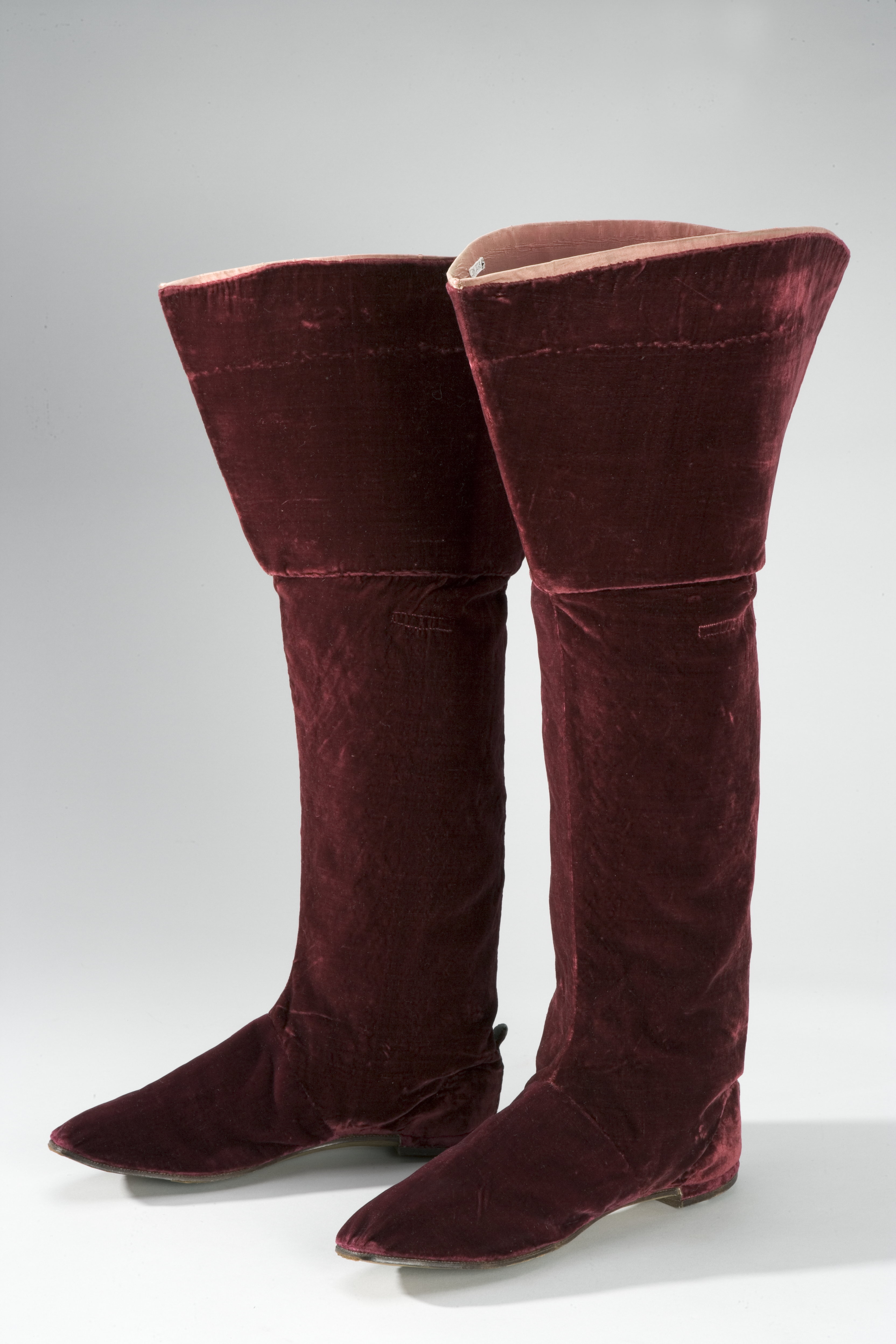 Den är skuren i reseft, skaft med söm mitt fram och bak och svängd, styvad krage. Modellen har tvär tå och mycket låg klack med välvd stiftlapp. Stöveln är fodrad med rosarött siden. I skaftets överkant finns två 35 mm breda sidenstroppar. Ovanför den sammetsklädda klacken finns en stropp av silvergalon. Yttersulan av ljusbrunt sämskläder har ett pinnhål under trampet, två i hålfoten och två på klacken. Kragen bär spår av dekoration, troligen spetsar.