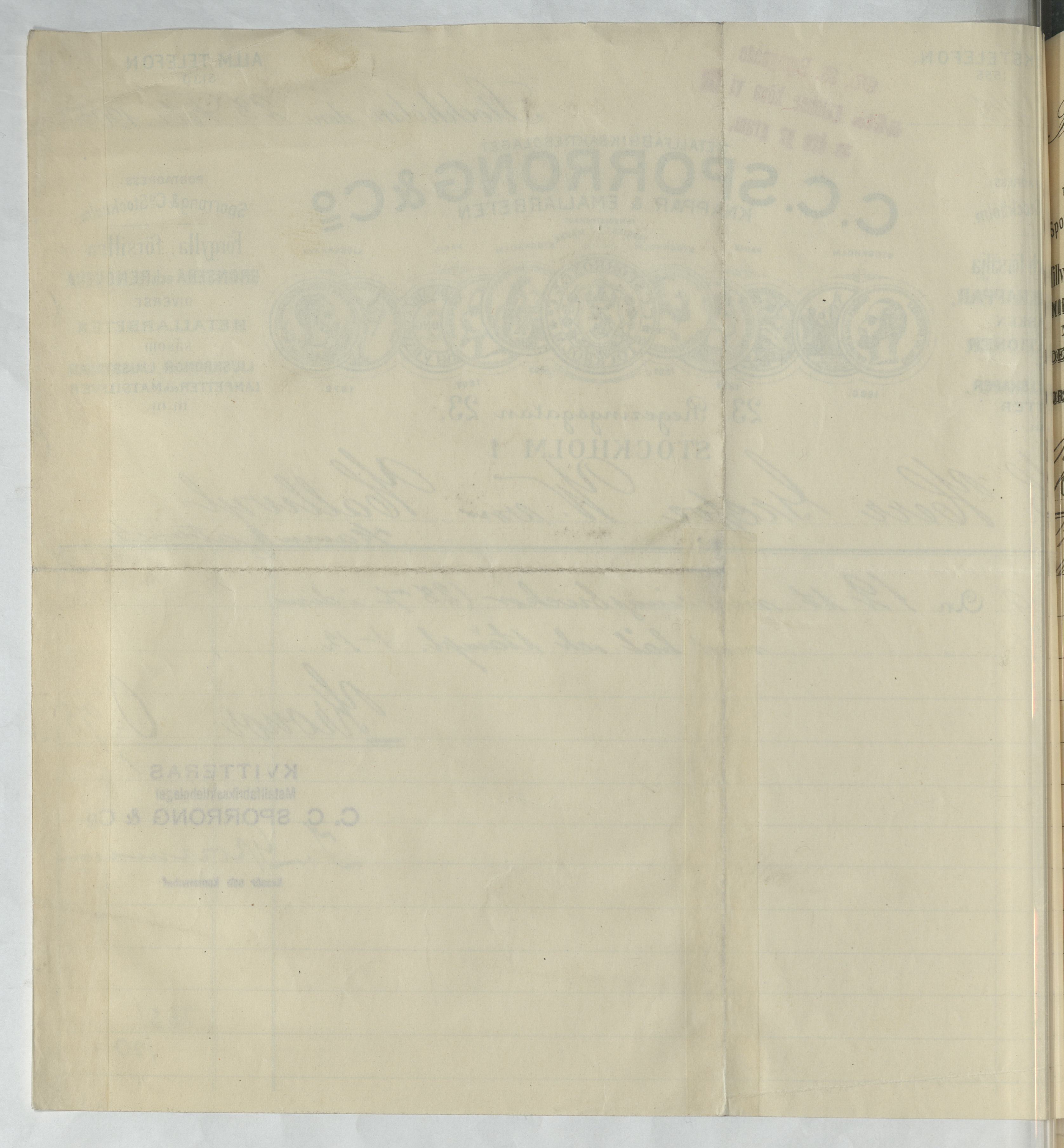 Kvitto från Metallfabriksaktiebolaget C. C. Sporrong & Co. Knappar & Emaljarbeten