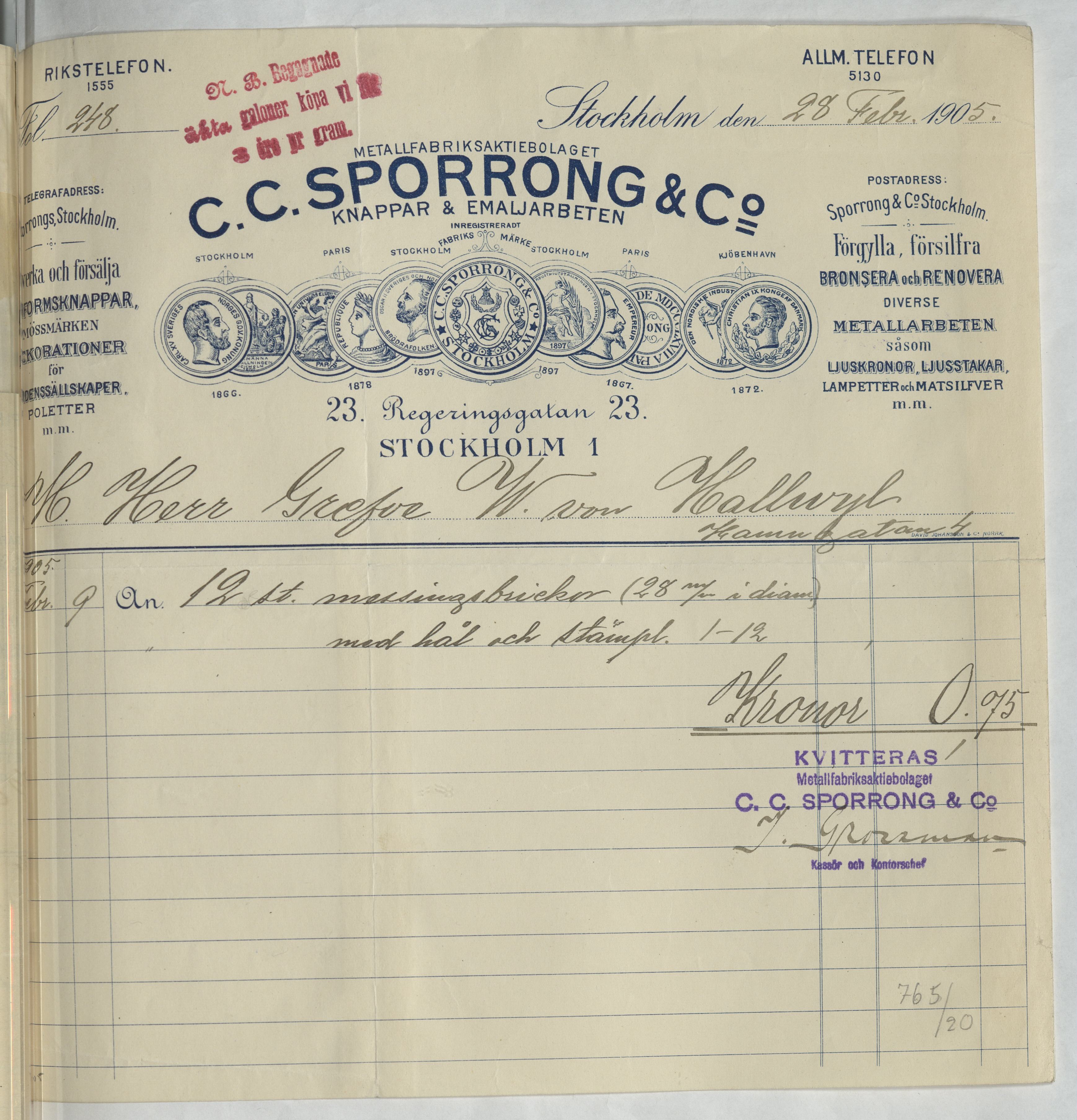 Kvitto från Metallfabriksaktiebolaget C. C. Sporrong & Co. Knappar & Emaljarbeten. Gällande mässingsbrickor med hål och stämpel. Stockholm, 1905.