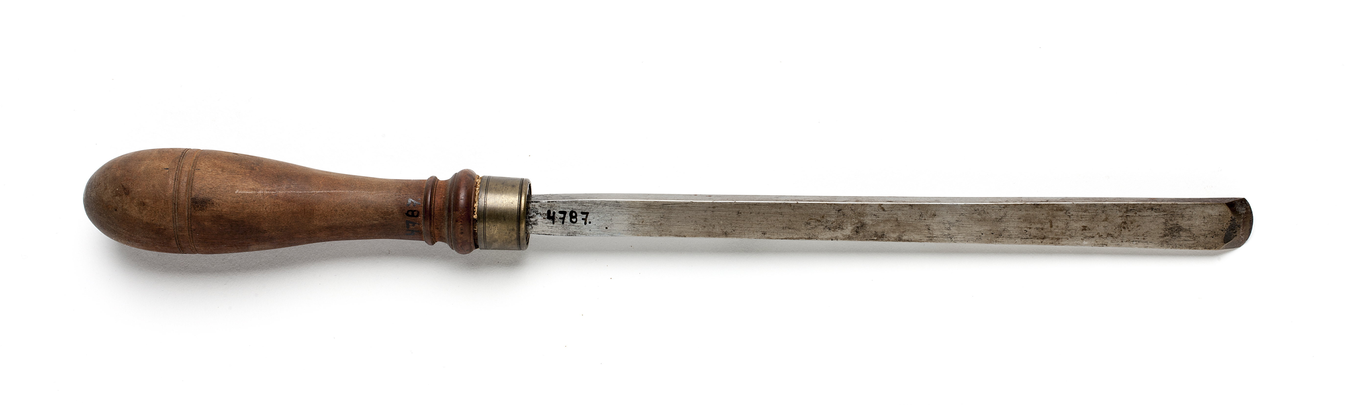 Rund klinga, i änden med rektangulär genomskärning. Svarvat skaft av päronträ med två vulster nedtill ("skoklostertyp"). Mässingsring. Stämpel i skaftets ände vid fästet: otydliga siffror