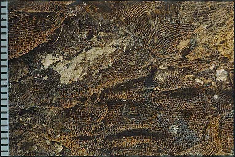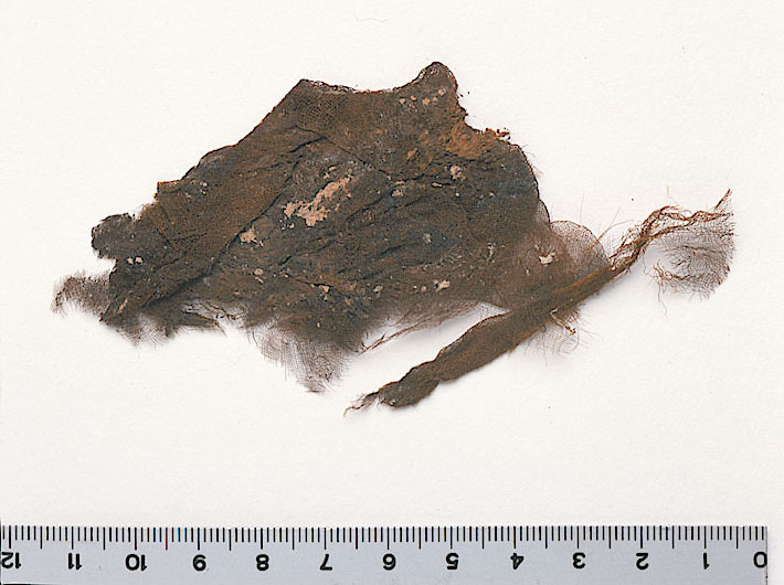 Frgment av siden, flor under nacken. Fragmentet ingår i en samling fragment tagna som prov ur drottning Kristinas kista vid gravöppningen den 13-14 december 1965. Varp: 1-trådigt silke löst spunnet i z-snodd. Trådtäthet: 30 trådar/cm Inslag: Silke löst spunnet i z-snodd. Trådtäthet: 24-26 trådar/cm. Material: Silke. Teknik: Tuskaft. Kommentar: Trådarna är mycket tunna så väven är mycket gles. Förmodligen likadan som i 32992 och 33005. Nuvarande färg är brun.