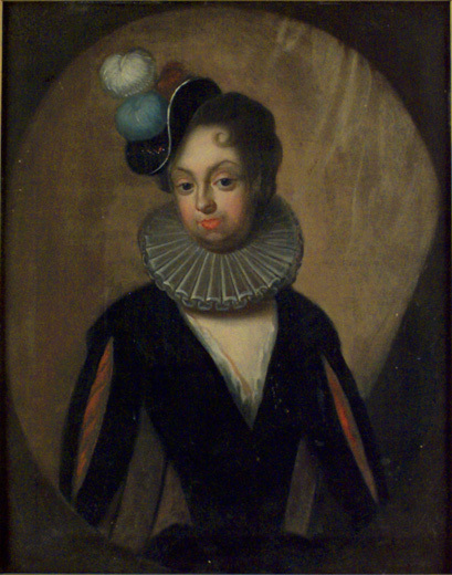 Målad oval. Höftbild en face , huvudet något åt vänster. Maskeraddräkt. Liten hatt med blå , vita och röda plymer , pipkrage , svart , djupt V-ringad dräkt med uppskurna ärmar med rött foder. På baksidan lapp : " Charlotte Lieven Född 1683 in Novembri , Gifft 17 med dåwarande Kammarherren Sedermera Riksrådet Högvälb : Grefwe S. H. Gustaf Carlsson Bonde. Död ". Limmad spännram. I förgylld ram. Ramlistens bredd 35 mm.
