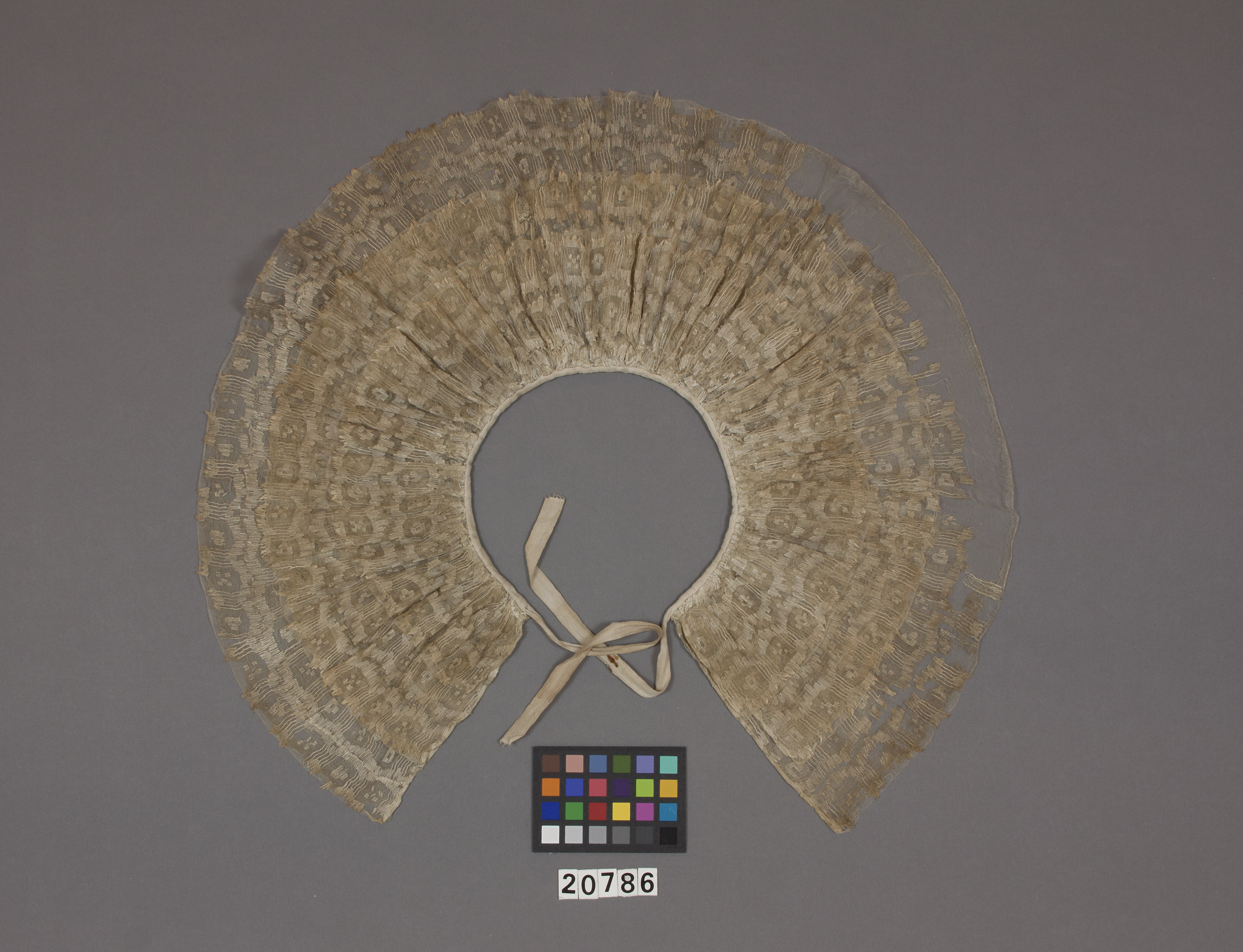 Krage av faconerat flor, numer konserverad med kreppelin. Äldre modell från 1650t (?), består av tre lager spets av med det bredaste underst och det smalaste överst. Halslinnigen består av ett linneband.