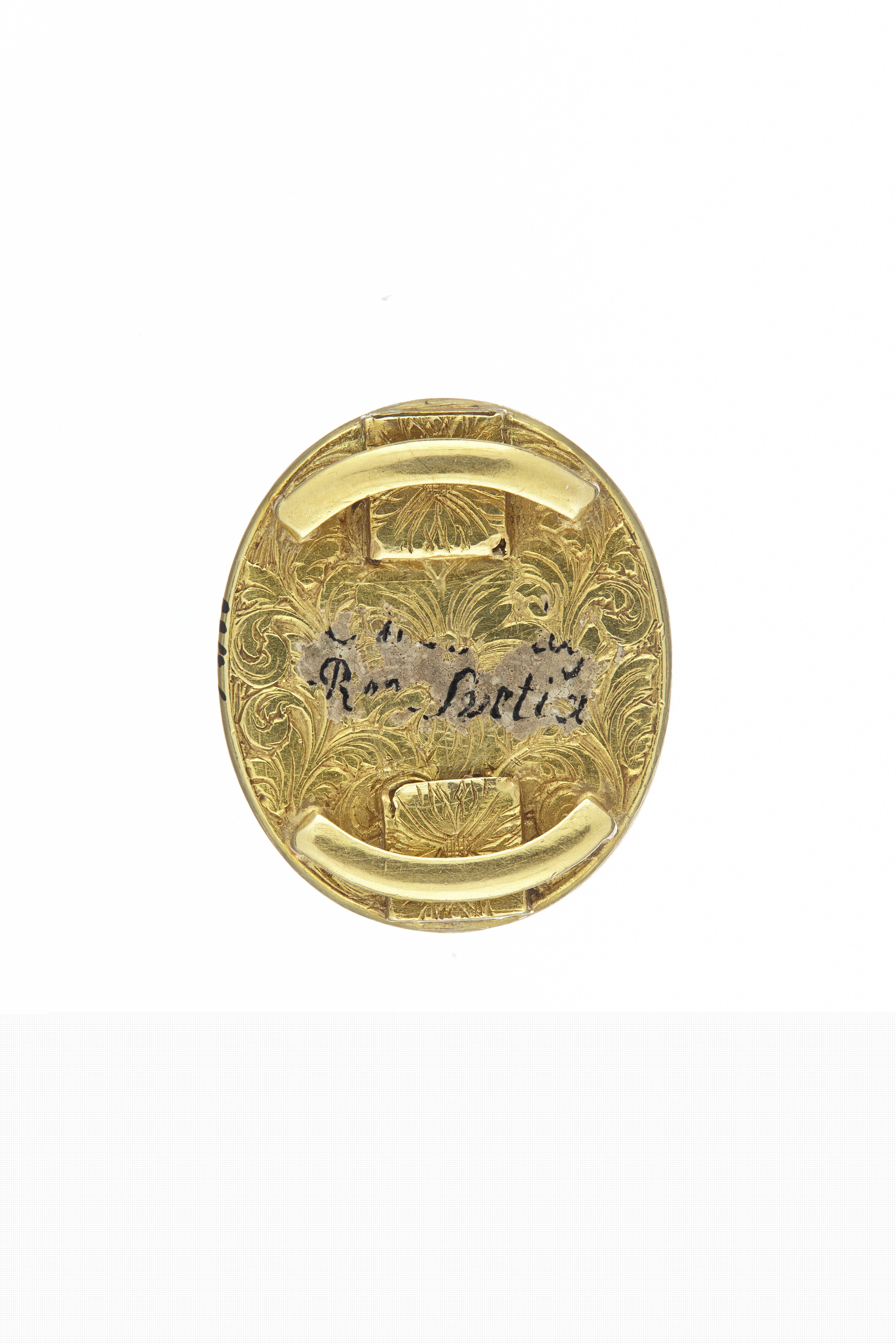 Gouache av Alexander Cooper (1605-1660). Bröstbild, fas v, rustning, vit snibbkrage, blågrå bakgrund. Infattad bakom glas med fasad kant, slät fattning av guld, på baksidan graverad rankdekor, två svängda byglar för band, därunder två rektangulära hylsor, den ena med öppen kortsida, på den andra två runda hål (för fästning av armband?). Rester av pappersetikett(?) med påskrift: C......af // R...Svetiae.