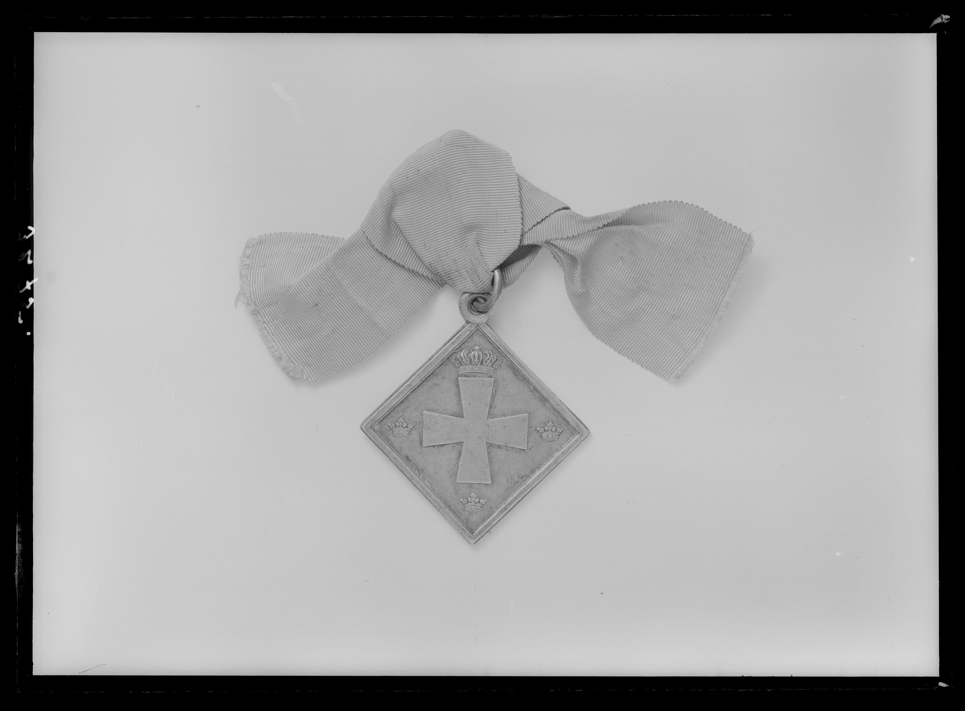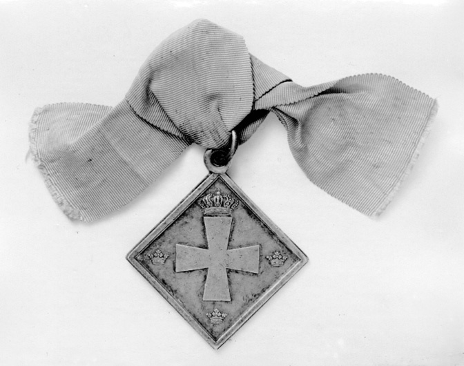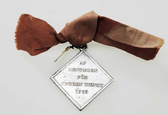 Kvadratisk silverplatta, ställd på diagonalen, ring på övre spetsen. I ringen fäst bandring. Åtsida: krönt georgskors, omgivet av tre mindre, öppna kronor. Frånsida text: "AF // KONUNGEN // FÖR // TROGEN TJENST // 1799".