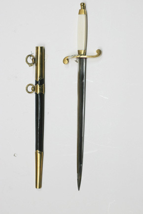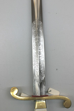 Fäste av förgylld mässing. Fyrsidig knapp, rund nitknapp. S-formiga parerstänger med uppåt- respektive nedåtböjda, rundade ytterändar. Fyrsidig kavel av elfenben. Klinga rak, tvåeggad med hög mittås, klingans ena sida med etsad dekor i form av bladslingor samt rysk text: Zlatoust Vapenfabrik - runt ryska riksvapnet.