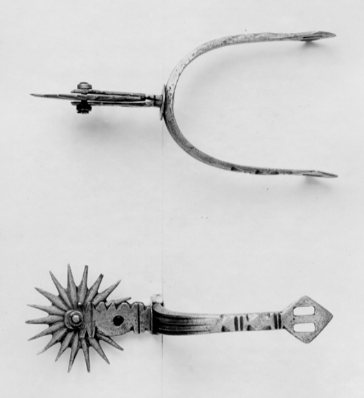Stor sporre av stål. U-formade plana skänklar, på utsidan dekorerade med räfflor och infilade romber och hack. I ändarna rombiska plattor med två rektangulära genombrytningar för sporrläder. Hals 55 mm lång, rak, bestående av två tätt ställda 24 mm breda plattor i mitten genombrutna i ett runt hål i övre kanten med filade uddar, underkanten konturerad. Stor klinga 68 mm i diameter med aderton taggar.