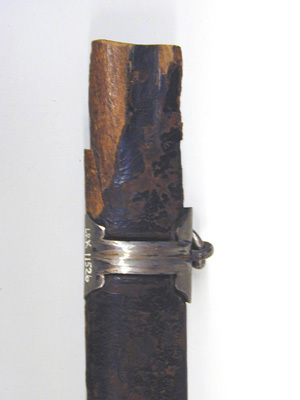 Balja överklädd med brunt skinn, beslagen med tre mellanband och doppsko av stål med en djup tvärgående kannelyr. Vid kanterna konturerat utdragna uppåt och nedåt. Det övre bandet med koppelring. Doppsko 35 mm hög, tvärt avslutad, nedtill utdragen, vid fram- och bakkanterna i form av smala, 240 mm långa skenor.