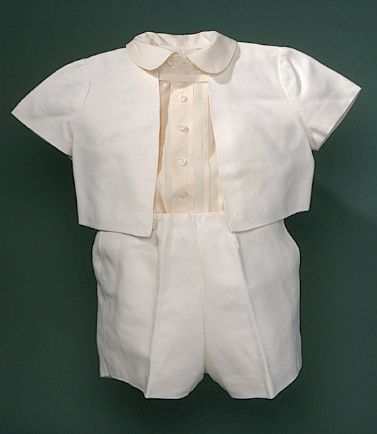 Jacka till gosskostym av vitt ylle. använd av Carl XVI Gustaf vid Gustaf V:s 90-årsdagsfirande 1948.