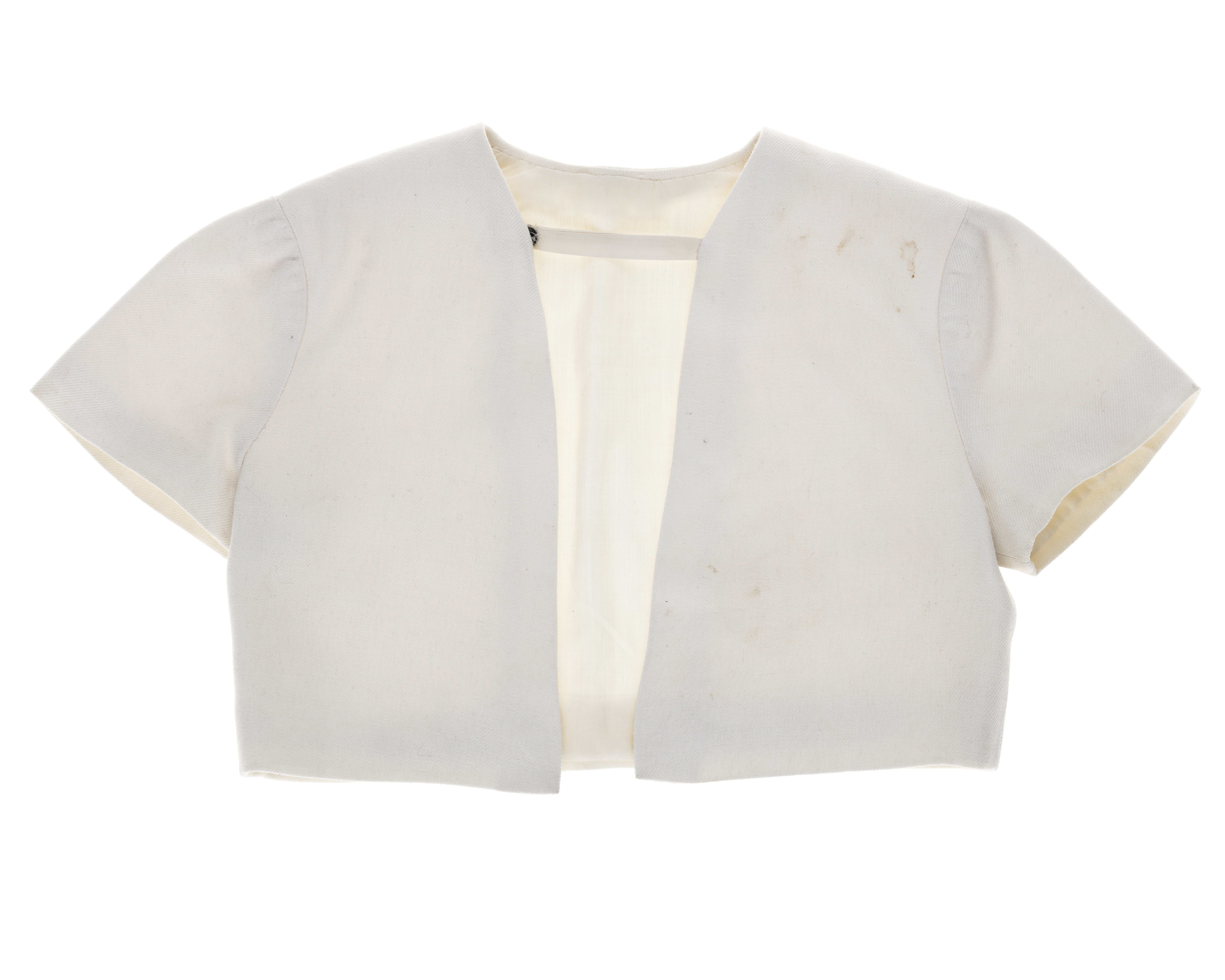Jacka av vitt ylle med kort isydd ärm. Utan krage och knäppning. Rak modell. Mitt fram i ringningen, smal slejf av vitt siden, knäppt med tryckknapp. Foder av vit bomull.