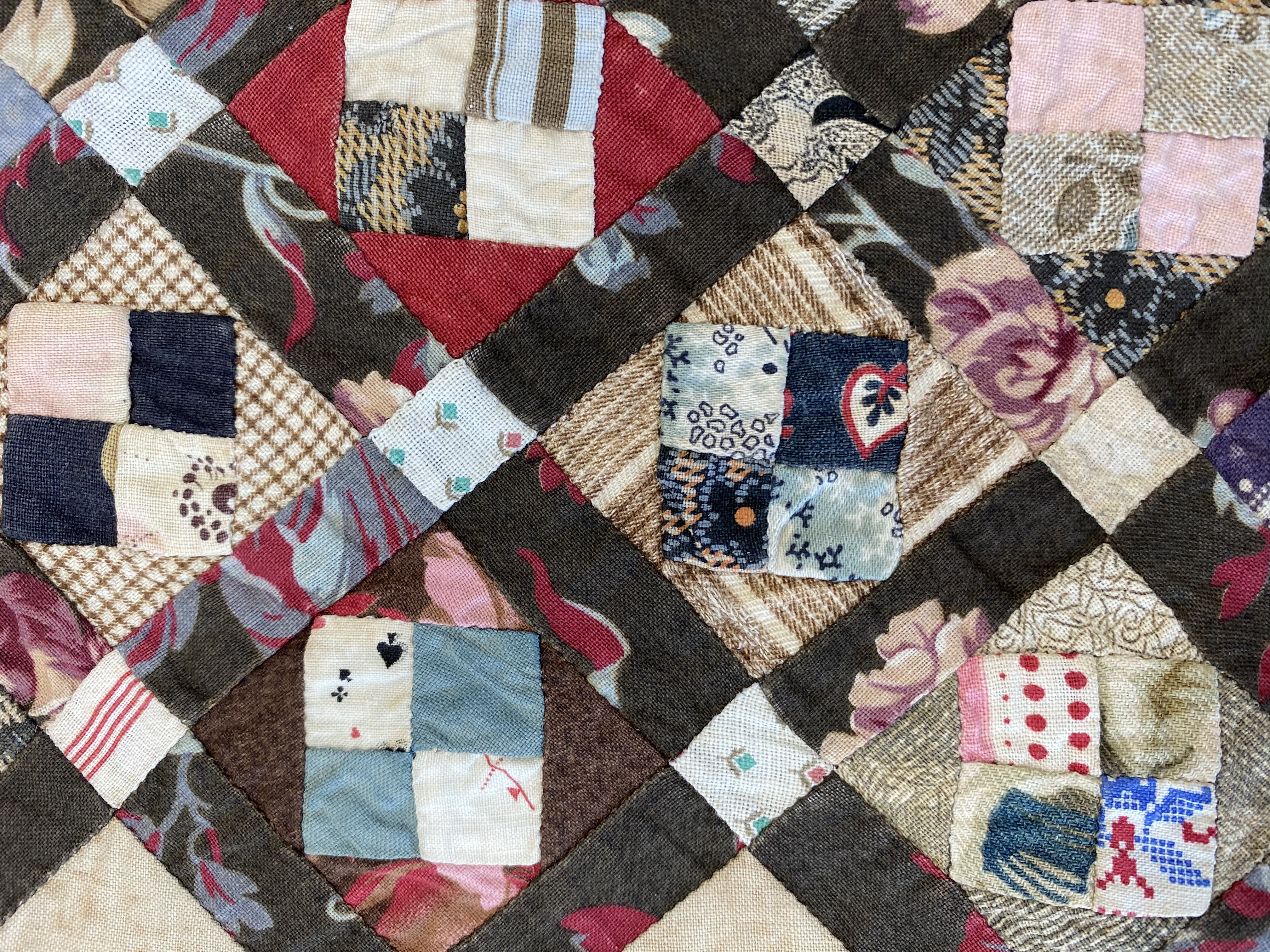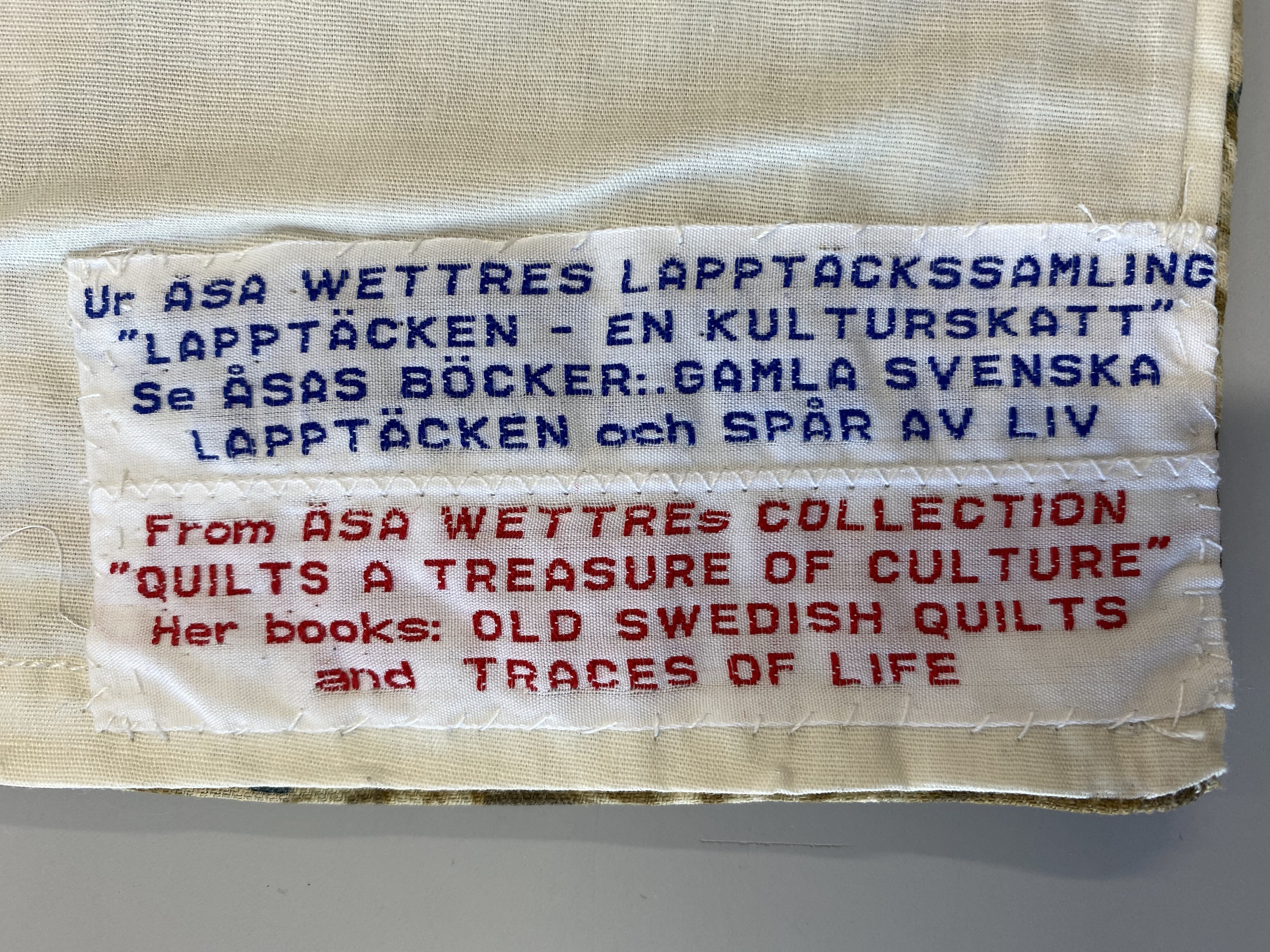 Lappduk med kungligt motiv, sydd av finsömmerskan Anna Pettersson (1880-ca. 1960) i Stockholm, 1900-talets början. I mitten är en tryckt sjal med bild på Oscar II i amiralsuniform, omgiven av statyer föreställande Gustav Vasa, Gustav II Adolf, Karl XII och Karl XIV Johan, vilken sedan förstorats runtomkring med små lappar i syfte att användas i hemmet. Mönstret är en kombination av olika mönster: 4-lappsmönster och 9-lappsmönster. 9-lappsmöntret som inramar 4-lappsmönstret har mörkare långsidor och ljusare hörn. Materialet i lapparna är framför allt bomull men även siden. Foder av bomull. På baksidan etikett på svenska och engelska: "Ur Åsa Wettres lapptäckssamling "Lapptäcken - en kulturskatt". Se Åsas böcker:. Gamla svenska lapptäcken och spår av liv".