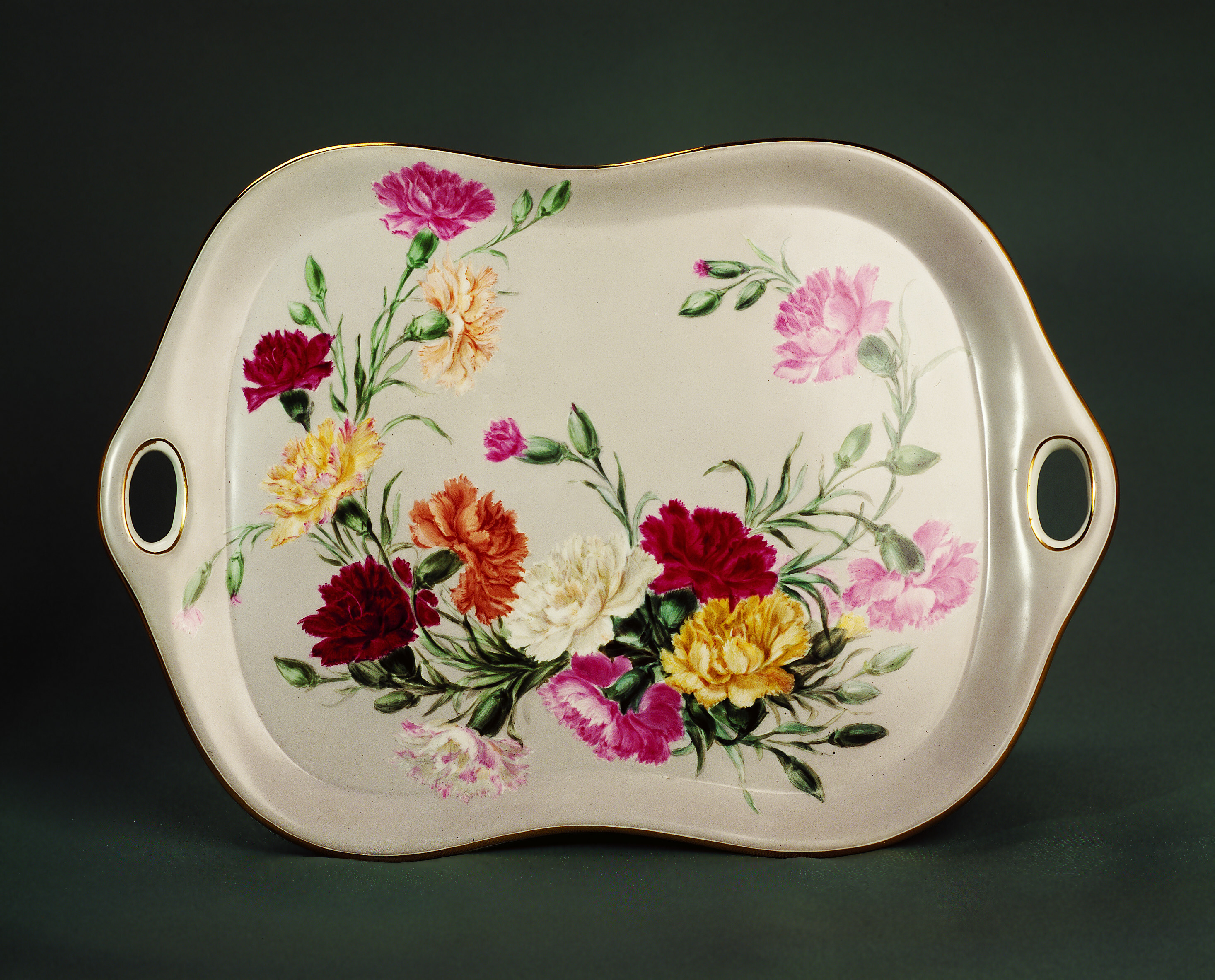 Rektangulär bricka med snett utstående, nästan rak kant; långsidorna insvängda, kortsidorna med långsträckt ovala handtag, bildade genom utvidgning av kanten. Bottnen oglaserad. Dekor i form av en krans av nejlikor målade i olika färger (amatörarbete). Målad av Hanna von Philipsborn. Fabriken grundlagd år 1752 av Wilhelm Caspar Wegely som av ekonomiska skäl tvingades stänga 1757. Fabriken öppnades ånyo 1761 av köpmannen Johann Ernst Gotzkowsky med Friedrich Elias Meyer som modellmästare. 1763 övertogs fabriken av Fredrik den Store och fick namnet Königliche Porzellan Manufactur.