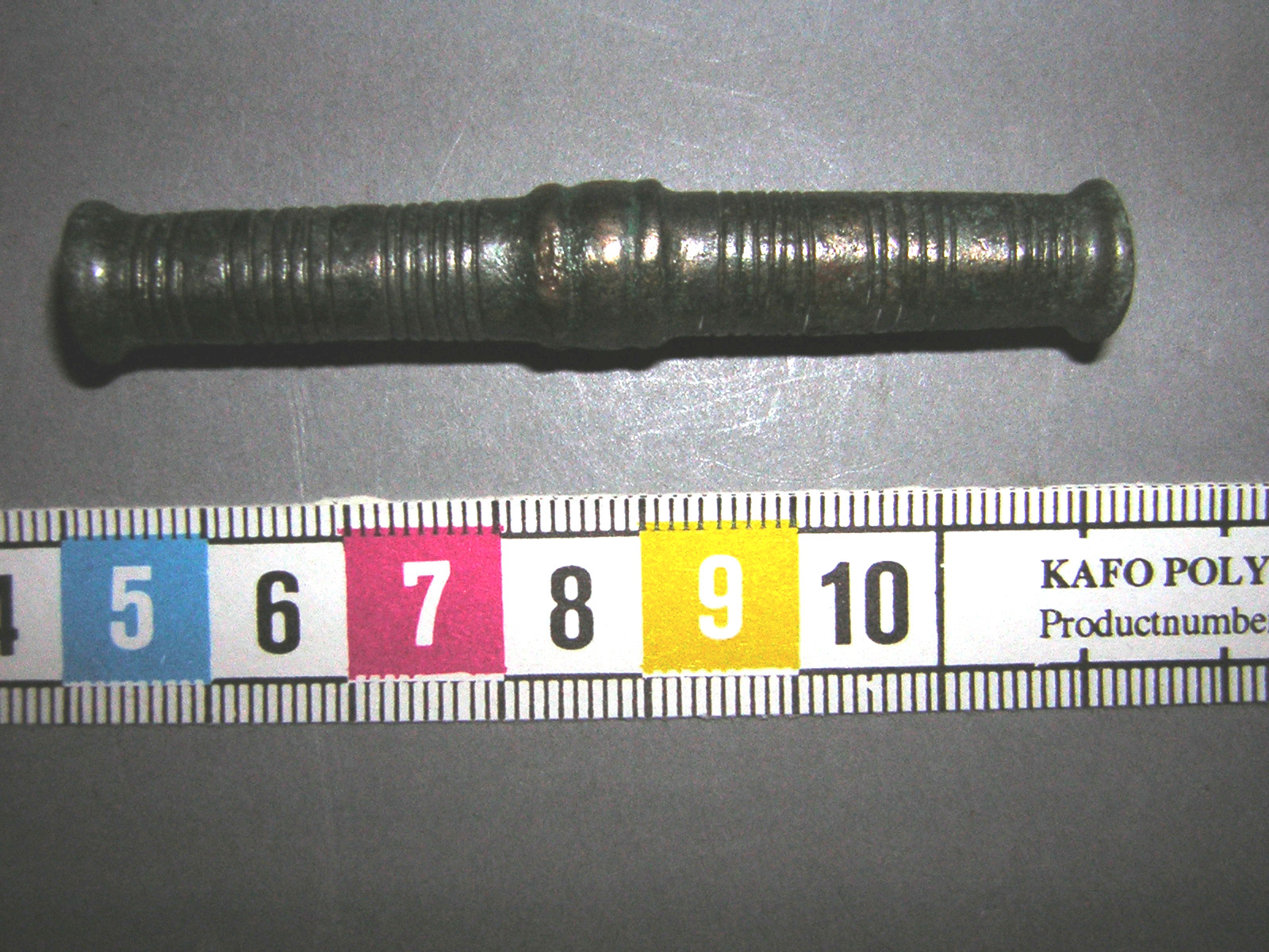Rör av brons, trind och med runt hål. Utsidan är ornerad med upphöjda ränder och med grupper av fina, fördjupade linjer.
