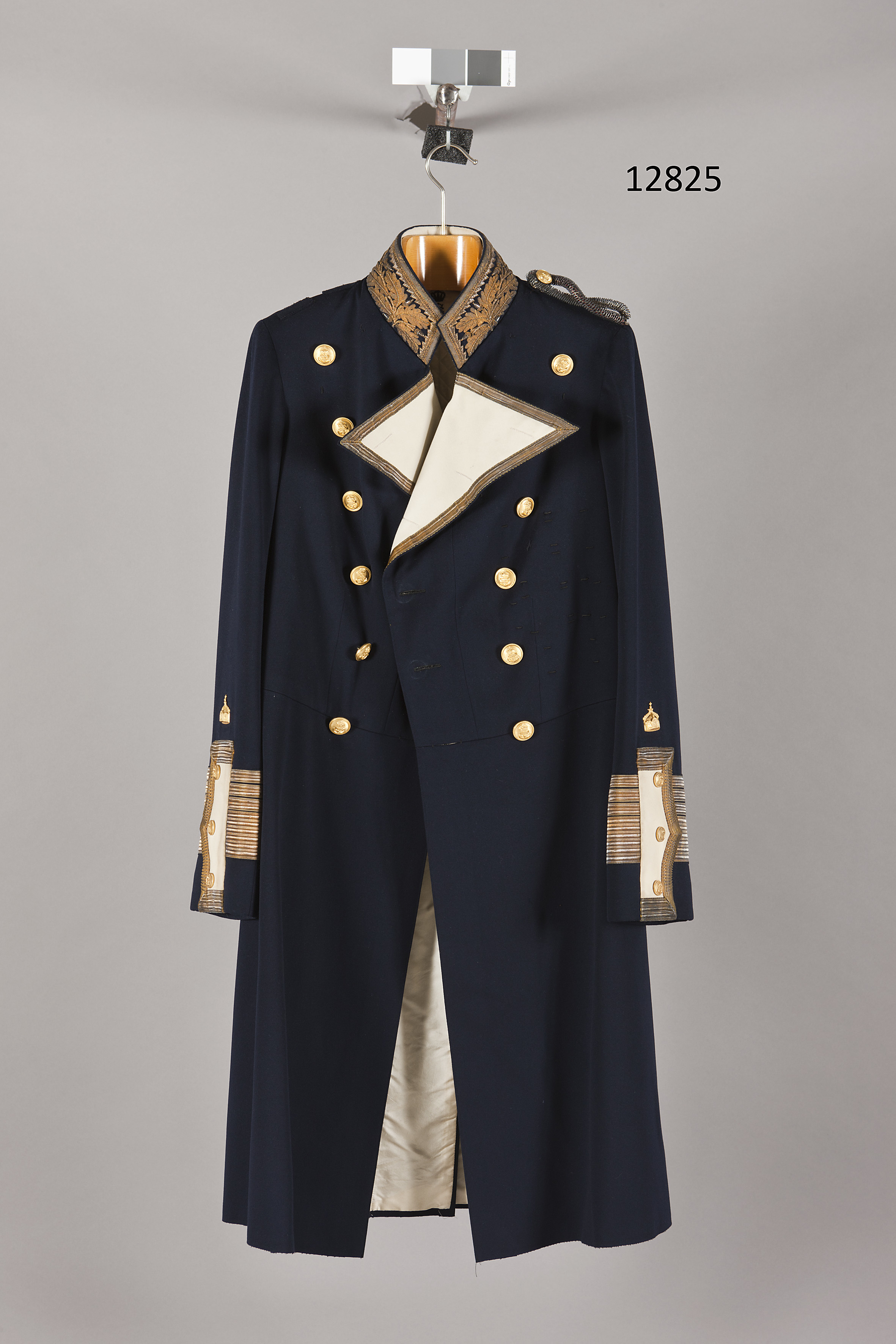 Tysk amiralsfrack av mörkblått kläde med ståndkrage och vita slag. Två knapprader om sex knappar och två knapphål. Knapparna förgyllda, d: 25 mm. Uniformens förgyllda knappar, välvda med i hög relief ett ankare krönt med en åttkantig krona; repstavsbård, på undersidan firmamärke: "J. ROPRECHT HOFLIEFERANT // BERLIN". Under vänster slag tre plana knappar klädda med svart bomullssatäng, d: 15 mm. Den egentliga knäppningen sker med två spänntampar med knäppen som sitter i fodret samt upptill med tre hakar och en hyska på slagen och kragen. Ståndkragen är broderad med eklöv och spetsiga ekollon samt en sågtandad bård, allt i guldtråd. Slagen kantade med guldgalon, b. 14 mm. På slagens insida, som normalt är synlig, finns på det vita klädet tre blinda knapphål broderade. På vänster sida 32 och på höger 2 tränsar. På höger axel tre långsmala trånga hällor. På vänster sida en sådan hälla samt däri inhakad träns, fastsydd vid ärmen och bestående av en silvertrådskantilj med en förgylld knapp upptill, d: 20 mm. Nedtill på ärmarna guldgaloner. Galonerna sydda tillsammans på en bit kläde, tre galoner b: 14 mm, och den nedersta b: 53 mm. Över galonerna är uppslagsklaffar sydda av vitt kläde med tre förgyllda knappar, d: 17 mm, samt kantning med guldgalonen, b: 26 mm, på tre sidor. Ovanför klaffen en åttkantig, täckt krona i hög relief, förgylld och fastsydd på en platta i fodret. Hel rygg, delade skört med fållklaffar, spetsiga av vitt kläde, med guldtrådsbroderade eklöv, ekollon och sågtandad bård samt tre förgyllda knappar, d: 25 mm. Foder av vit diagonalvävd bomullssatäng, matelasserad i livet. På höger sida en stolpficka, fodrad med vit bomullssatäng. Vid ärmarna fastsydda tygöglor. I kragen vit sidenlapp med i svart broderat krönt "G".