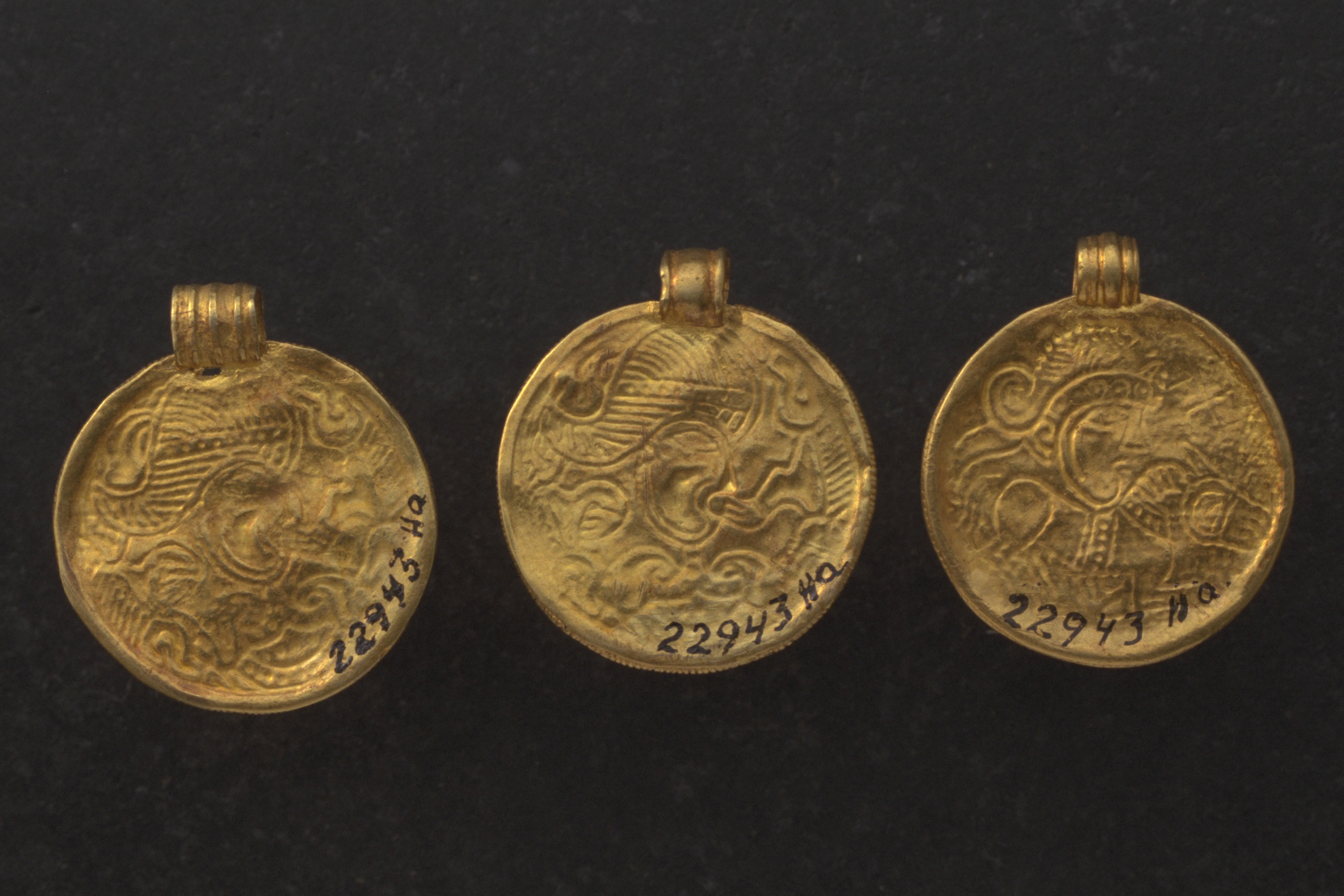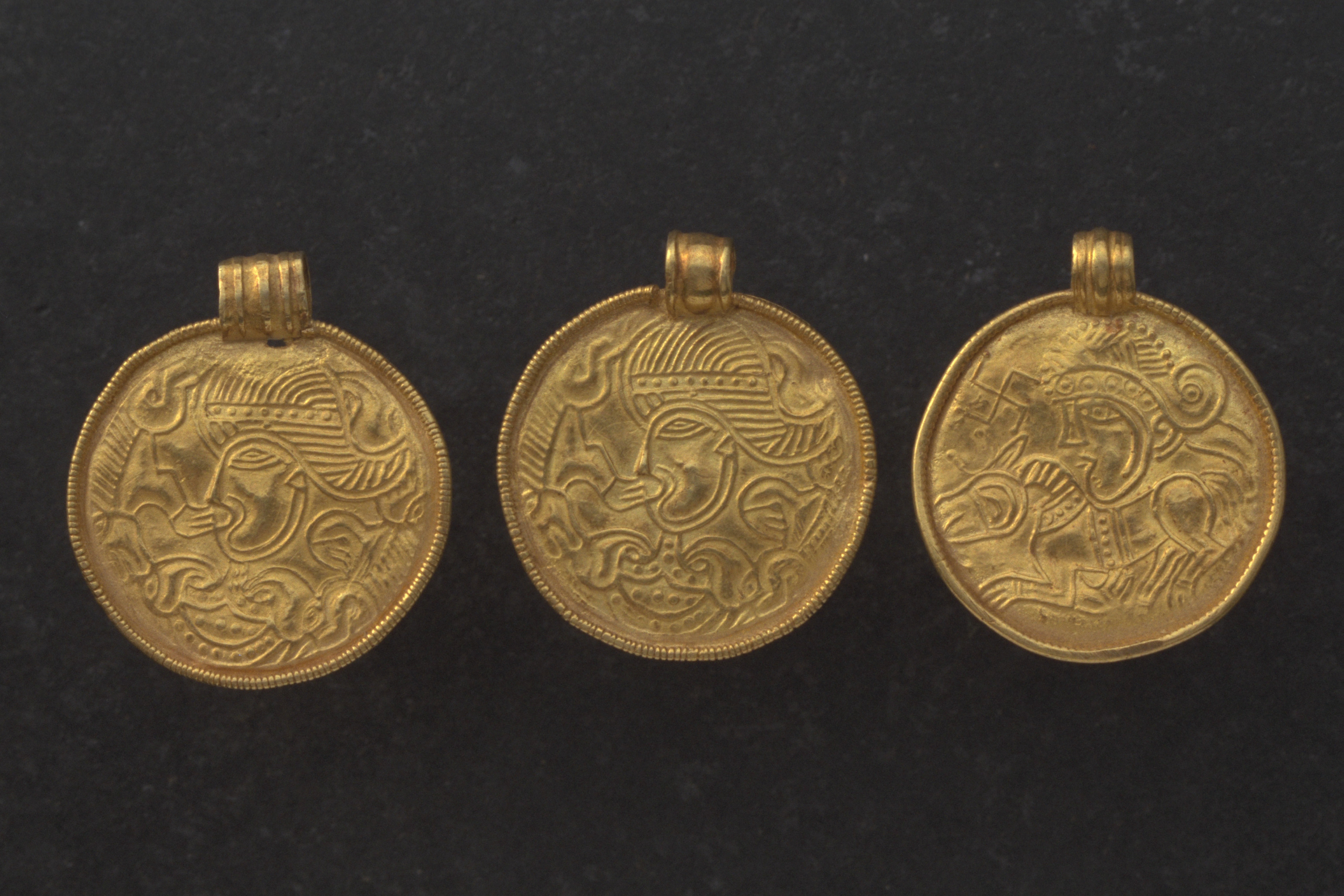 Guldbrakteat av C-typ, med kejsarhuvud över en häst med horn, framför ansiktet ett hakkors, kanten är tvärstrierad.
