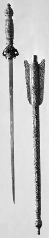 Fäste helt av förgylld mässing rikt ciselerat med yttäckande mönster av volutformade bladrankor och palmetter. Rund knapp med profilerad hals och hög profilerad nitknapp. Nedåtböjda pareranordningar i akantusbladform som bildar en hylsa som omsluter baljans övre del. På krysset en rund vit sten infattad och en tom infattning. Kaveln med runt tvärsnitt profilerad upptill och nedtill. Klinga av stål 12 mm bred, rak, eneggad.