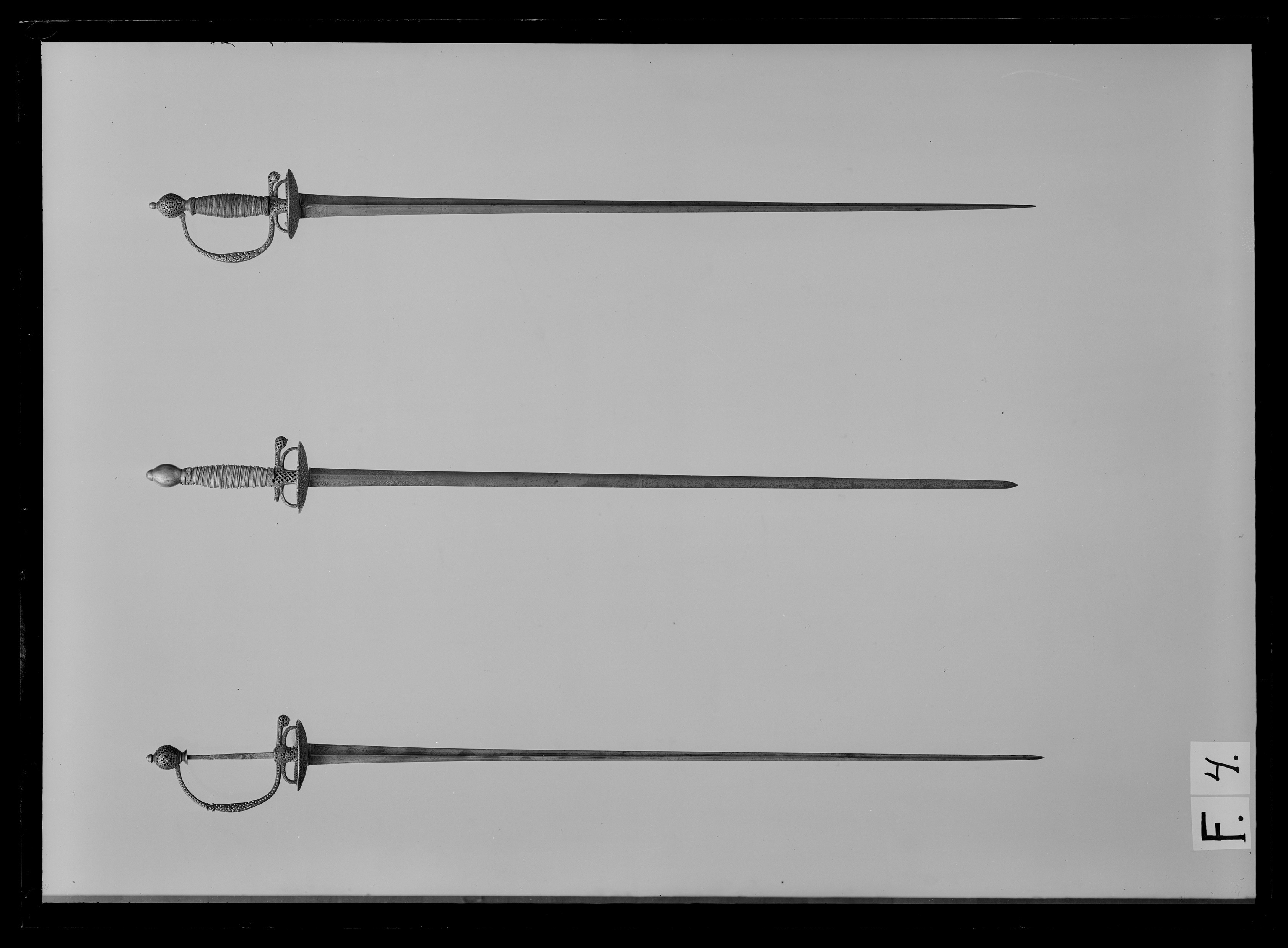 Fäste av stål med i sin helhet fint genombruten och (ursprungligen) blånerad ornering. Kavel och kavellindning fattas (förkomna): tången, fullt synlig, med rektangulärt tvärsnitt, upptill på utsidan klingsmedsstämpel i form av ett hjul, varöver bokstaven A. Knapp rundat oval; handbygel avbruten ovanför mittpartiet, tämligen platt med breddat mittparti, överdelen intappad nedtill i knappen; fingerbyglar rundat böjda; parerplåter njurformigt symmetriska. Orneringen på ut- och insidan av knapp, handbygel, kryss och båda parerplåtarna i form av en oval medaljong omslutande ett genombrutet blommotiv; medaljongerna utom hos dem på handbygeln upptill åtföljda av en symmetriskt formad festong. Orneringen i övrigt bestående av genombrutet gallerverk, gallrets rutor rombiska utom på handbygelns över- och nederdel, där det genombrutna mönstret utgöres av små runda hål. Klinga rak, treeggad s k stukatklinga. Baspartiet med etsad ornering i form av ett c. 90 mm lång, upptill tvärt avskuret fält, vari en tunt tecknad, asymmetriskt bladranka, upptill och nedtill omgiven av ett löst flätat bandornament; ovanför fältet ett fritt rankornament på utsidan i form av ett rankmotiv, på insidan liknande tre par korsade ryttarstandar.