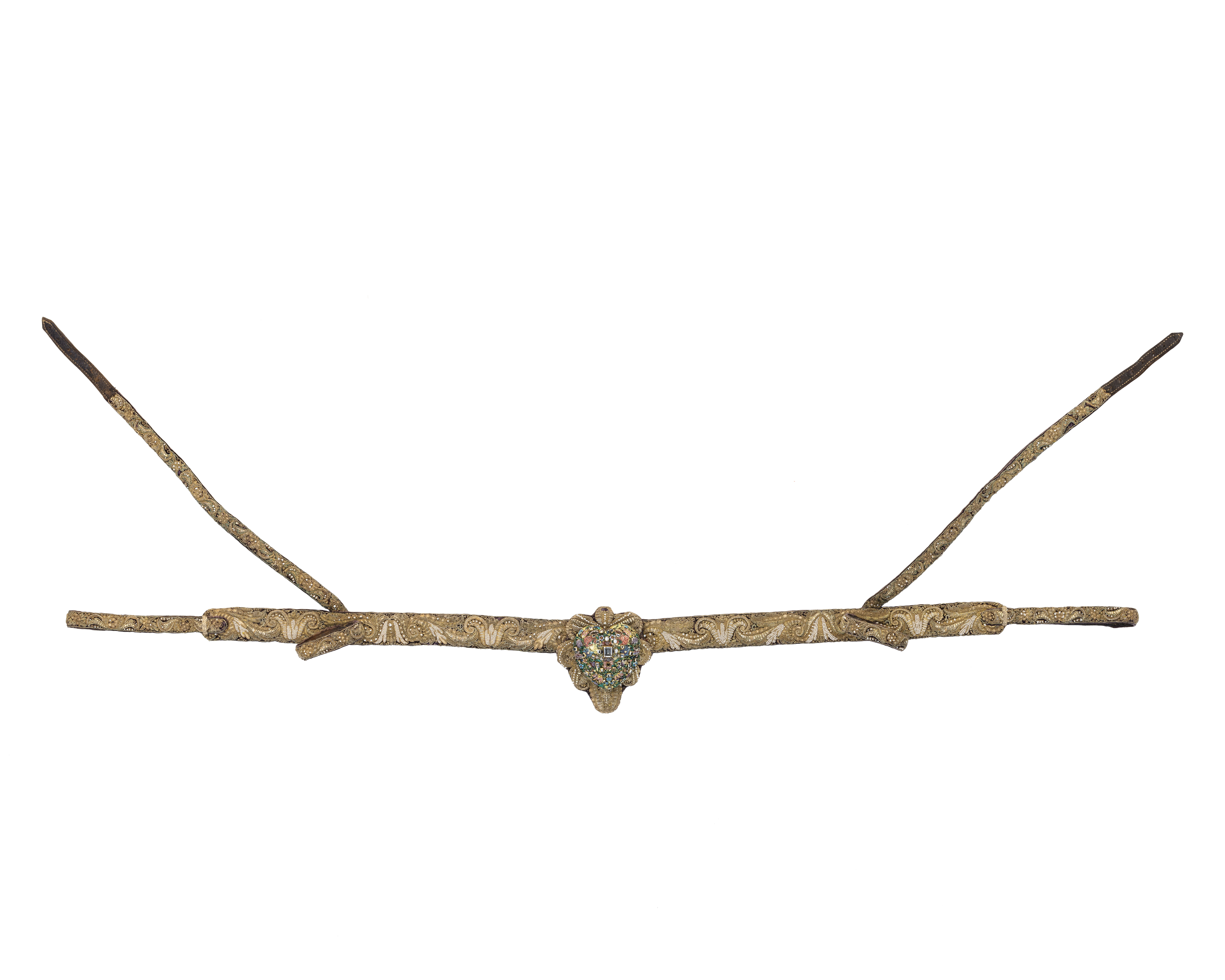 Betselstång af Jern, Complette, med rikt emailleradt Arbete, besatt med Stenar, hvarå finnes Två stycken Pucklor, samt 3 st Rosetter ,befinnes på Betselstången 125 st diverse Stenar (tillskrivet 2 stenar brista, afskrifne År 1822)