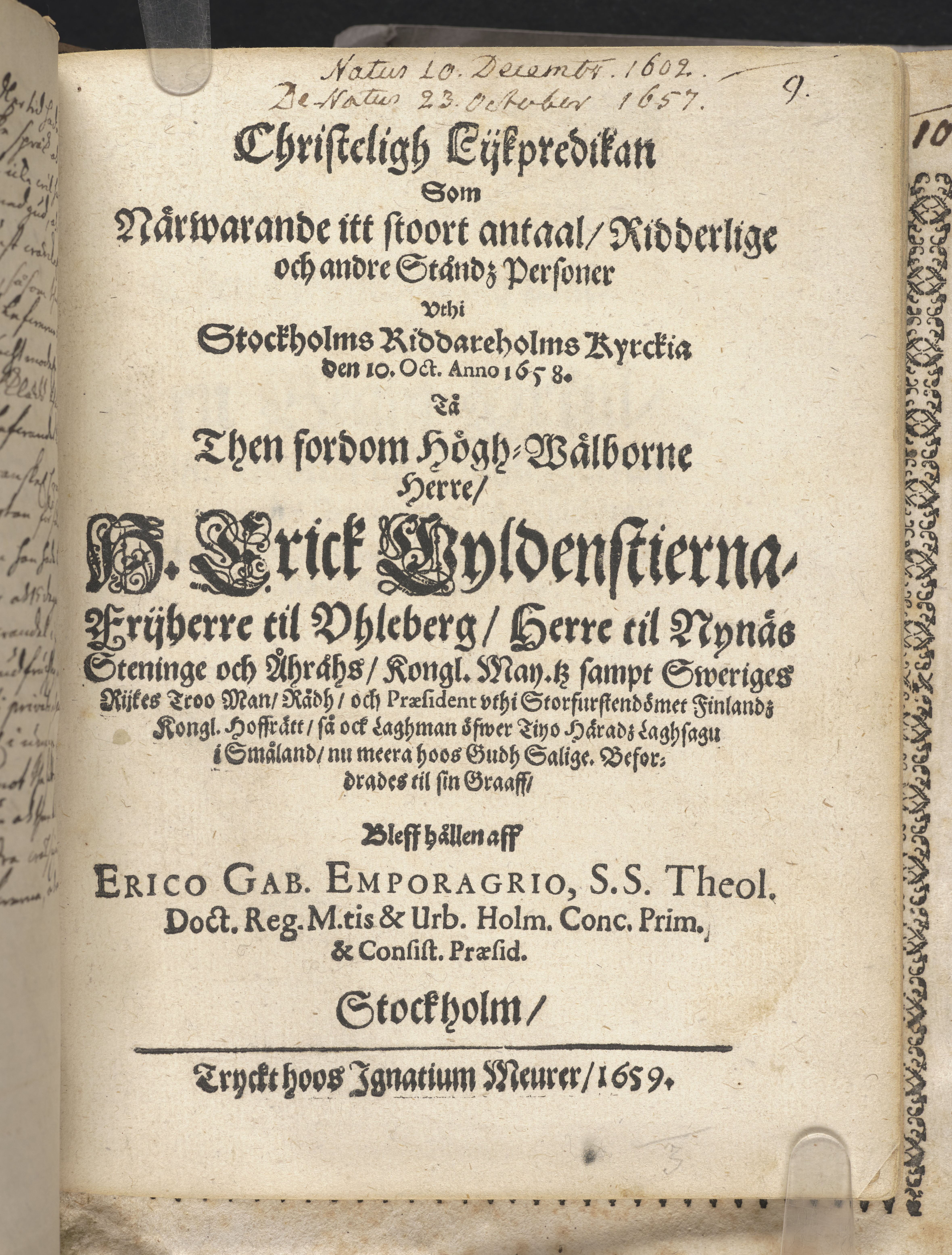 Christeligh lijkpredikan som närwarande itt stoort antaal, ridderlige och andre ståndz personer vthi Stockholms Riddareholms kyrckia den 10. oct. anno 1658. Tå ... H. Erick Gyllenstierna, frijherre til Vhleberg ... befordrades til sin graaf, bleff hållen aff Erico Gab. Emporagrius ... Stockholm, tryckt hoos Ignatium Meurer, 1659.