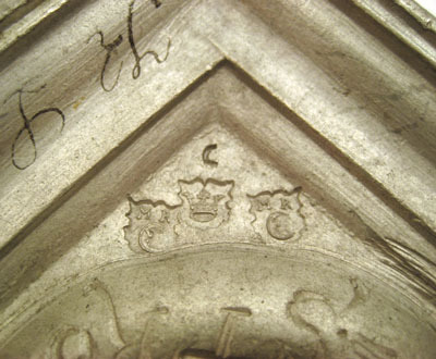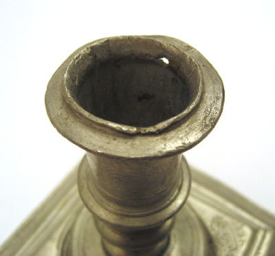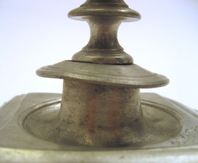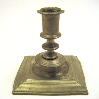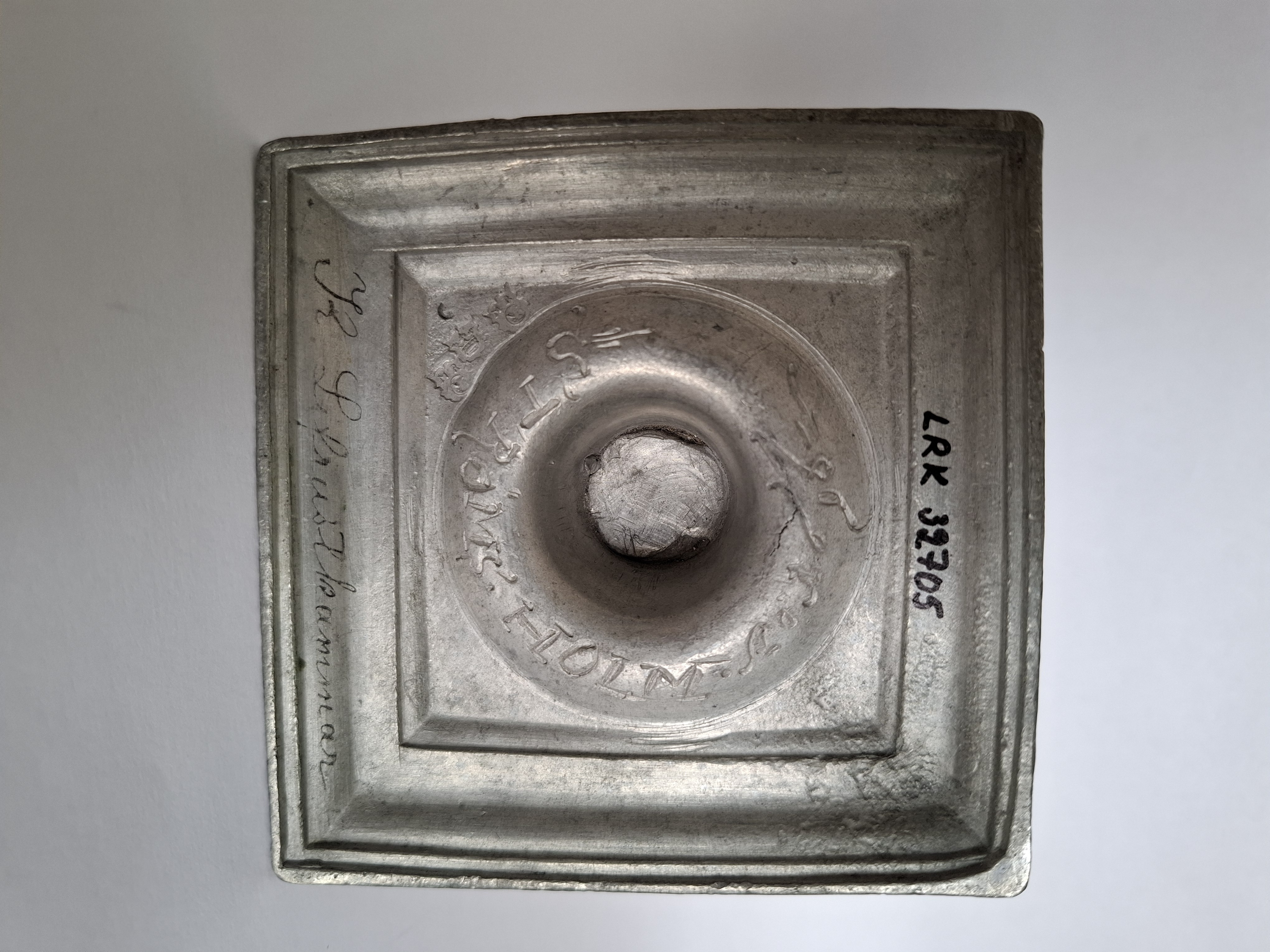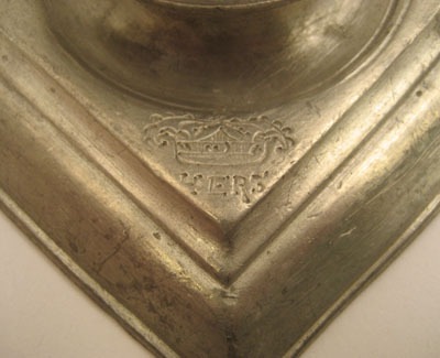 Utförd av Mårten Kasper Rokus, tenngjutarmästare i Stockholm 1683-1714. Ingår i Strömsholmsservisen. Ytterligare delar finns bl a på Nationalmuseum och på Nordiska museet. Tennljusstake med cylindrisk ljuspipa och smal manschett. Profilerad stam med rund droppskiva över kvadratisk fotplatta med mittpartiet nedsänkt till en droppskål. I fotplattans ena hörn graverat: "HERS" (Hedvig Eleonora Sueciae) under kunglig krona. På undersidan "STRÖMSHOLM 1696". Trestämpling på fotplattans undersida samt årsbokstav. 1) 2) Mästarstämpel Mårten Kasper Rokus märke "MR" i antikvaversaler över månskära med ansiktsprofil i mindre kontursköld. (Bruzelli A 70 b) 3) Stockholms stadsstämpel, i form av öppen krona på kontursköld (Bruzelli A 89) 4) Årsbokstav C i antikvaversal betecknande året 1696.