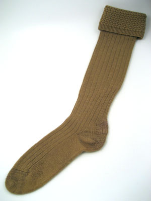 Rundstickad blekt gulgrön yllestrumpa. Ribbstickad. Nedvikt kant upptill med mönsterstickning, 70 mm bred, varav 15 mm av den övre kanten är resårstickad.