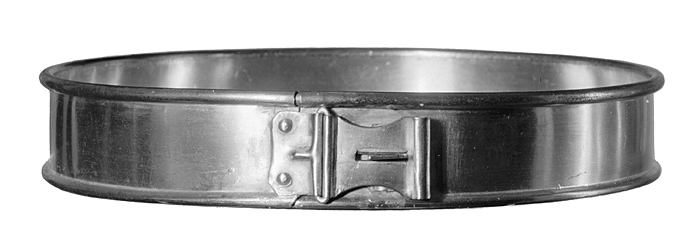 TÅRTFORM (s. k. springform) Av bleckplåt. Rund, med rakt uppstående sarg och löstagbar botten. Sargen på ett ställe avskuren, ändarna sammanhållna på utsidan medelst ett lås, bestående av en hasp på ena delen och en tunn nabb på den andra; kring sargens övre kant en utstående stav, kring nedre kanten en invikt fals, vari botten fasthålls. Botten plan, av tunn plåt. Då låset öppnas, vidgas sargen och botten blir fri. Höjd: 3,9 cm.; diameter: 22,8 cm
