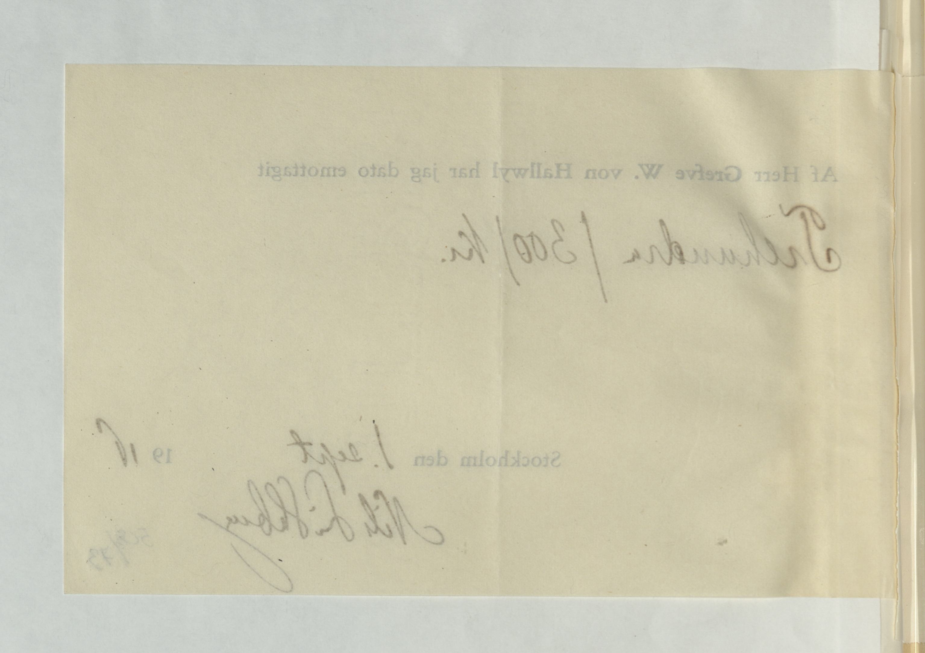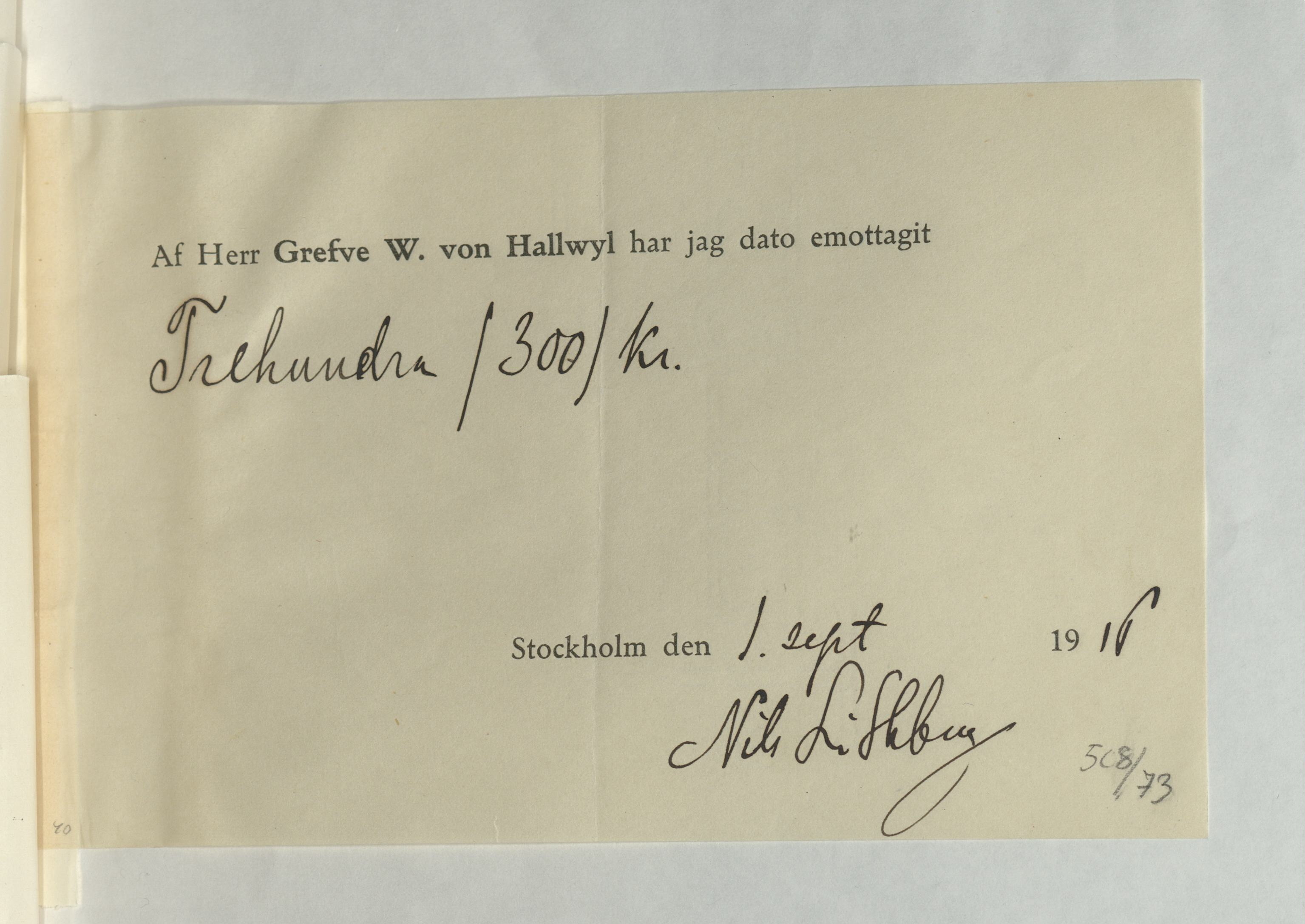 Emottagande av arvode från greven Walther von Hallwyl till Nils Lithberg, 1 september 1916.