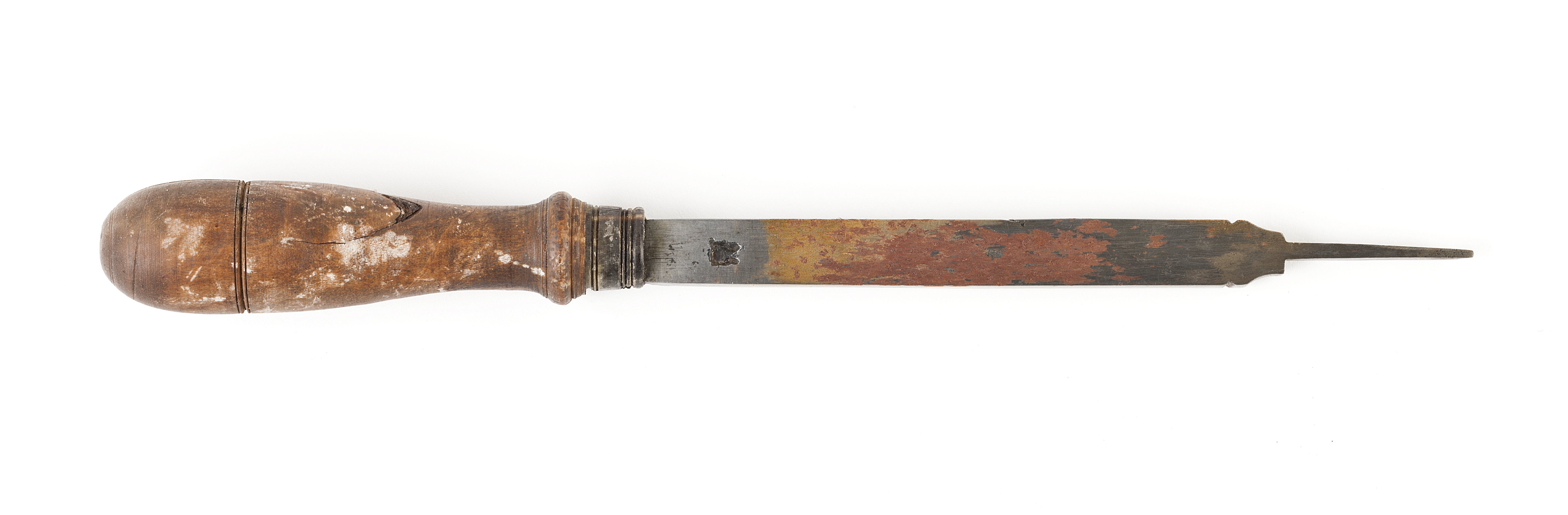 Klinga med rektangulär genomskärning, via profilering på två sidor övergående i smal ände. Stämplat på klingan: oxenstiernska vapnet. Svarvat skaft av päronträ, med en vulst nedtill. Hornring.