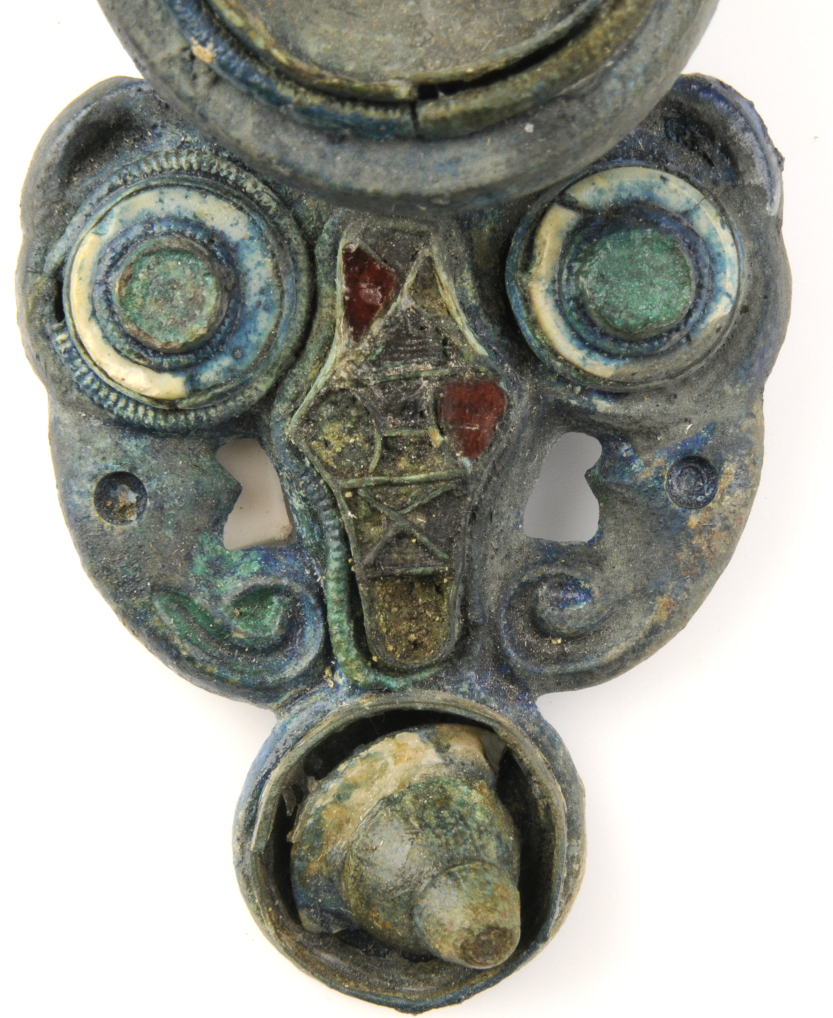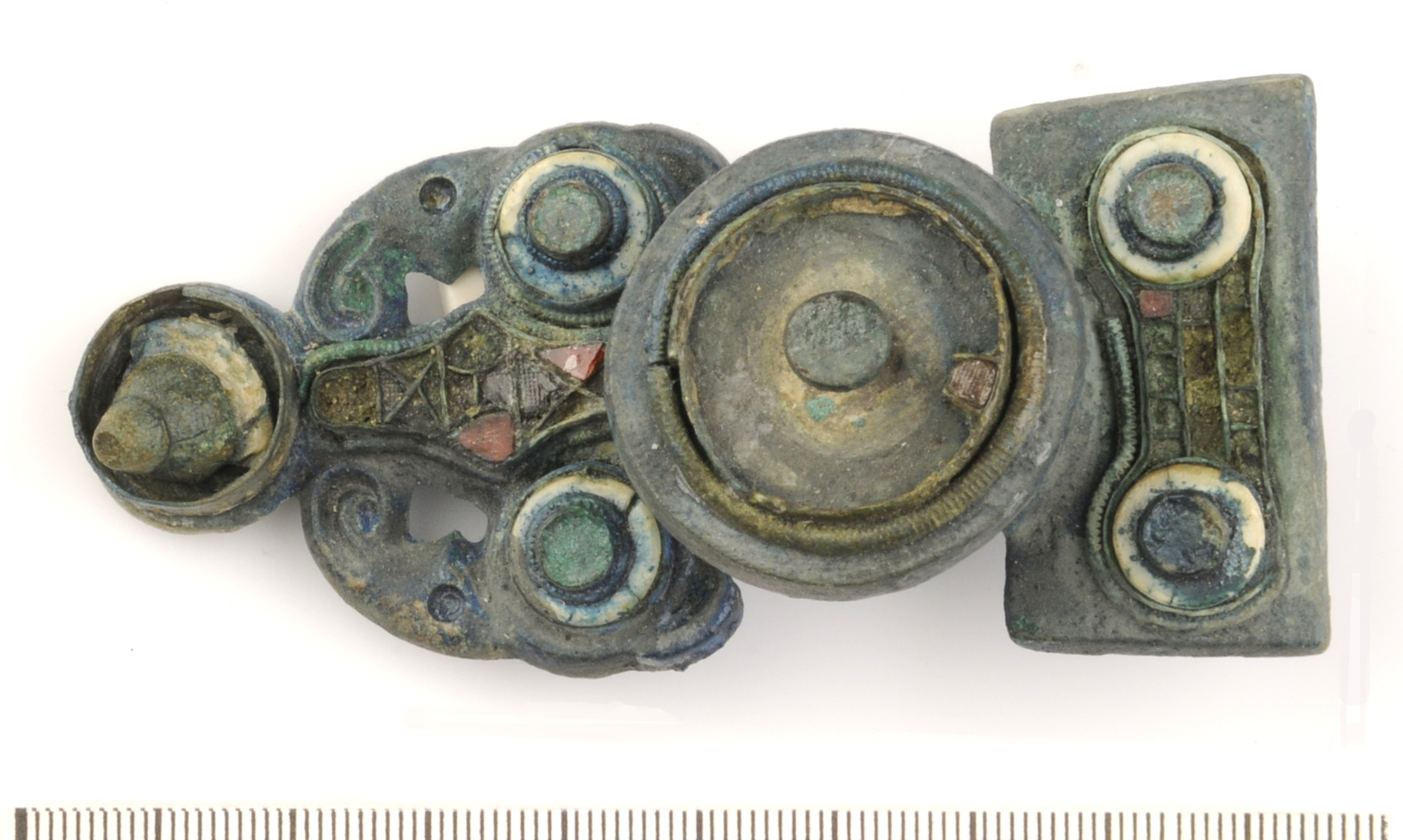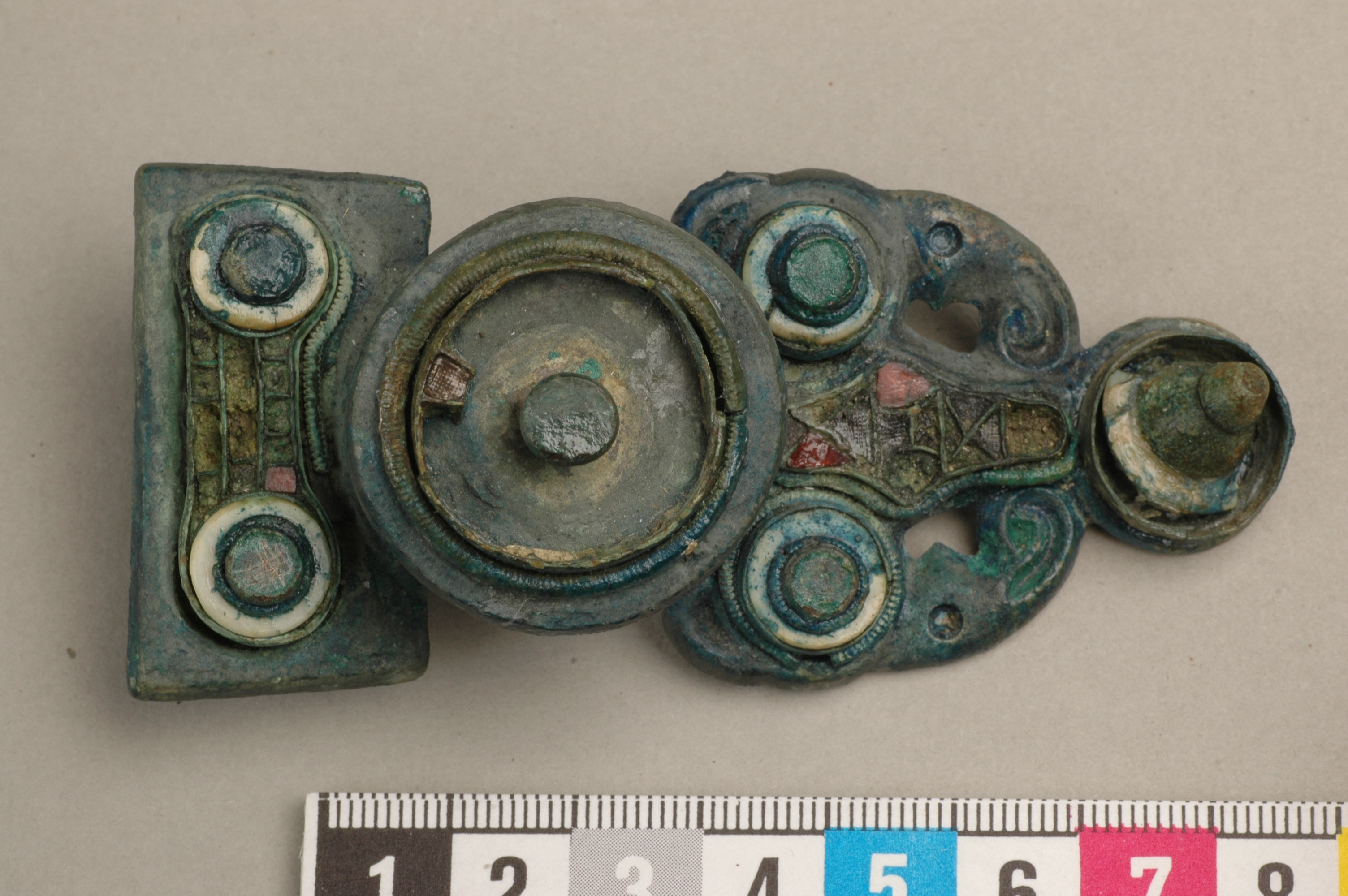 Ryggknappspänne med inlagda granater i cloisonné.