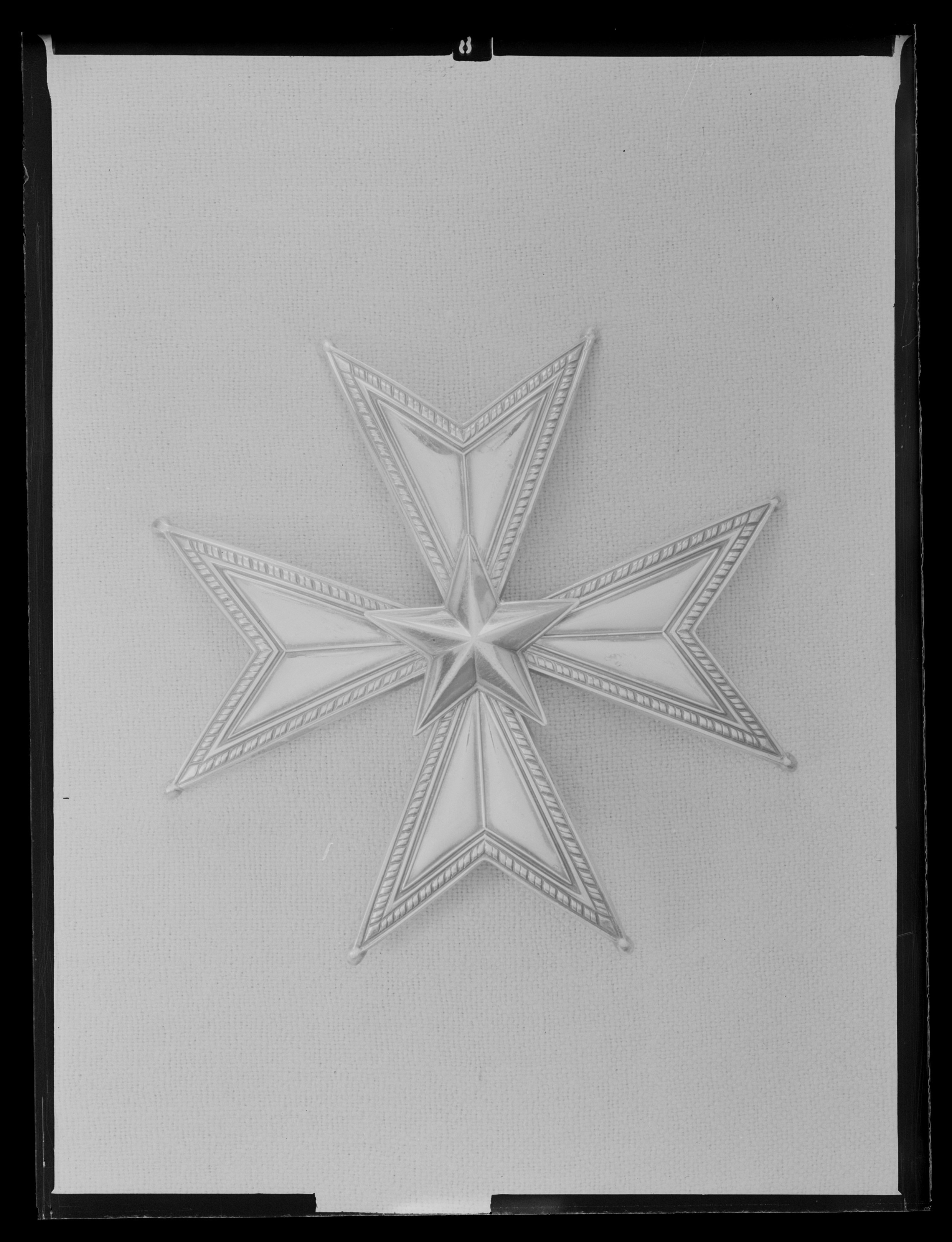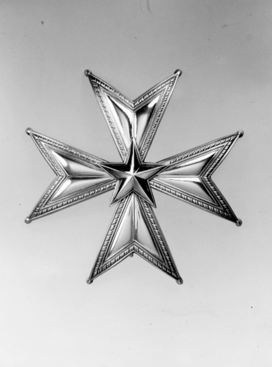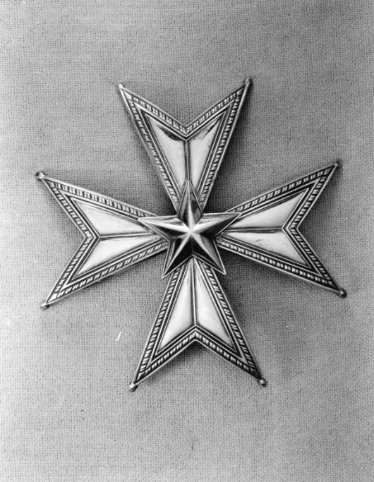 Malteserkors av pressad silverplåt, delade armar med repstavskant, ovala kulor på spetsarna. I mitten femuddig. fasetterad stjärna. På baksidan vertikalt placerad säkerhetsnål, stämplar på nålfästet: "CFC, tre kronor, S, S:t Erik, B 9" (C F Carlman, Stockholm 1952).