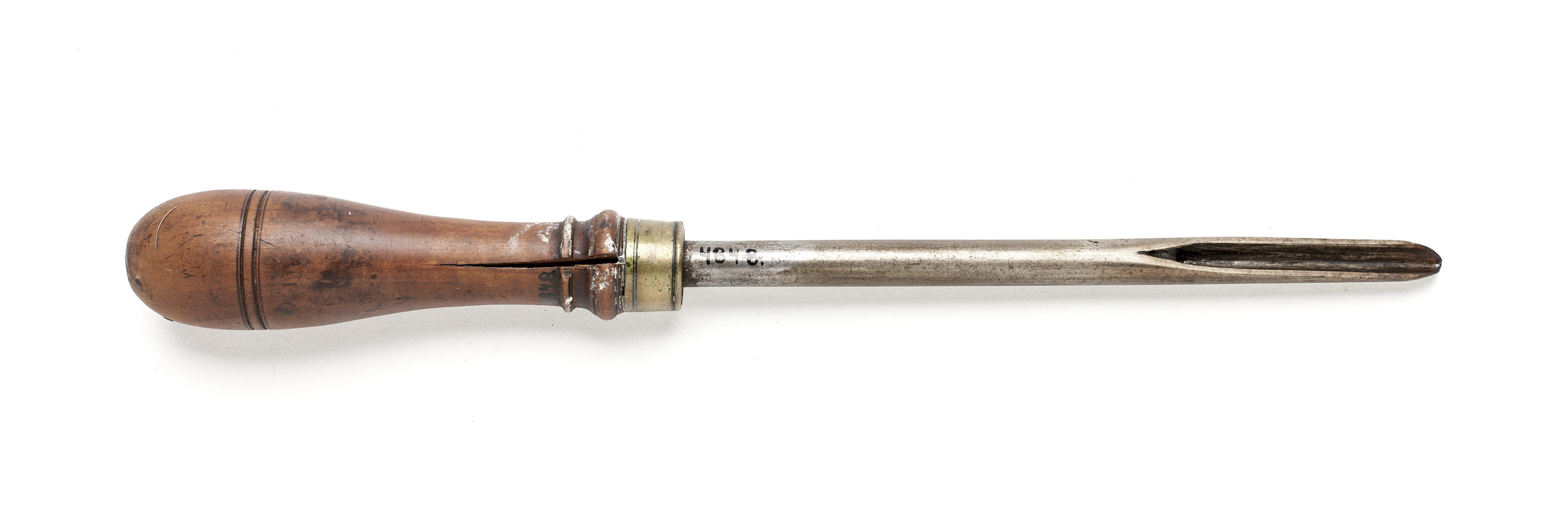 Rund klinga. Svarvat skaft av päronträ med två vulster nedtill ("skoklostertyp"). Mässingsring. Stämpel i skaftets ände vid fästet: "38"? med stansar nr 5375.