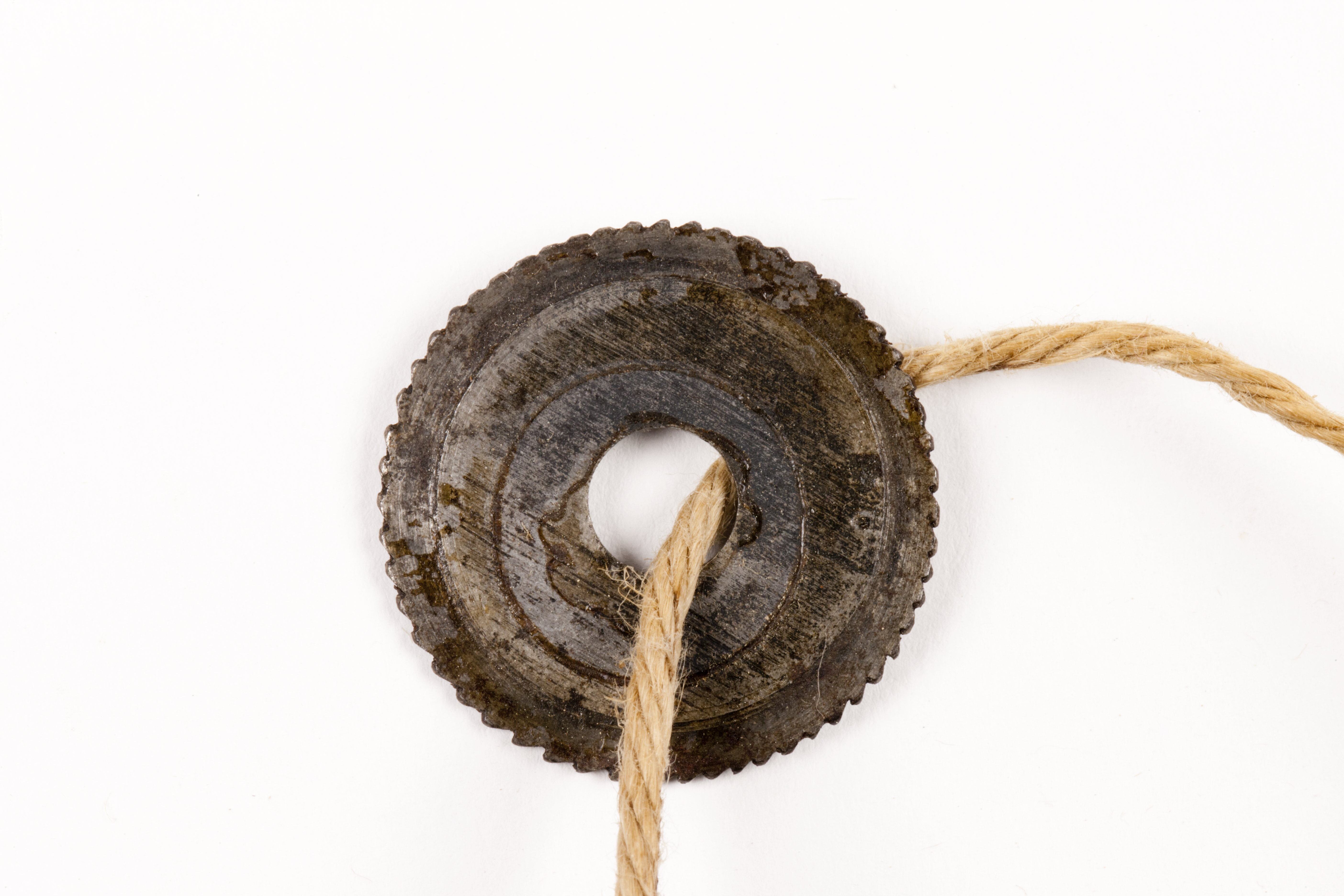 Rund, tjockare mot mitten. Tvärgående tänder. Stämplad med en punkt.