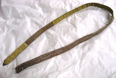 Hölstren till samma Sadel af Gul Saffian, beslagne hvardera nedan omkring på ändarne , och midtpå med rent utarbetadt Silfver; Remmarne däruti med en grann Tråd af Silfver genomdragen och därtill 2ne st Söljor af Silfver.