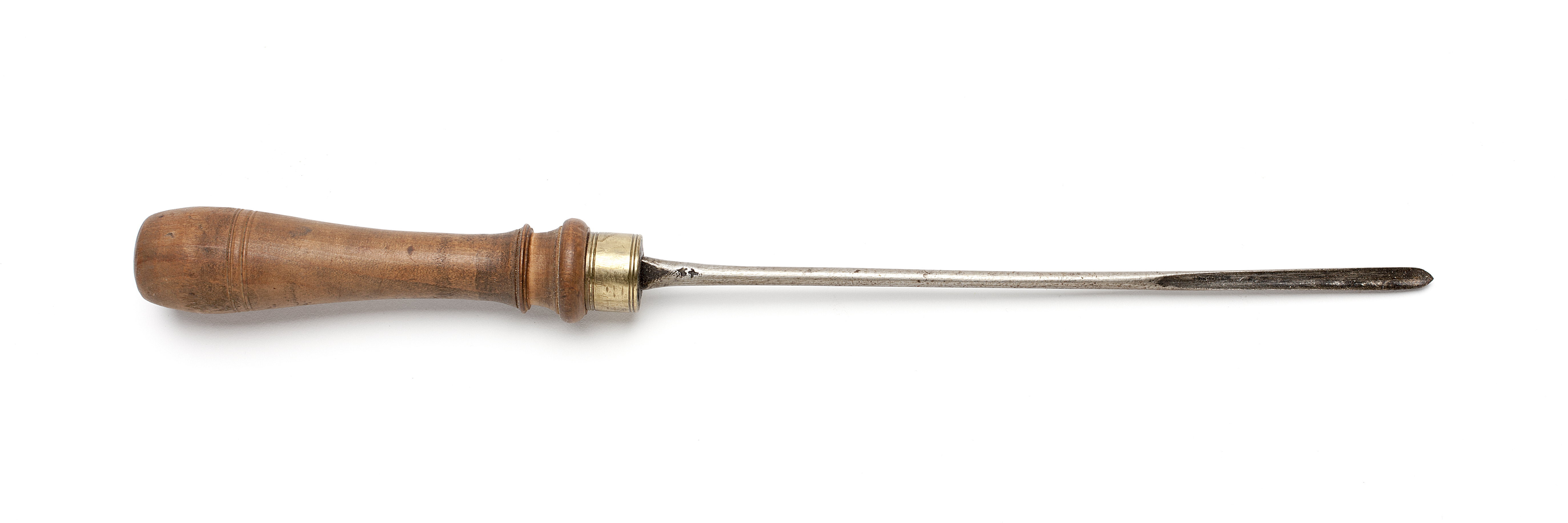 Rund klinga. Spetsoval egg. Stämplat på klingan: hjärta under kors. Svarvat skaft av päronträ, med två vulster nedtill ("rydboholmstyp"). Mässingsring.
