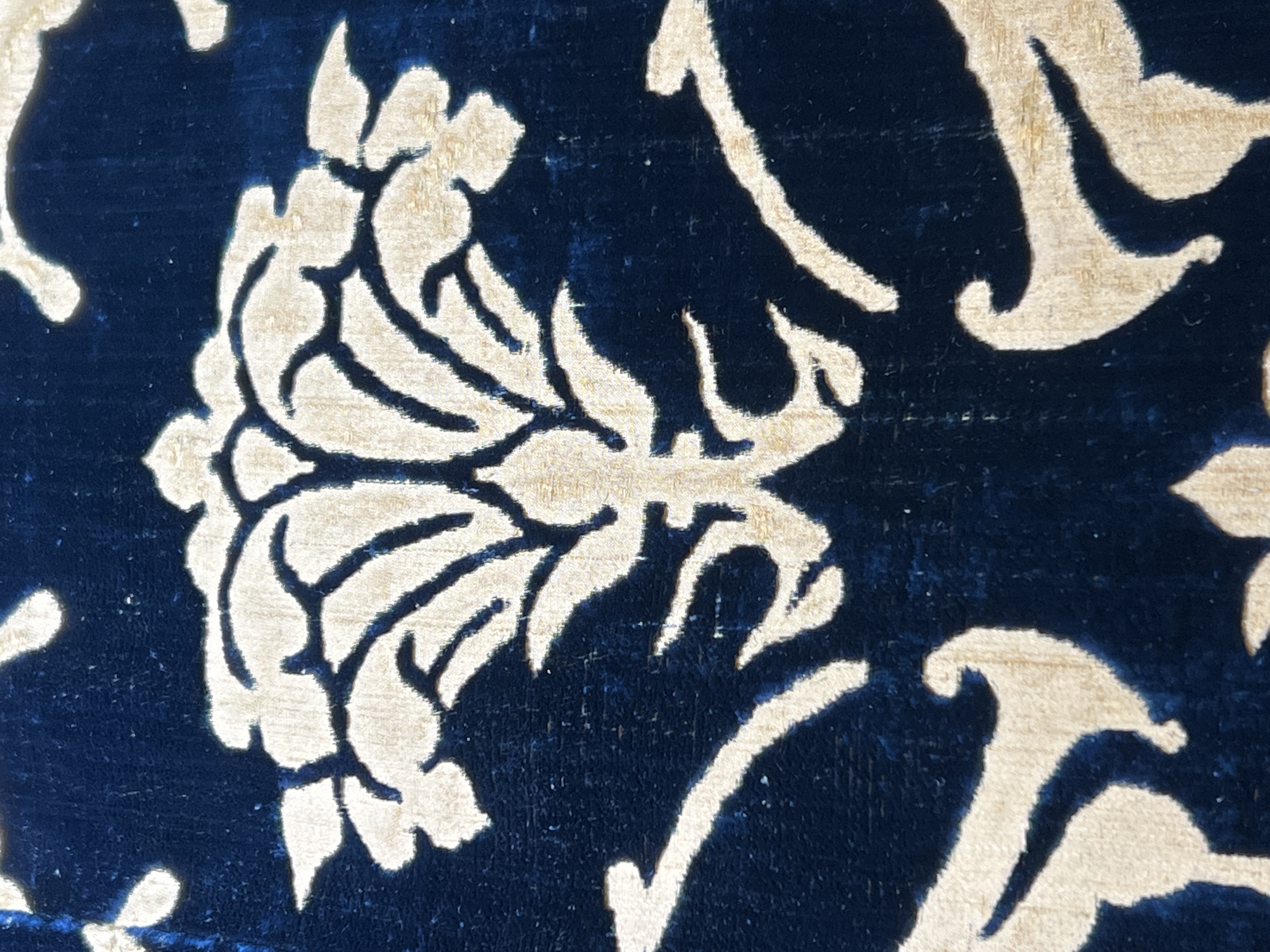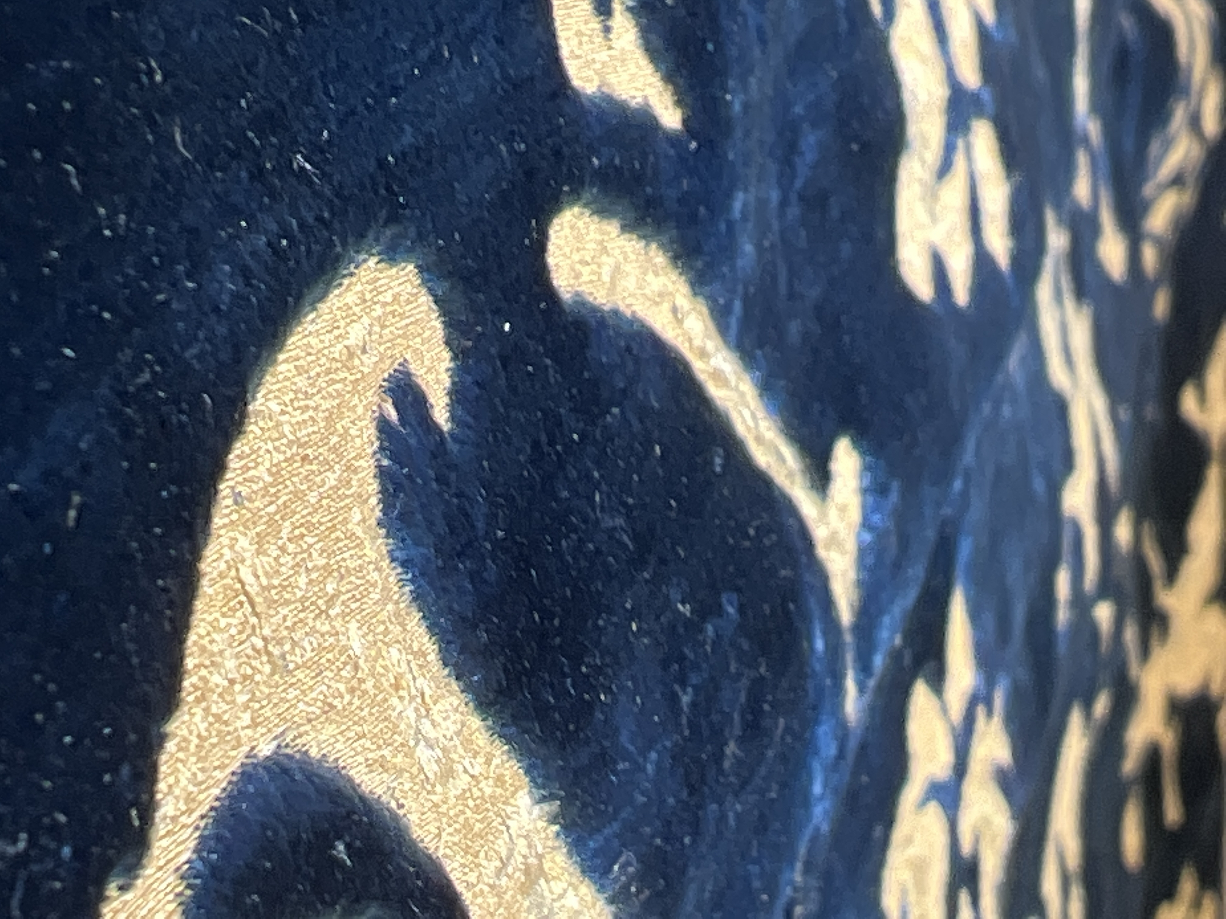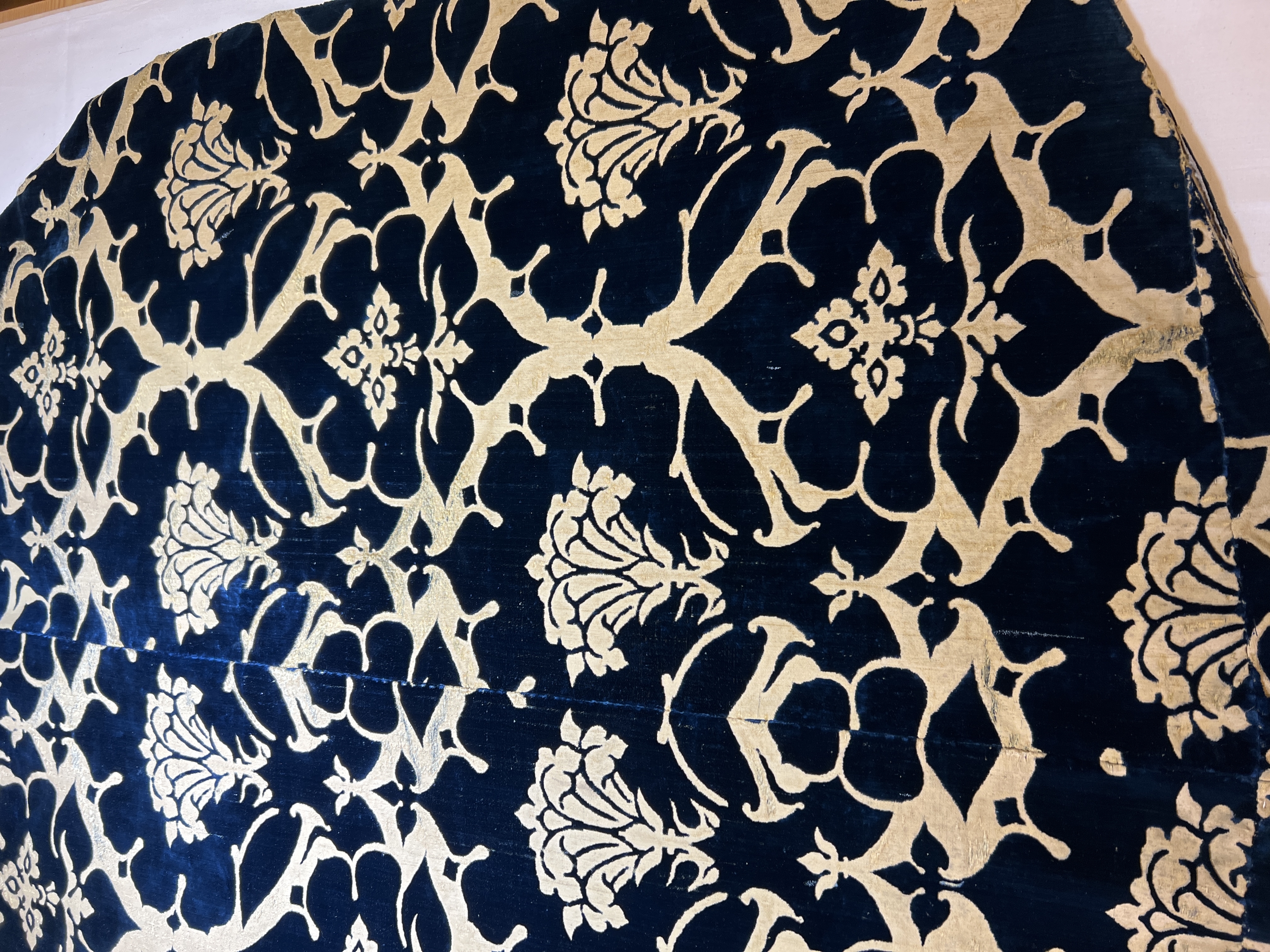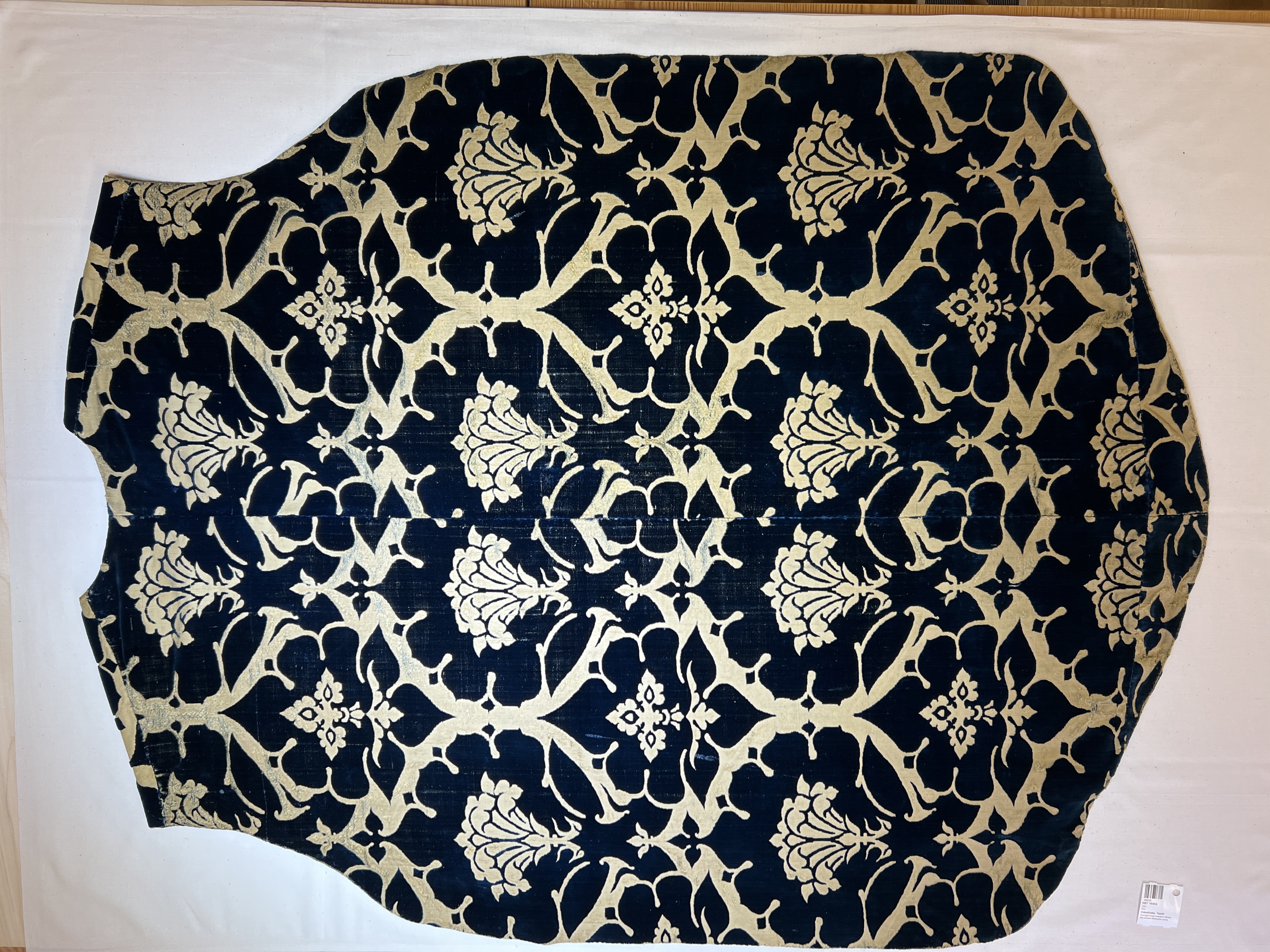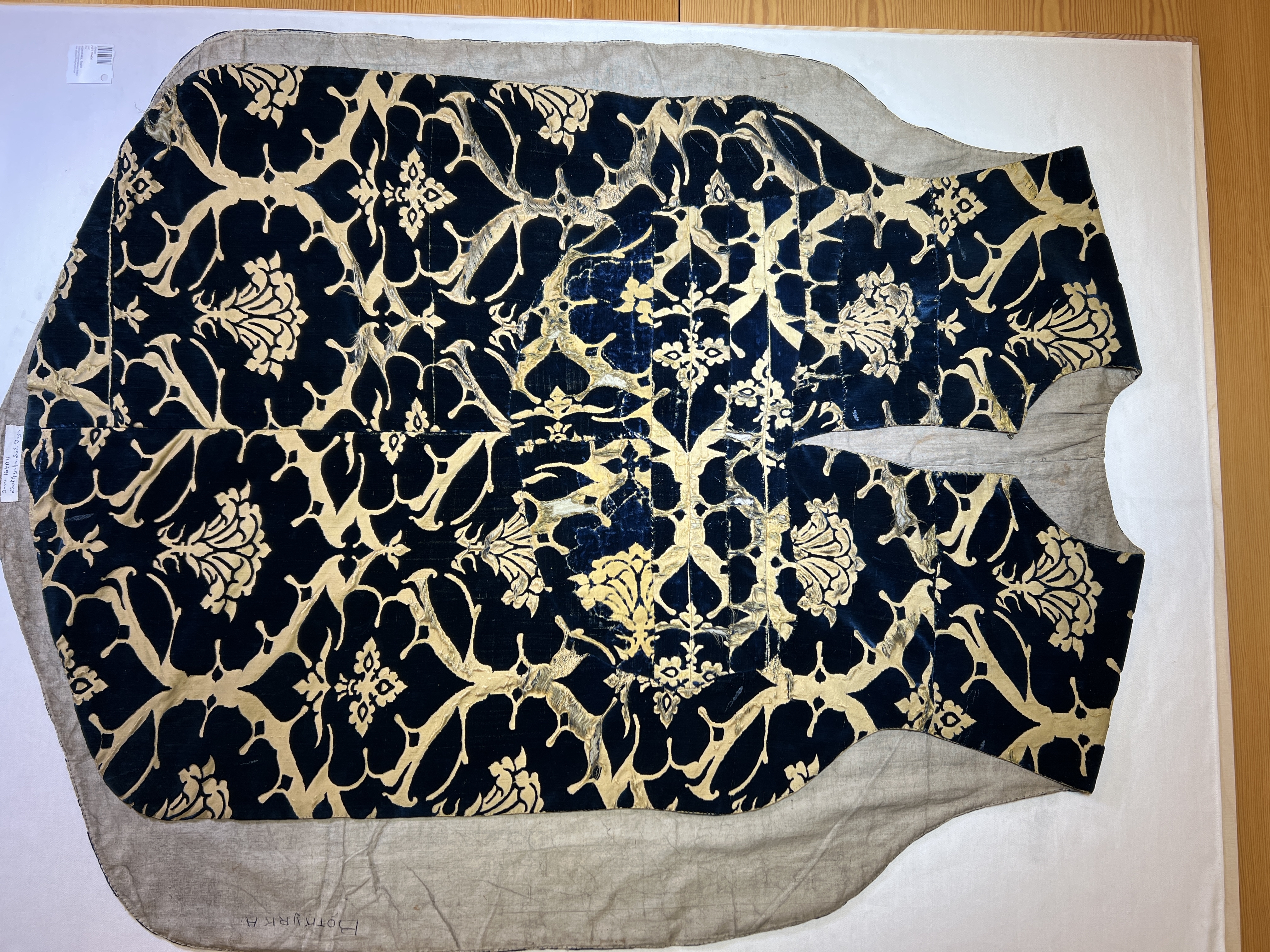 Blågul mönstrad sammet, gråvitt linnefoder. Deponerad i SHM 1920.