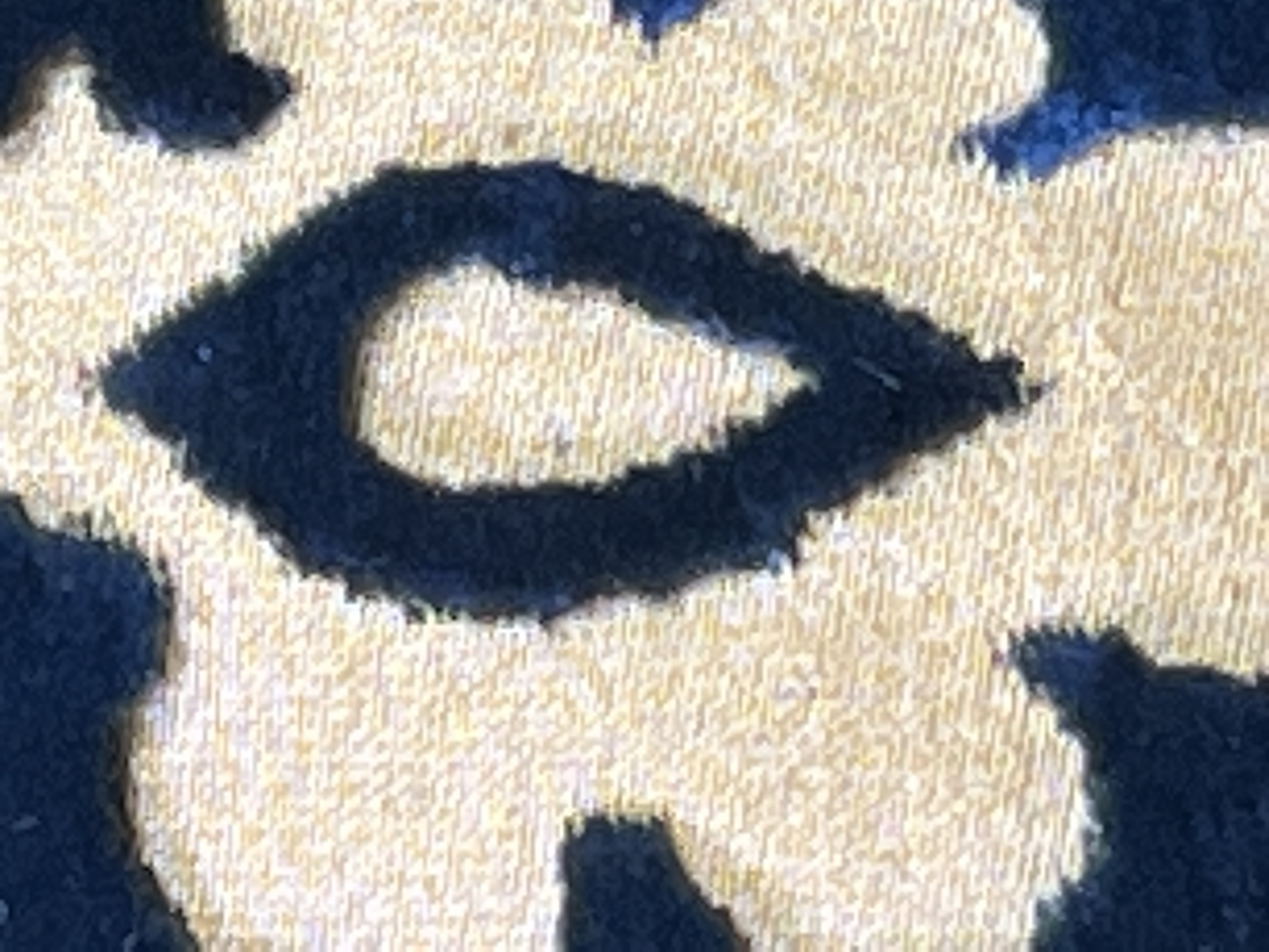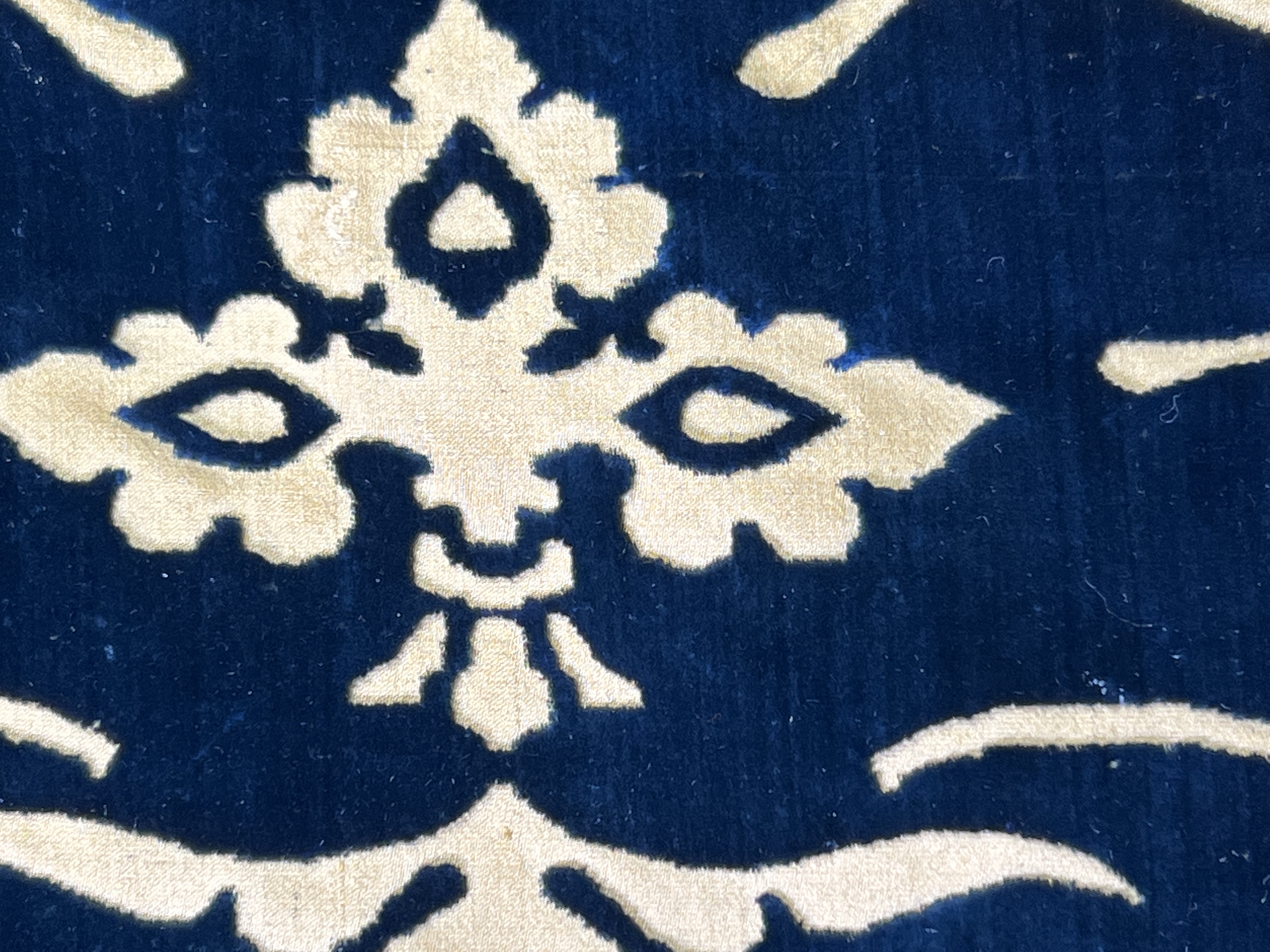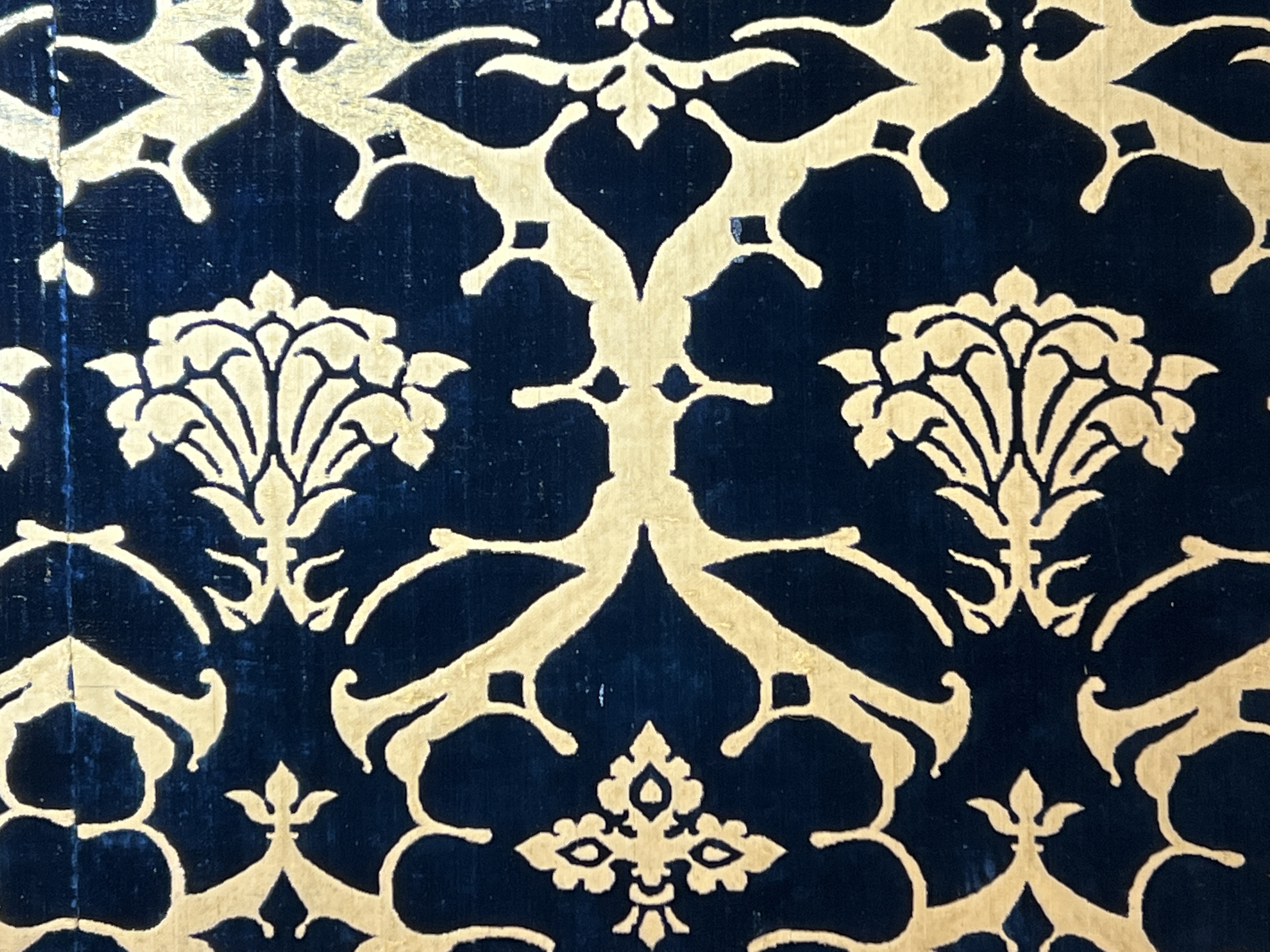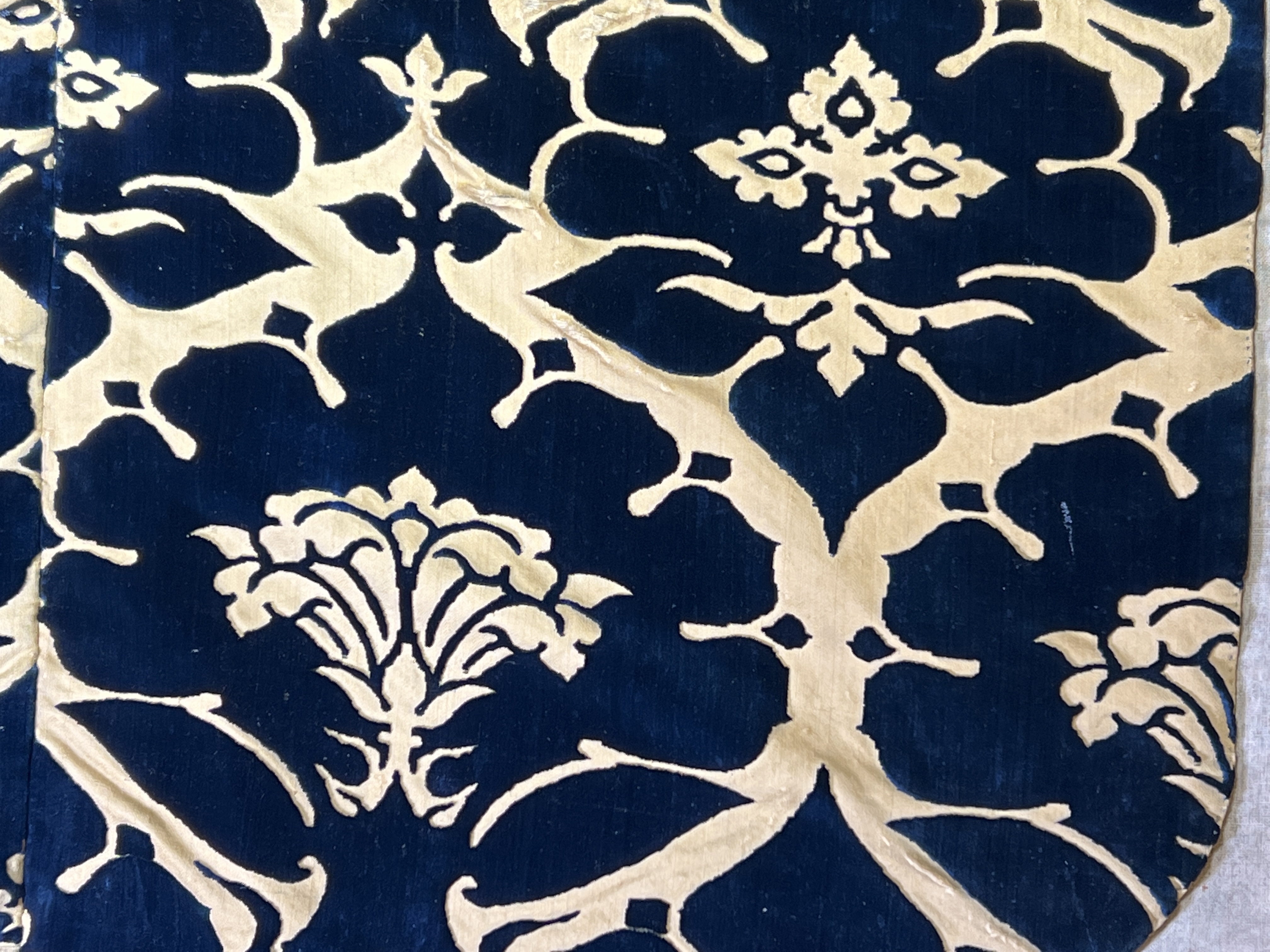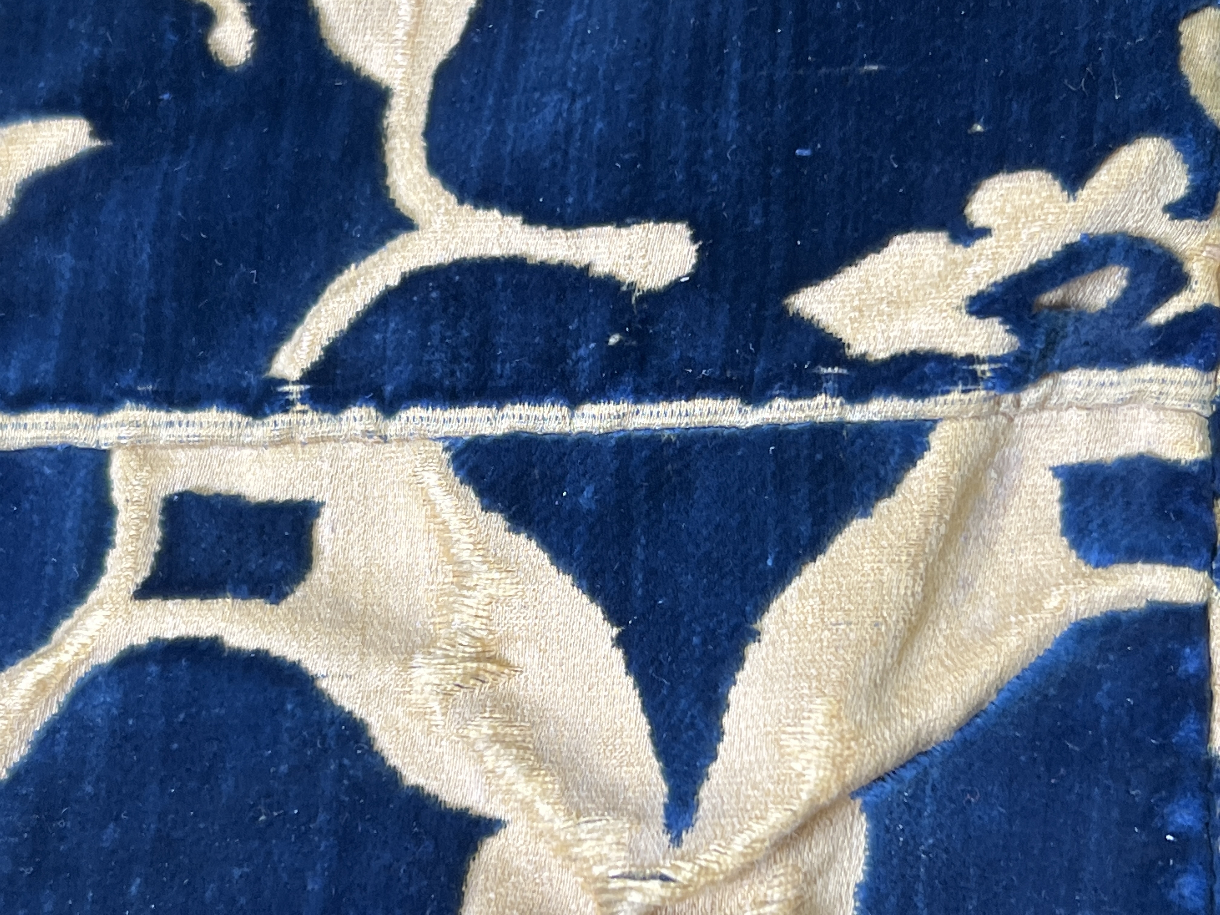 Blågul mönstrad sammet, gråvitt linnefoder. Deponerad i SHM 1920.