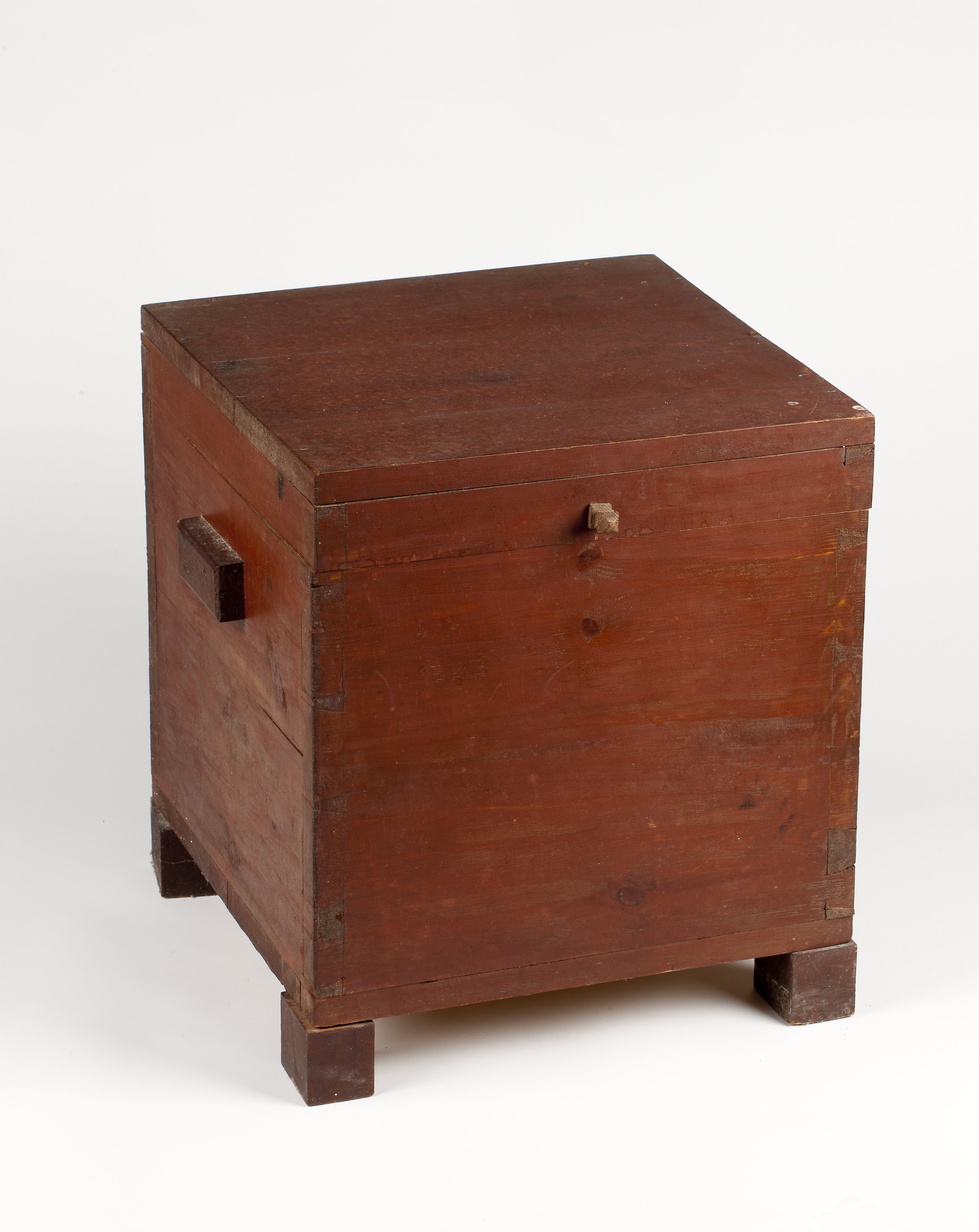 Enkel låda med lock , tre klossformade fötter , handtag på sidorna och knopp på lockets framsida. Sits saknas. Hemgjord , 1800- tal.