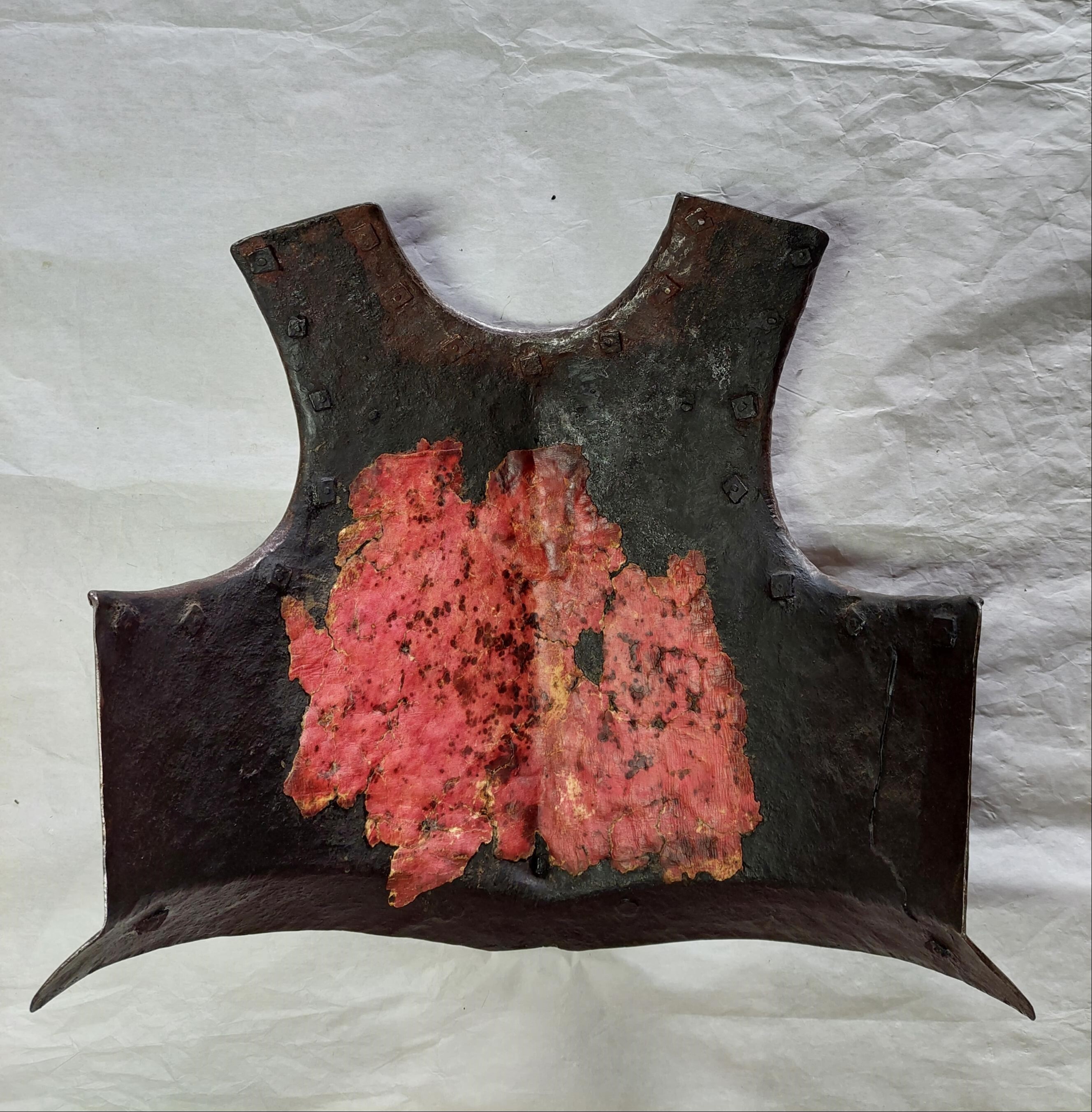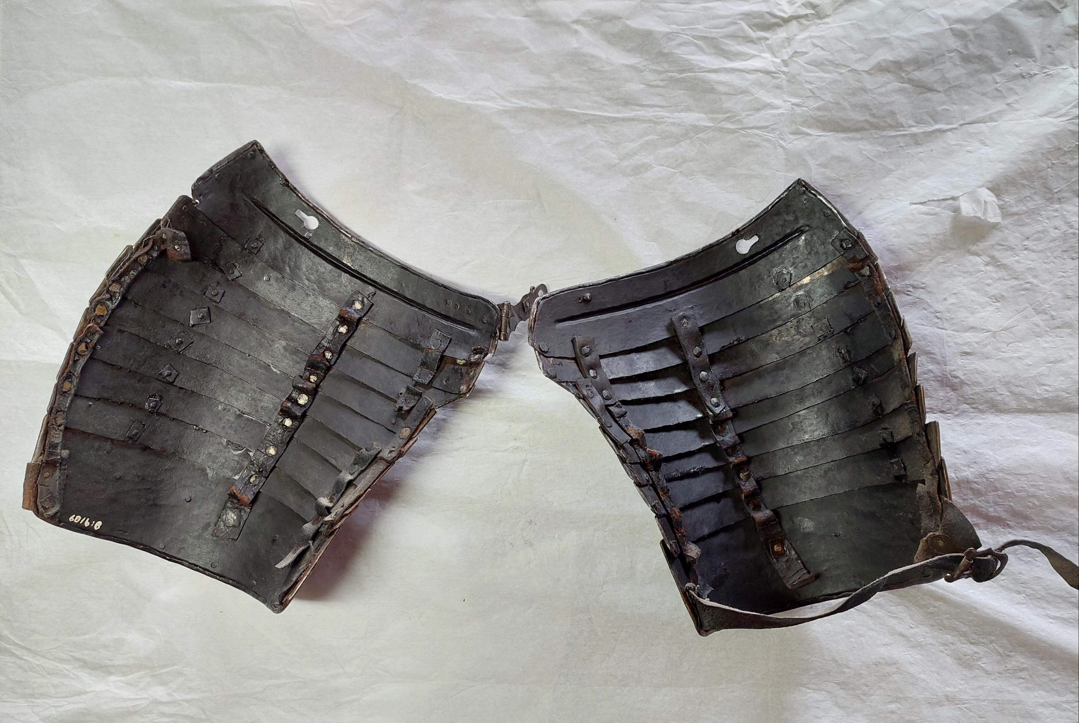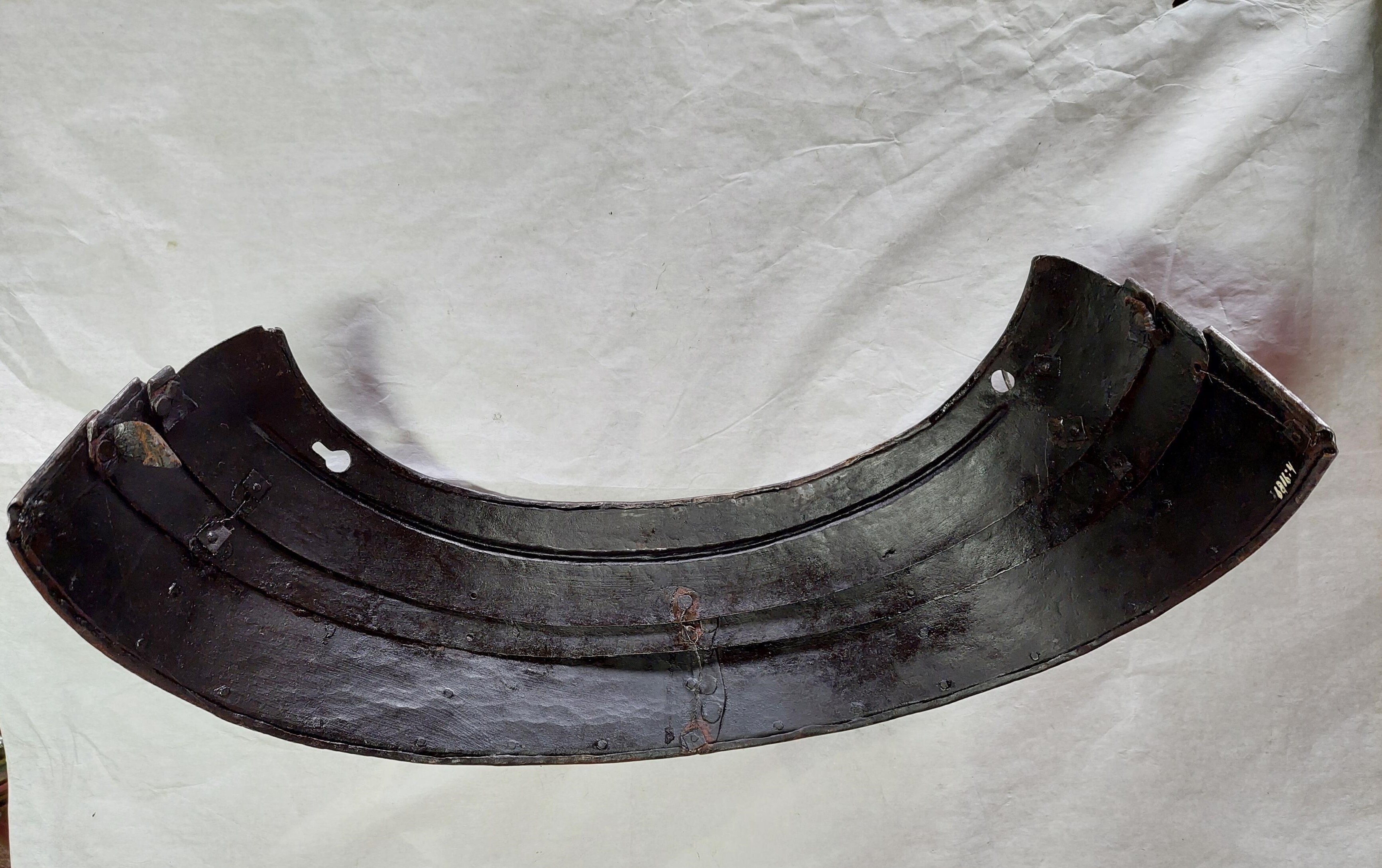 KOMPLETTERANDE BESKRIVNING Fältrustning för kavalleri av bättre kvalité. 6816:1 Bröstharnesk med i hals- och armringning utåt omvikta, rundsmidda kanter. Innanför dessa stålnitar med pålödda mässingsskållor. Dessa har sannolikt hållit läderfodret. Spår at rött fastlimmat läderfoder mitt på harneskets insida. Igensatta hål på utviket mitt fram. Bröstplåten torde vara skottfri med 6 mm tjock plåt. 6816:2 Ryggharnesk med i hals- och armringning, samt nederkant som är inåt omvikta och rundsmidda . Innanför dessa (ej vid nederkanten) stålnitar med pålödda mässingsskållor. Insidan med senare svart bemålning. Axellädret är sannolikt utbytt, möjligen återanvänd profilerad stålbricka. 6816:3 Halskrage med inåt omvikta, rundsmidda ytterkanter. Lings dessa stålnitar med pålödda mässingsskållor. Remmarna vid axlarna har gått av.. 6816:4 Ländskört med inåt omvikta, rundsmidda ytterkanter och stålnitar med pålödda mässingsskållor. De två nedersta lamellerna är skarvade mitt på. Insidan senare bemålad med svart färg. Spår av läder. Delarna hålls primärt samman av ståltråd. 68116:5-6 Axelstycken med inåt omvikta, rundsmidda ytterkanter samt stålnitar med pålödda mässingsskållor. Insidan är senare svartmålad och större delen av lädret är bytt under 1900-talet, då maskingjorda nitar har använts. Man har däremot återanvänt äldre nitar också. 6816:7-8 Tassetter med inåt omvikta, rundsmidda ytterkanter. Stålnitar med pålödda mässingsskållor. Lamellerna nitade i varnade i avlånga hål i ytterkant men på remmar i mitten och i innerkant. Delar av lädret bytt. Lårremmen av äldre typ, sannolikt ursprungliga spännen (jämför med axelstyckenas spännen). En lårrem saknas på den vänstra tassetten. Vänster tassett med vinklat gångjärn och krok. Delarna har senare svart bemålning på insidan.