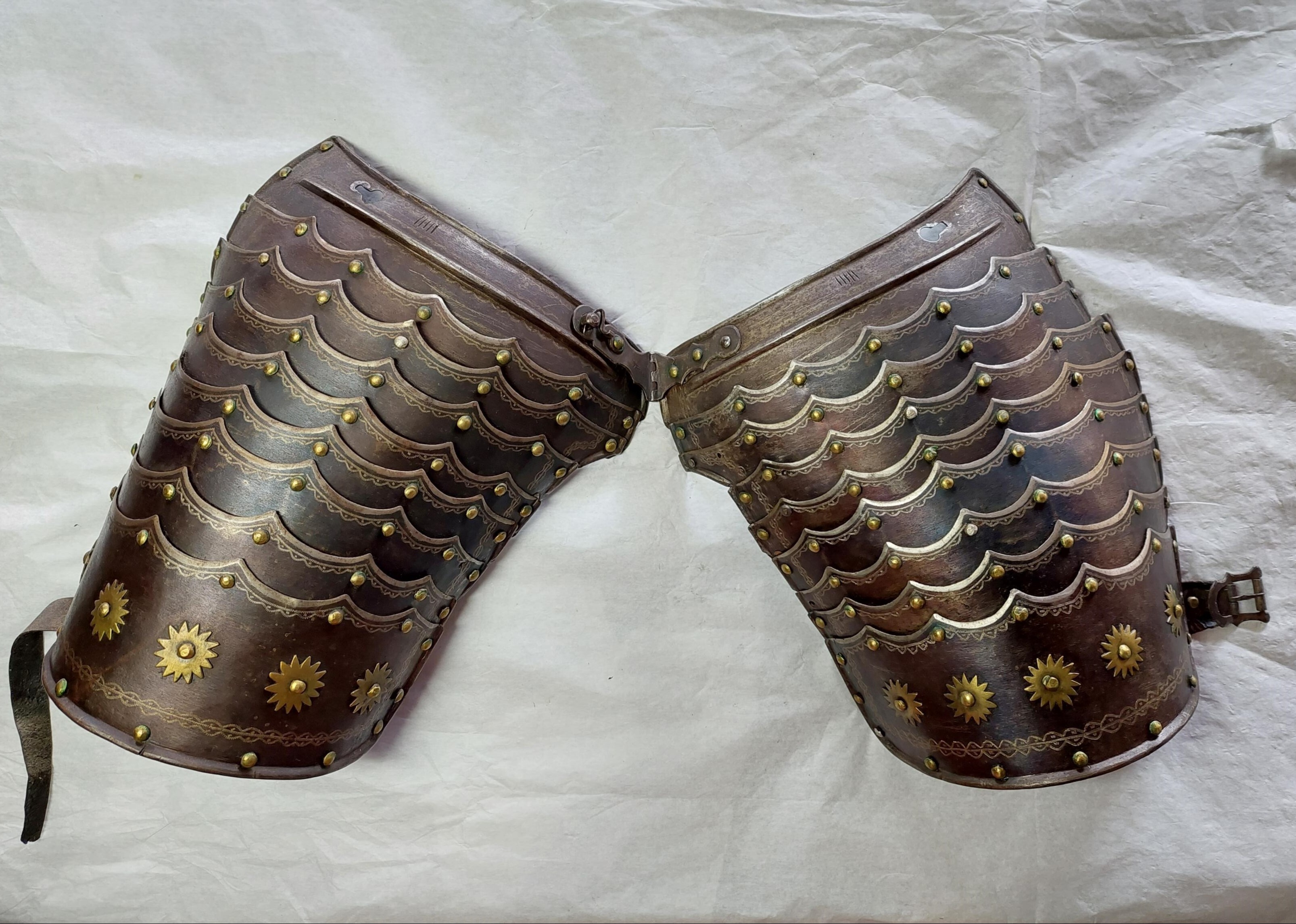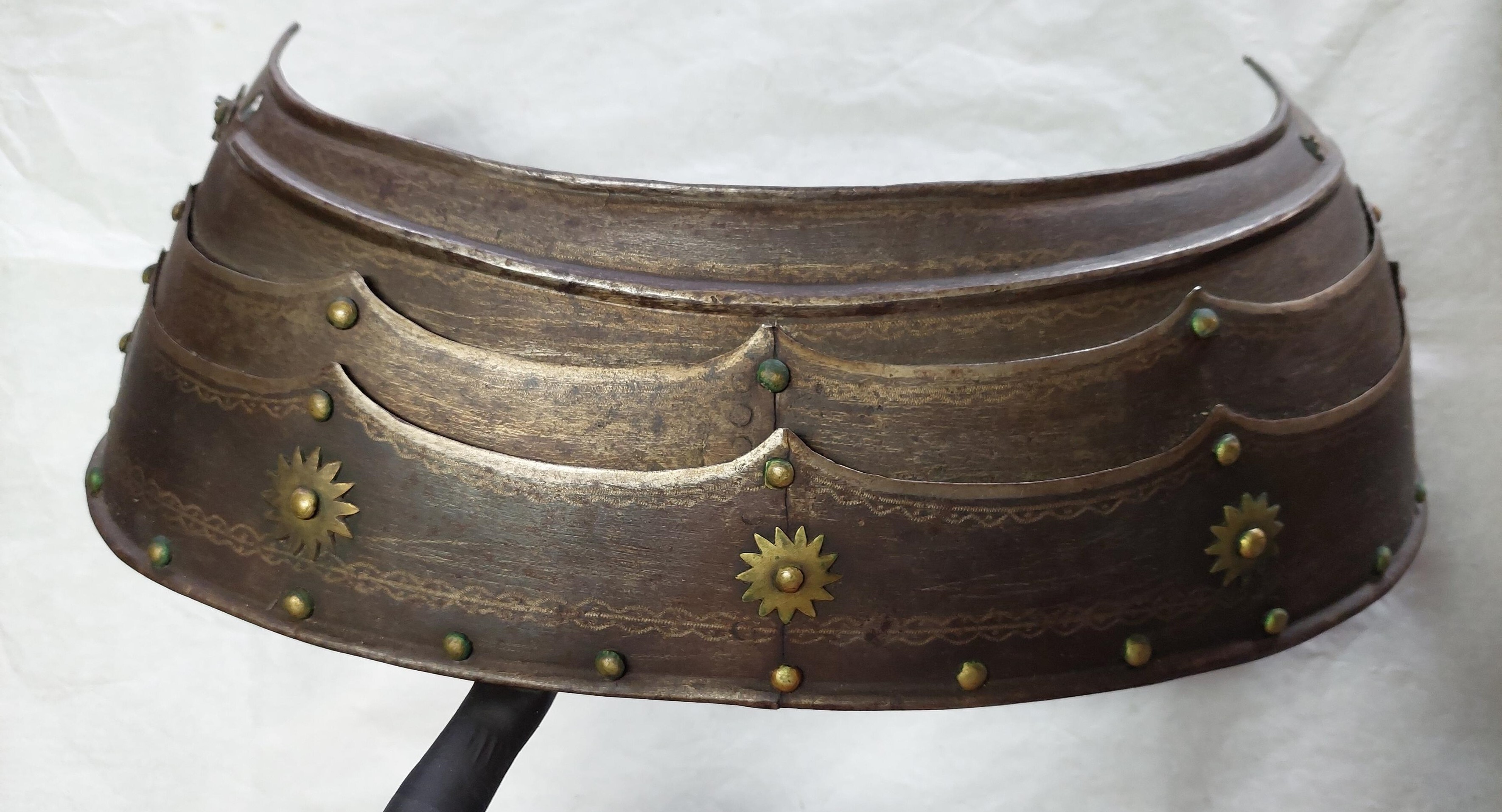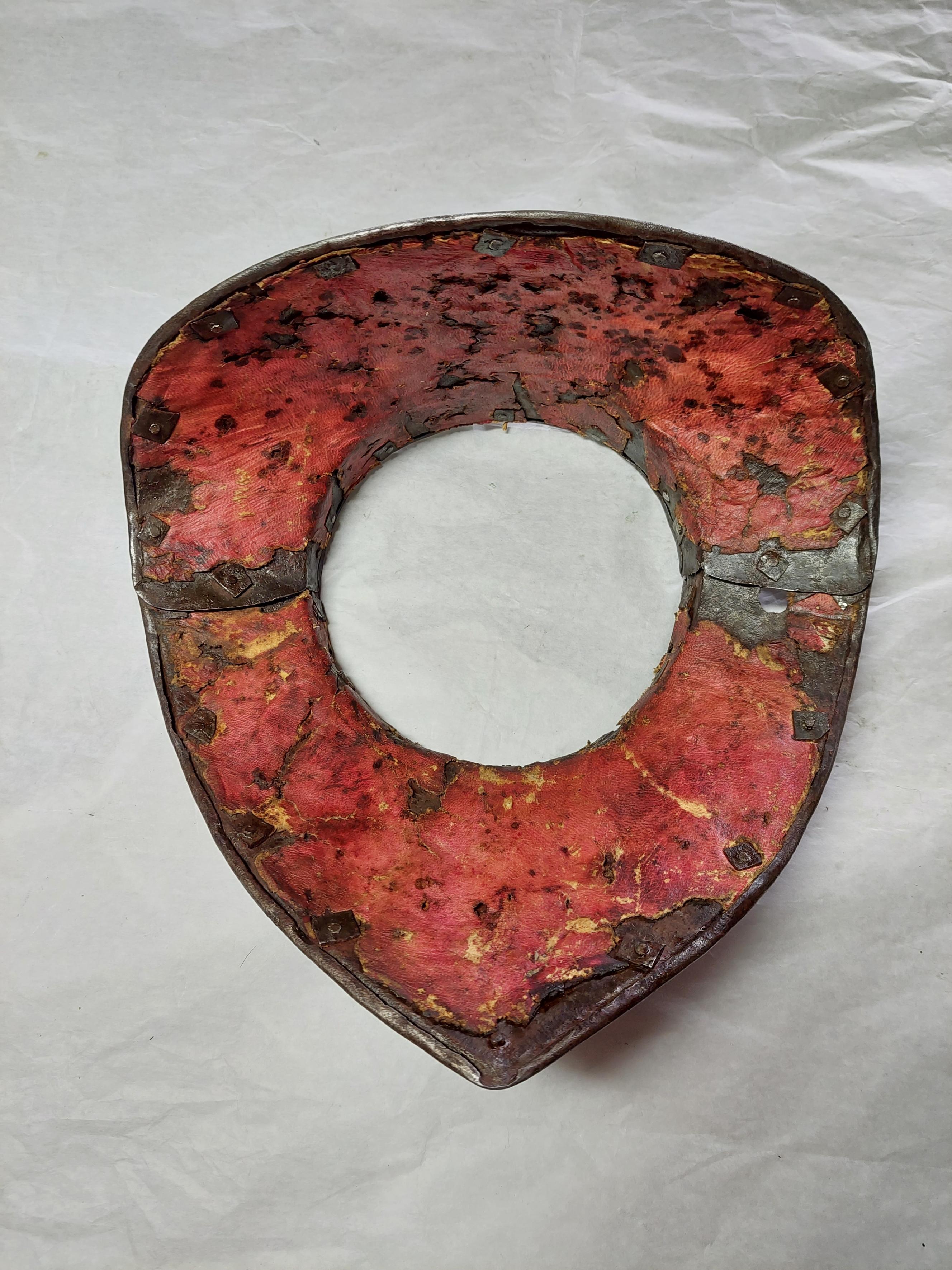 KOMPLETTERANDE BESKRIVNING Fältrustning för kavalleri av bättre kvalité. 6816:1 Bröstharnesk med i hals- och armringning utåt omvikta, rundsmidda kanter. Innanför dessa stålnitar med pålödda mässingsskållor. Dessa har sannolikt hållit läderfodret. Spår at rött fastlimmat läderfoder mitt på harneskets insida. Igensatta hål på utviket mitt fram. Bröstplåten torde vara skottfri med 6 mm tjock plåt. 6816:2 Ryggharnesk med i hals- och armringning, samt nederkant som är inåt omvikta och rundsmidda . Innanför dessa (ej vid nederkanten) stålnitar med pålödda mässingsskållor. Insidan med senare svart bemålning. Axellädret är sannolikt utbytt, möjligen återanvänd profilerad stålbricka. 6816:3 Halskrage med inåt omvikta, rundsmidda ytterkanter. Lings dessa stålnitar med pålödda mässingsskållor. Remmarna vid axlarna har gått av.. 6816:4 Ländskört med inåt omvikta, rundsmidda ytterkanter och stålnitar med pålödda mässingsskållor. De två nedersta lamellerna är skarvade mitt på. Insidan senare bemålad med svart färg. Spår av läder. Delarna hålls primärt samman av ståltråd. 68116:5-6 Axelstycken med inåt omvikta, rundsmidda ytterkanter samt stålnitar med pålödda mässingsskållor. Insidan är senare svartmålad och större delen av lädret är bytt under 1900-talet, då maskingjorda nitar har använts. Man har däremot återanvänt äldre nitar också. 6816:7-8 Tassetter med inåt omvikta, rundsmidda ytterkanter. Stålnitar med pålödda mässingsskållor. Lamellerna nitade i varnade i avlånga hål i ytterkant men på remmar i mitten och i innerkant. Delar av lädret bytt. Lårremmen av äldre typ, sannolikt ursprungliga spännen (jämför med axelstyckenas spännen). En lårrem saknas på den vänstra tassetten. Vänster tassett med vinklat gångjärn och krok. Delarna har senare svart bemålning på insidan.