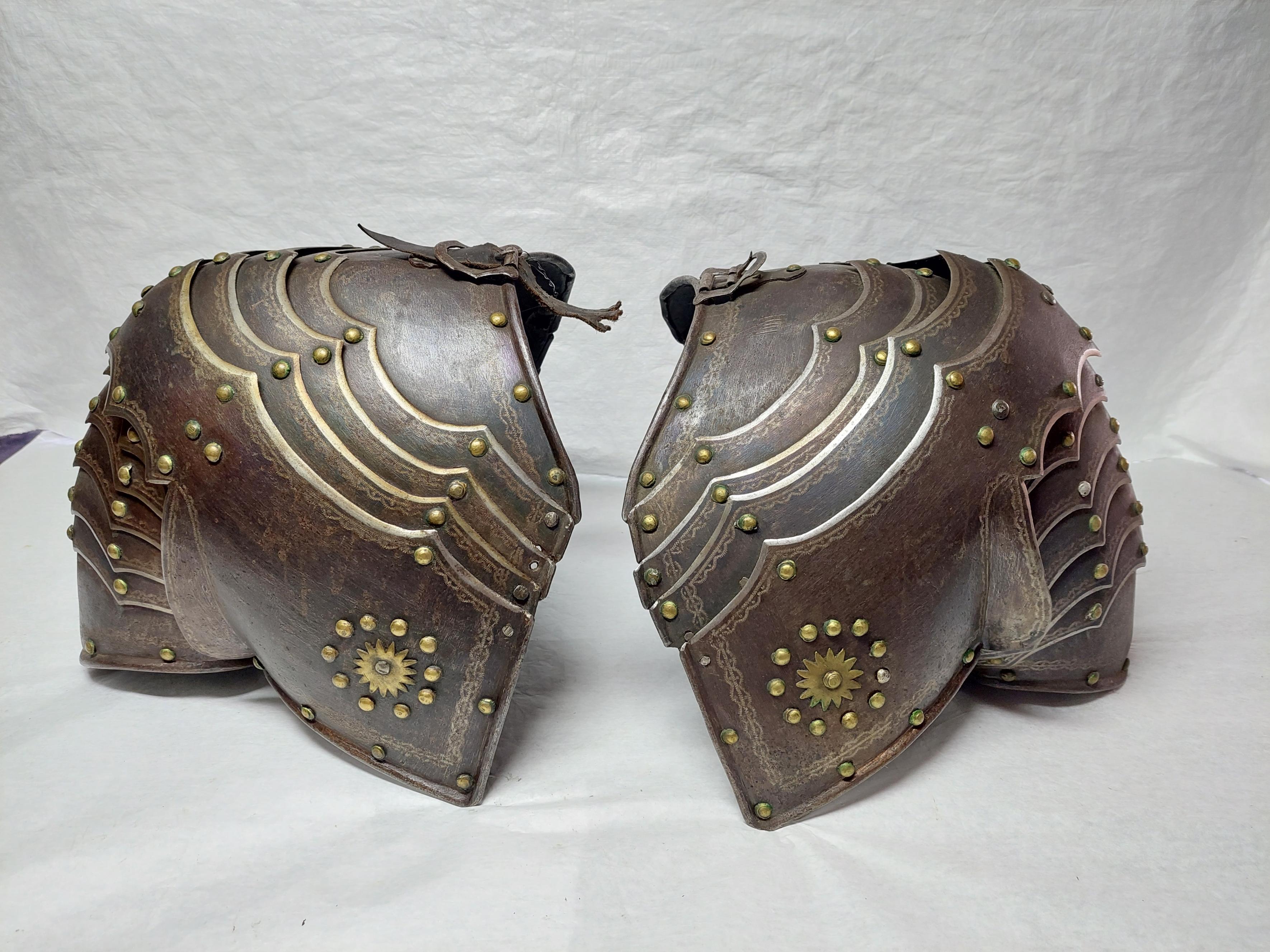 Samtliga delar märkta med 5 inslagna streck. Monterad på stativ inventarienummer Rustningen är gjord av blånerat stål med nitar av mässing. Lamellernas överkanter vågprofilerade och blankpolerade, samt med bårder av graverade uddar och flätband - framträder blanka. Bestående av: Bröstharnesk 6816:1 Ryggharnesk 6816:2 Ringkrage 6816:3 Ländskört 6816:4 H. Axelskydd 6816:5 V. Axelskydd 6816:6 H. tassett 6816:7 V. tassett 6816:8 Hjälm 6817 6816:1 Bröstharnesk. Rundad halskant, lika kring armhålen. Bården kring armhål, hals och utmed den markerade mittåsen, vilken senare mot harneskets nederdel avslutas i liten utbuktning. Bårder även på vardera sidan om mittåsen - snett över sidorna. Mittlinjens överdel avslutas med hjärta. På bröstets vardera sida knopp av stål för fästande av ryggharneskets axelremmar. I nederkanten två knappar för påhakande av tassetterna. Höjd: 330 mm, bröstvidd: 520 mm. 6816:2 Ryggharnesk. Låg, rundad halskant, lika kring armhål. Graverad flätbandsdekor kring hals, vid mittlinje samt snett över sidorna. I vardera axeln fastnitad läderrem med stålbeslagen framände med två knapphål. I vardera sidan fastnitad läderrem - den vänstra med spänne - att spänna kring bröstharneskets midja. Höjd: 395 mm, ryggvidd: 570 mm. 6816:3 Ringkrage. Graverade flätband vid mittlinjen fram och bak. I vardera sidan läderrem att spänna fast i axelstyckenas spännen. Rött läderfoder. Höjd: 140 mm. 6816:4 Ländskört. Bestående av tre lameller. Den undre med fem mässingsstjärnor. Höjd: 140 mm, bredd: 970 mm. 6816:5 Höger axelstycke med överarmsskydd. Axelstycket består av fem lameller. Bröst- och skulderdel med mässingstjärna. Längd: 450 mm, diameter: 490 mm. 6816:6 Vänster axelstycke med överarmsskydd. Axelstycket består av fem lameller. Bröst- och skulderdel med mässingstjärna. Längd: 440 mm, diameter: 480 mm. 6816:7 Höger tassett. Bestående av 9 lameller. Den övre med stålögla för vänster tassetts spänne. Den undre lamellen med fem mässingstjärnor. På insidan av undre lamellen rem och spänne. Höjd: 370 mm, bredd: 350 mm. 6816:8 Vänster tassett. 9 lameller. Den övre med gångjärnsförsett spänne. Den undre med fem mässingstjärnor. På insidan av den undre lamellen finns det ett spänne. Höjd: 360 mm, bredd: 350 mm.