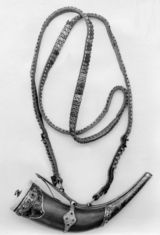 Behållare av kohorn, krumt med spetsig ände. Botten av vitt ben. Öppningen tillsluten med lock av stål på fjädrande skena som följer hornets form. Hornet beslaget med tre beslag av förgyllt silver. Ett beslag vid botten, 37 mm långt på utsidan där det är neddraget i en flik, niellerat blommönster mot ciselerad botten med liten ranka. Runt kanten sex stenar i rosettformiga fattningar, tre röda bevarade. Smalt mittbeslag med vidgat mittparti, 20 mm brett, med ciselerade blad och på framsidan fyra små stenar, varav två röda och en grön bevarats. Runt mynningen 116,5 mm brett beslag med avslutande flik, niellerat blommönster mot ciselerad rankmönstrad grund. Runt nedre kanten stenar i samma fattning som vid botten, tre röda och en grön sten bevarade, tre stenar borta. På bottenplattan en ciselerad bygel i förgyllt silver. I stålskenan på ovansidan är fäst en bärrem av brunt läder tätt besatt med små s-formade beslag av silver, med fågelhuvuden. Remmen ca 11 mm bred.