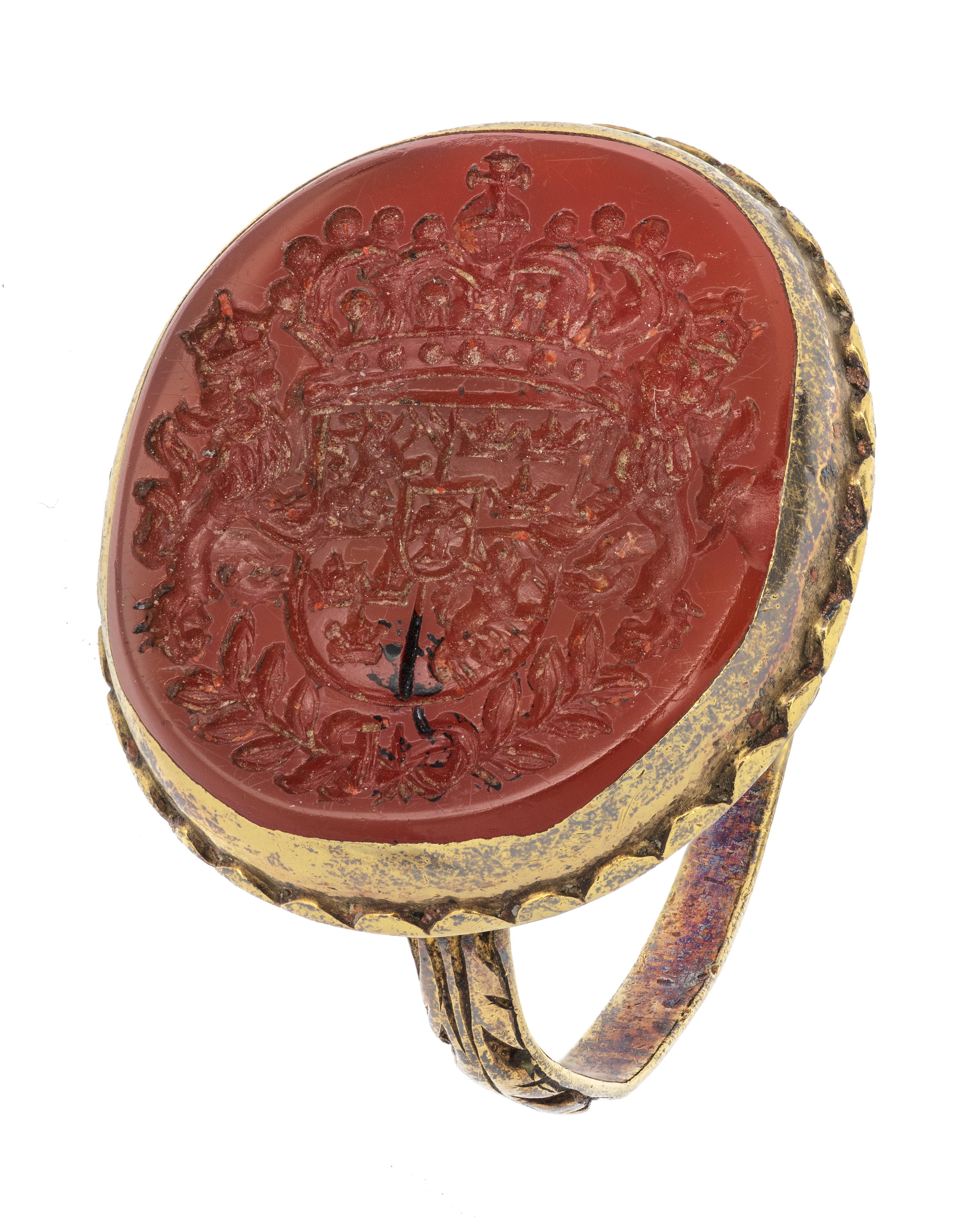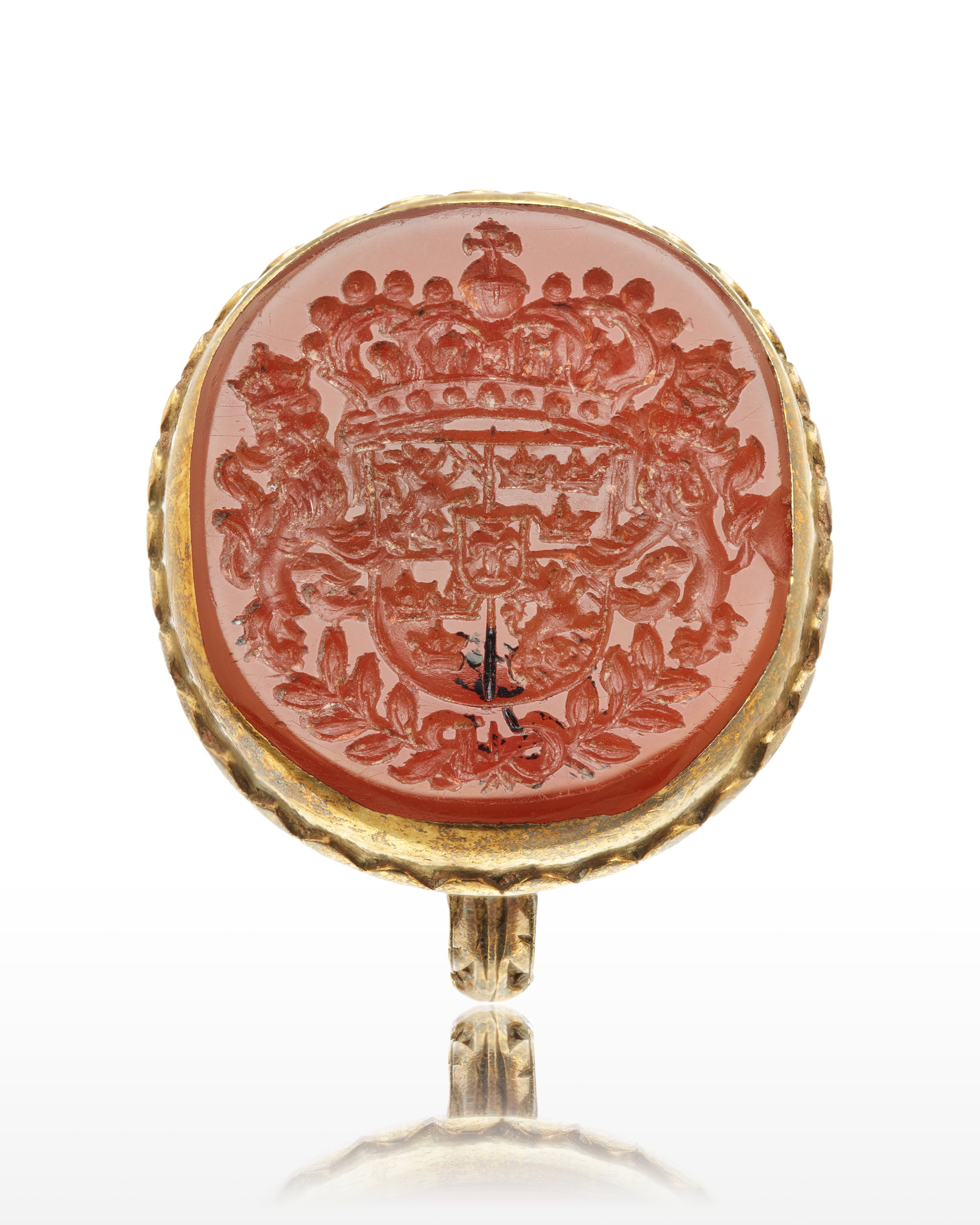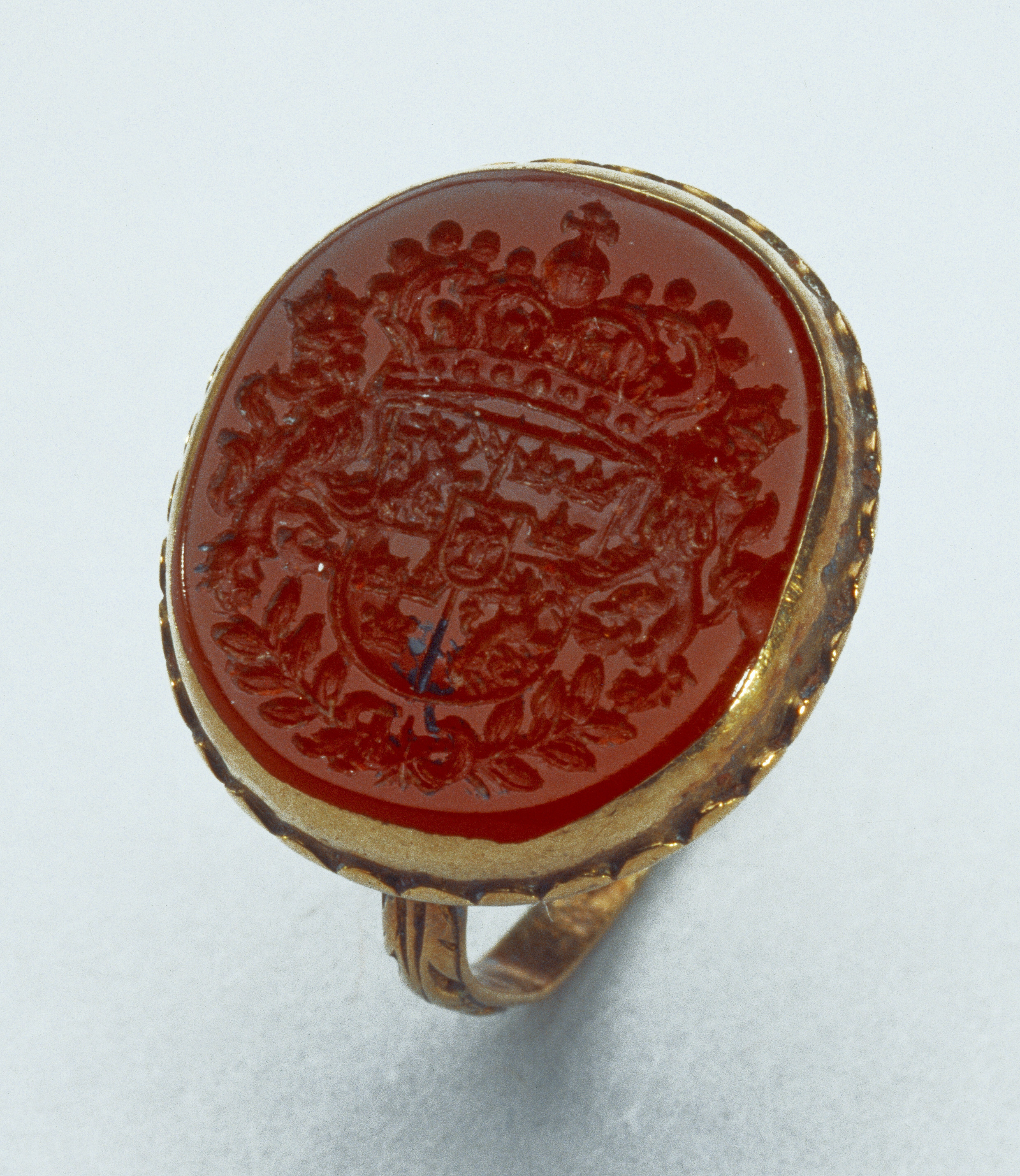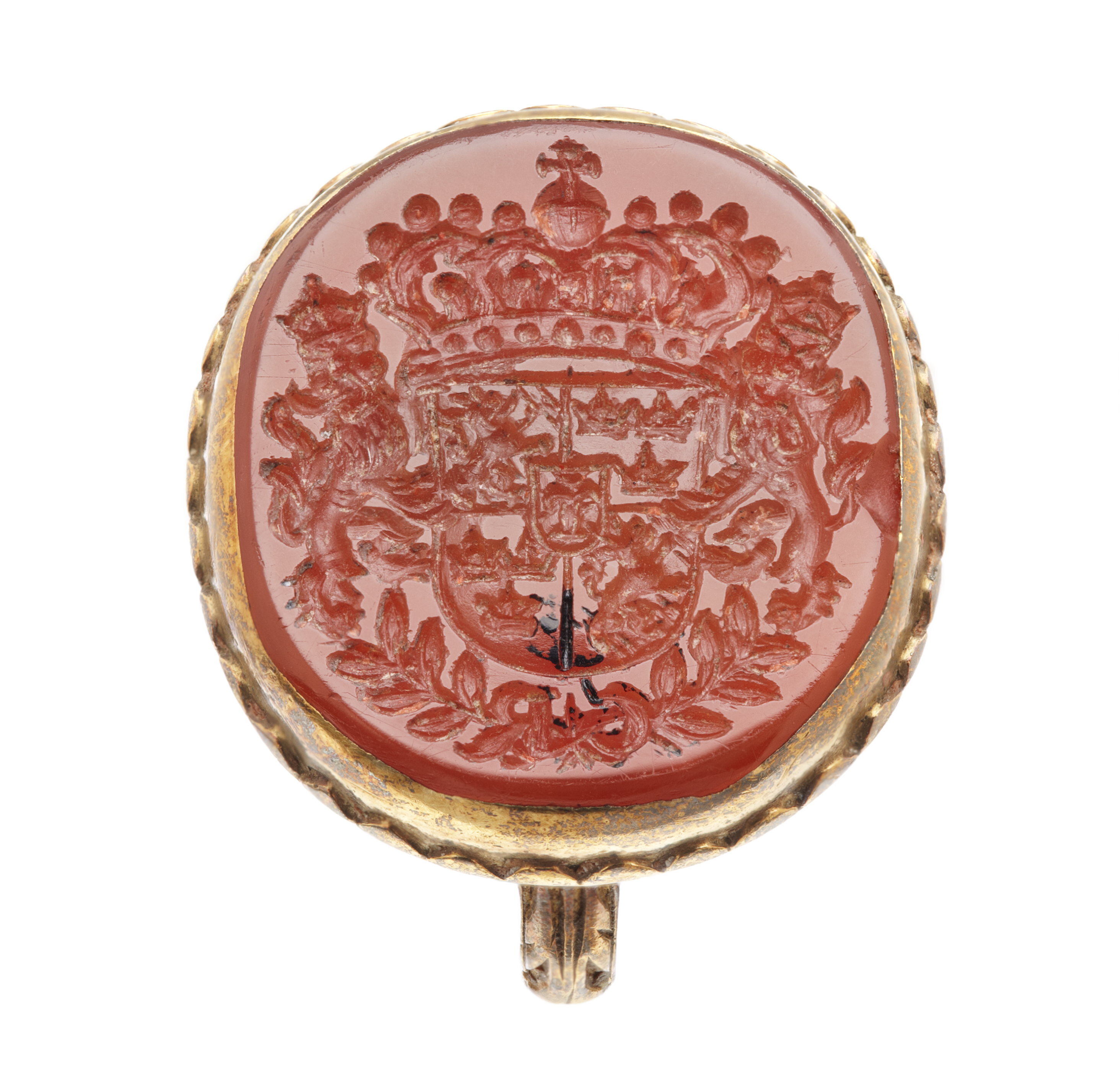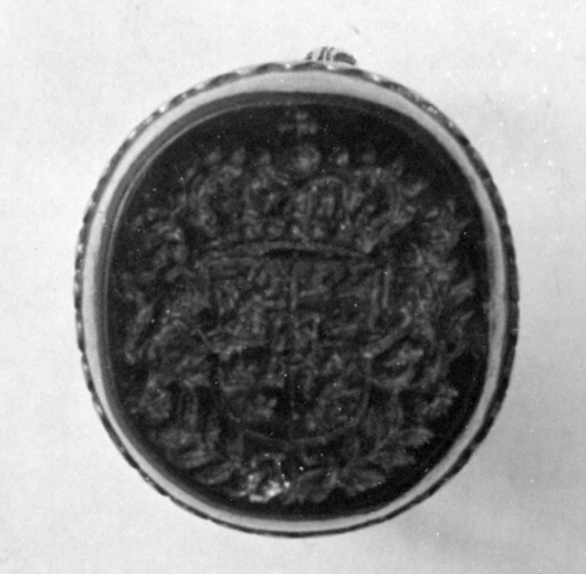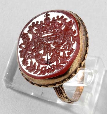 Oval karneol med fasad kant, därpå graverat det svenska riksvapnet under huset Vasa, krönt av kunglig krona, sköldhållare krönta lejon, nertill två korslagda lagerkvistar, därpå C R (Christina Regina). Slät fattning av guld med vågformig kantdekor nertill på tvären skålad undersida av silver, fasad kant med emaljdekor i form av turkosblå stavar motsvarande vågorna på övre fasen, vita punkter nertill. Deformerad tunn guldring med graverad bladdekor på övre halvan. Nedtill i mitten, över lagerkvistarna, ses rest av svart lack.