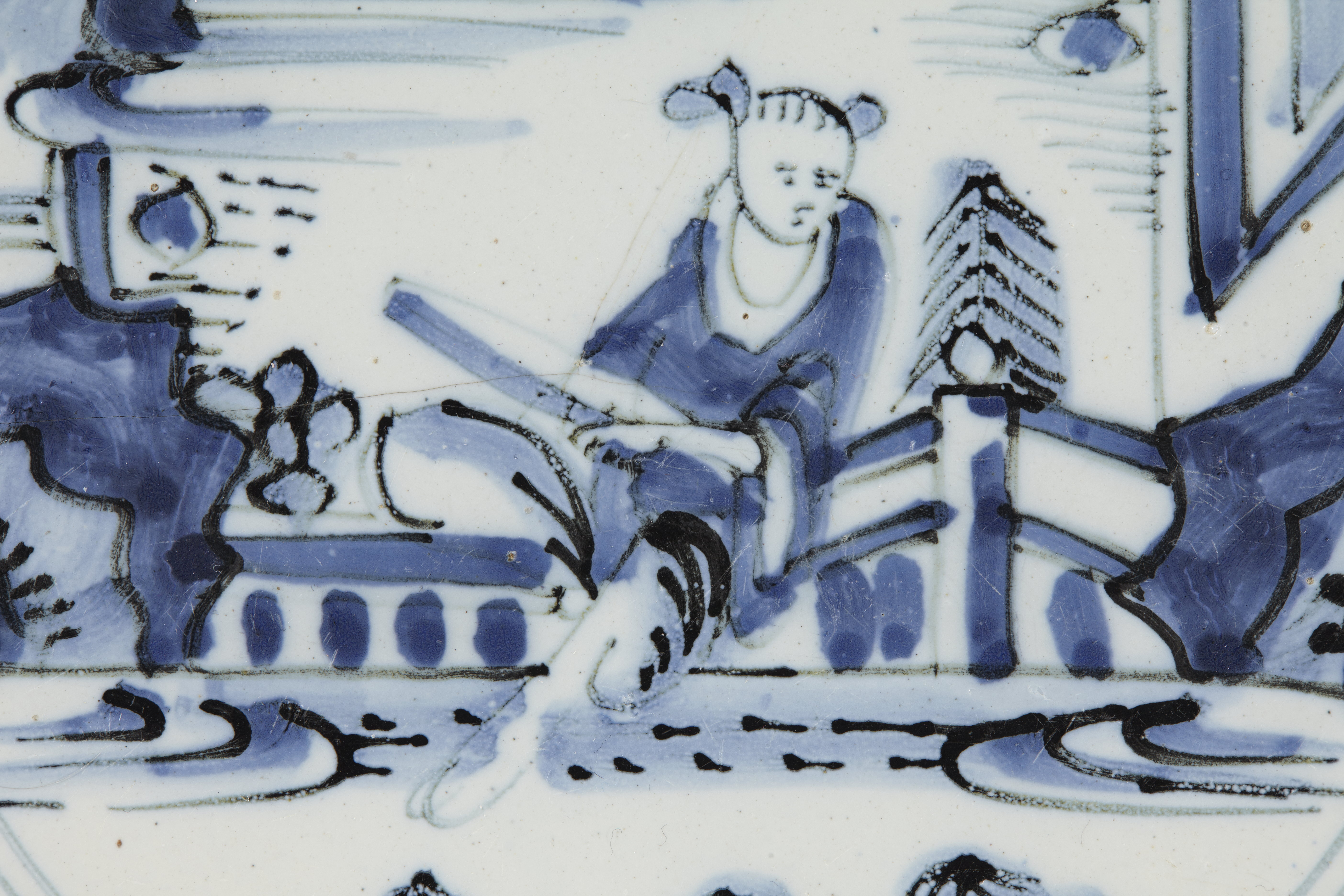 Blå kinesiserande underglasyrmålning, delvis konturerad med svart. I spegeln landskap, på brättet fält med figurer och stiliserade blommor. På brättets undersida enkel dekor i blått, cirklar och stjärnor skilda åt av streck. Märkt i blå underglasyrmålning, triangel. Delft, 1600-talets senare hälft.