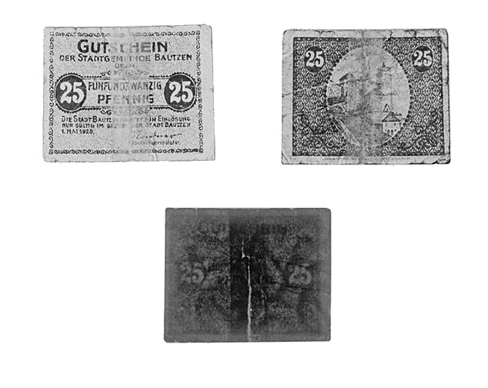 25 PFENNING Maj 1920. Vit. Framsida: Undertryck i rött; otydtligt nätmönster, längs kanterna längdgående ränder. Baksida: Tryck i blått; rektangulärt fält med botten i rosettmönster, i mitten en utspard stående oval medaljong inom pärlrand, i medaljongen en borg(Ortenburg?). Vattenmärke: se Planschverket. Mått: Längd: 50 mm.; bredd: 40 mm.
