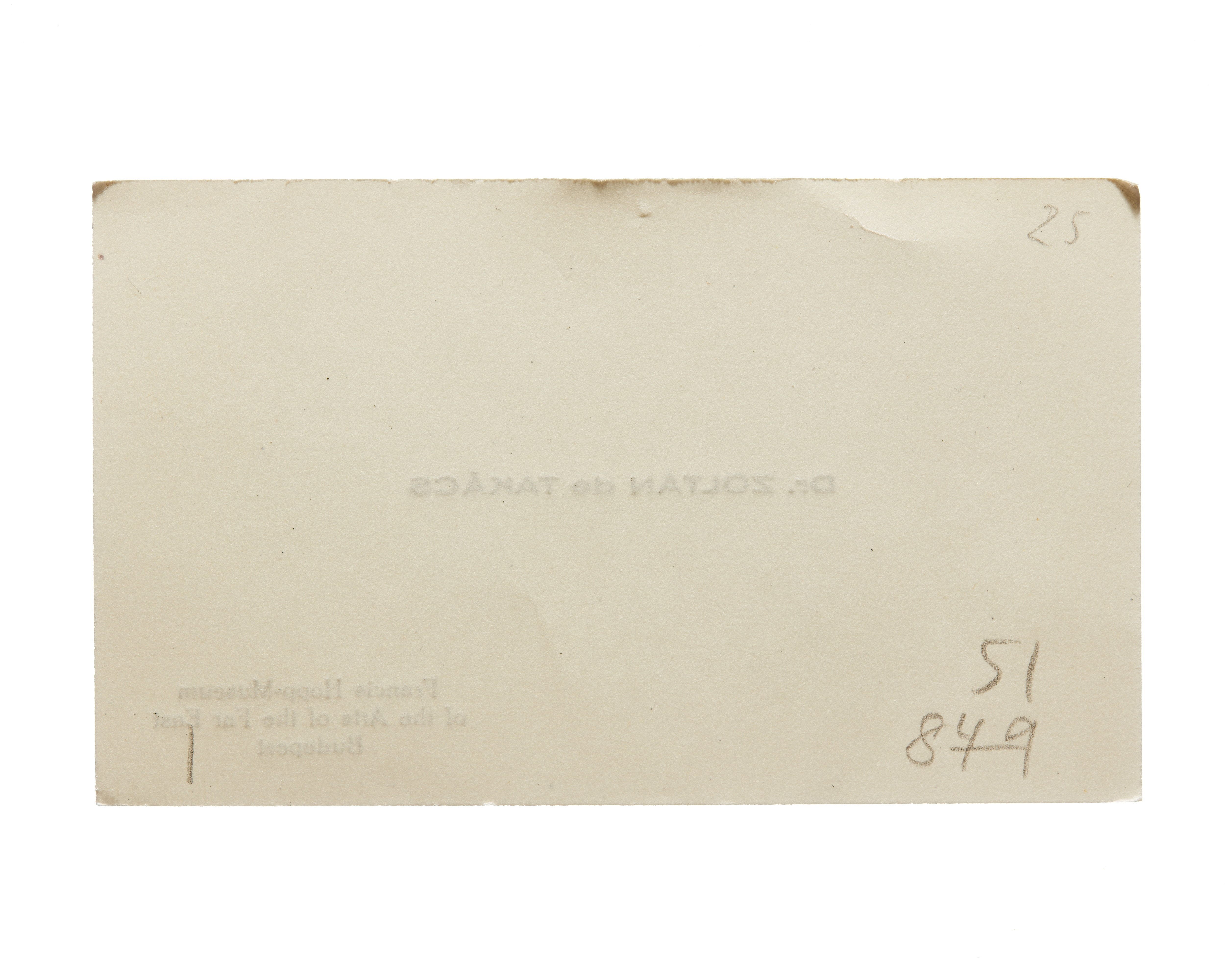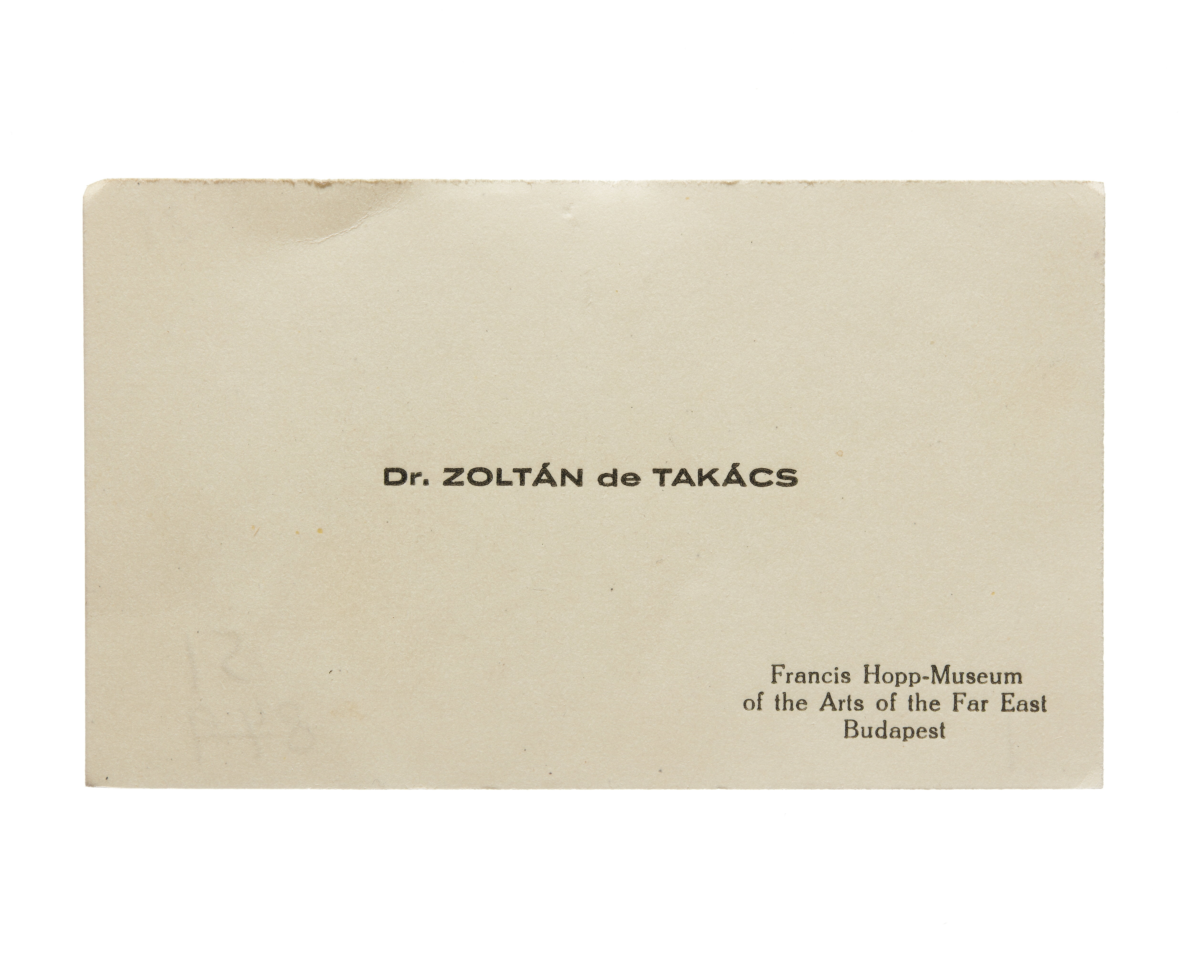 Ett visitkort från Dr. Zoltan de Takacs, daterat 1925. Adress (nedre högra hörnet) Francis Hopp-Museum of the Arts of the Far East Budapest
