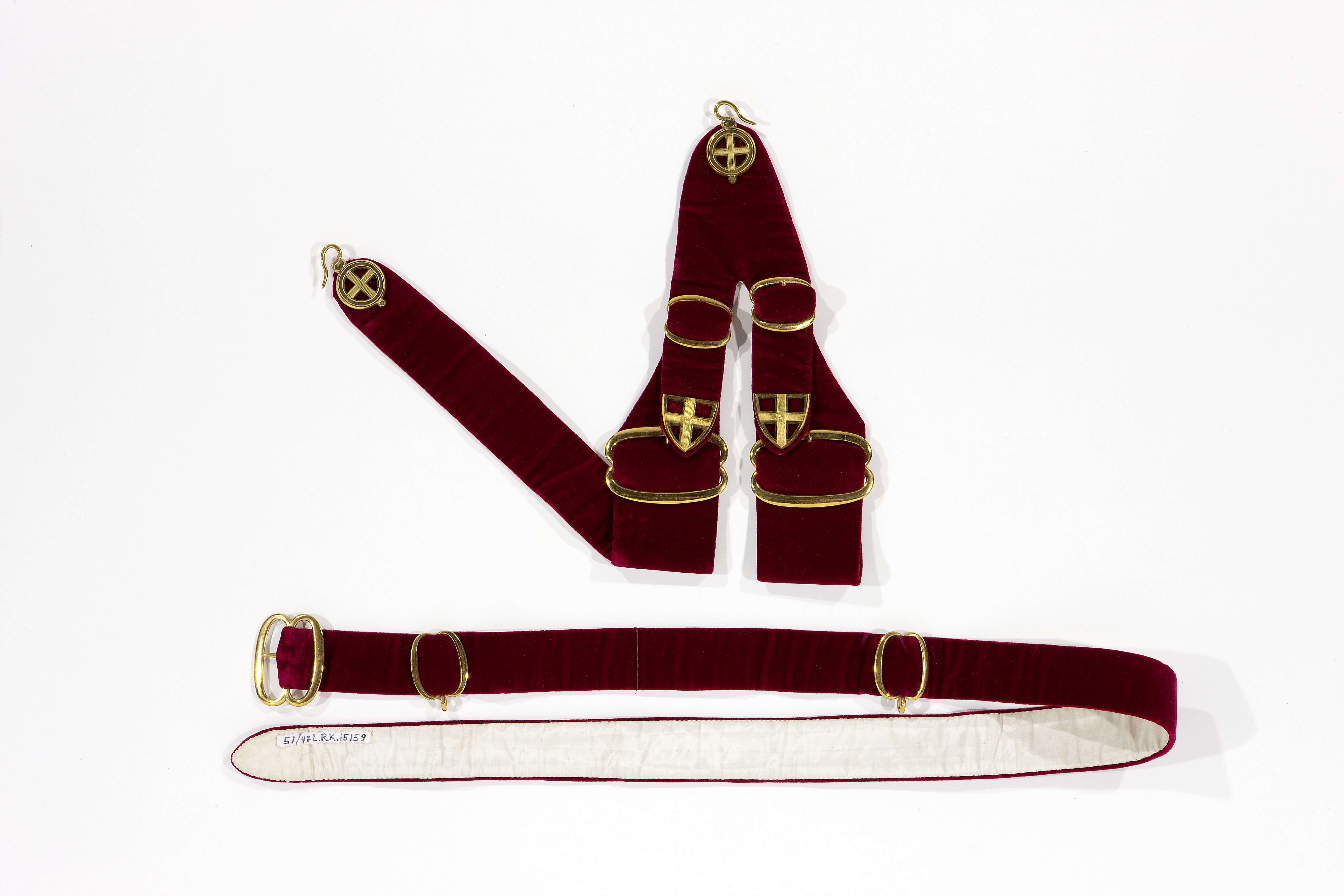 Gehäng av purpurfärgad sammet med beslag av förgylld mässing. Livrem 35 mm bred med sölja i form av två ovaler. Sköldformat ändbeslag med kors. Mitt på två ovaler beslag med små ringar nedtill. I dessa är gehänget fäst med krokar vid runda beslag. Från det bakre ett V-format stycke avslutade med sköldformade ändbeslag. Vid dessa fäst hylsor för värjan. Hela gehänget fodrat med vitt siden. Oscar II erhöll denna värdighet 1881-05-17 av drottning Victoria på slottet i Windsor.
