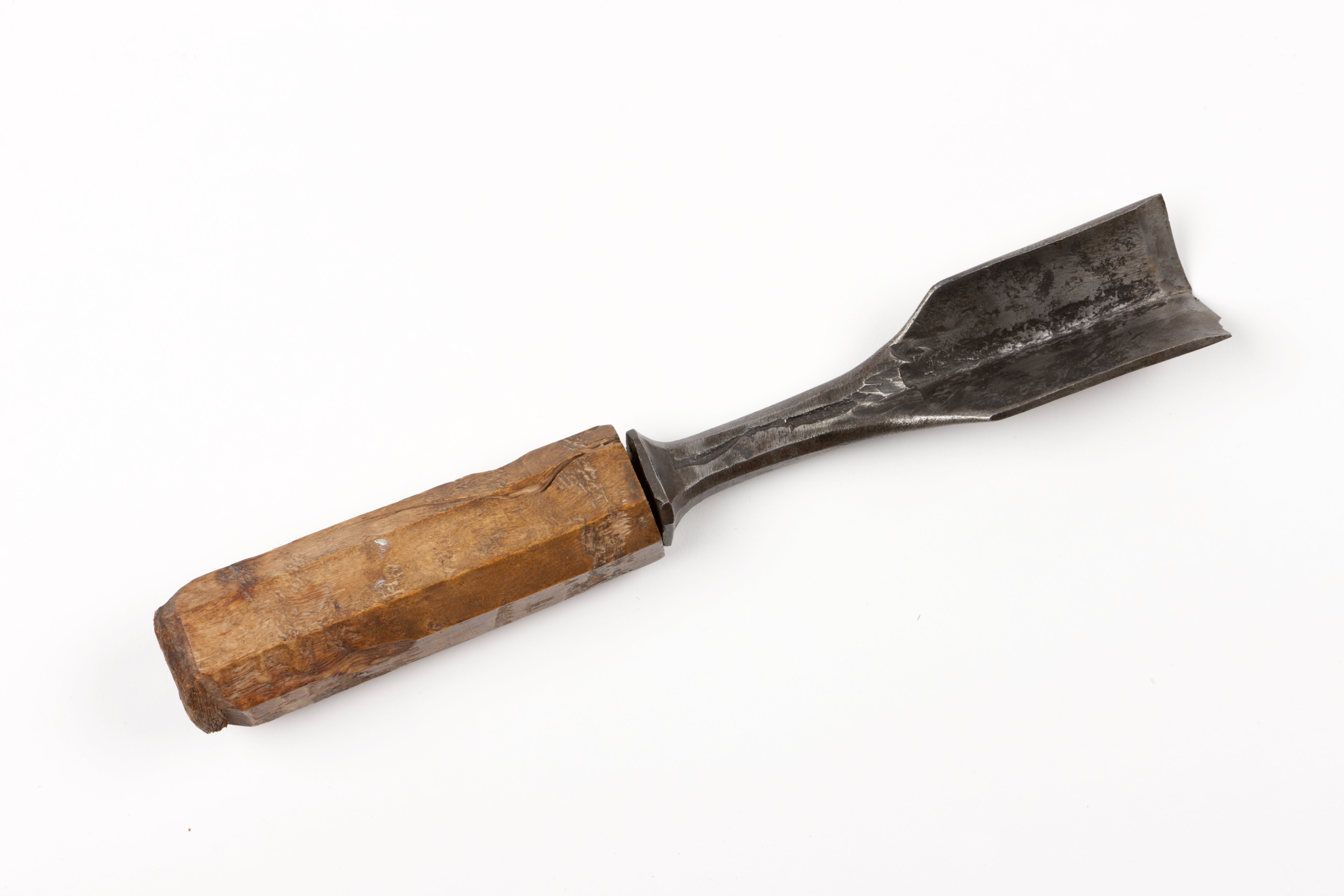 Grovt smidd klinga med åttsidig genomskärning, i änden platt och böjd mitt på i stålets längdriktning i rak vinkel. Främre egg. Vidgad bas. Skuret, åttsidigt skaft av masurbjörk.